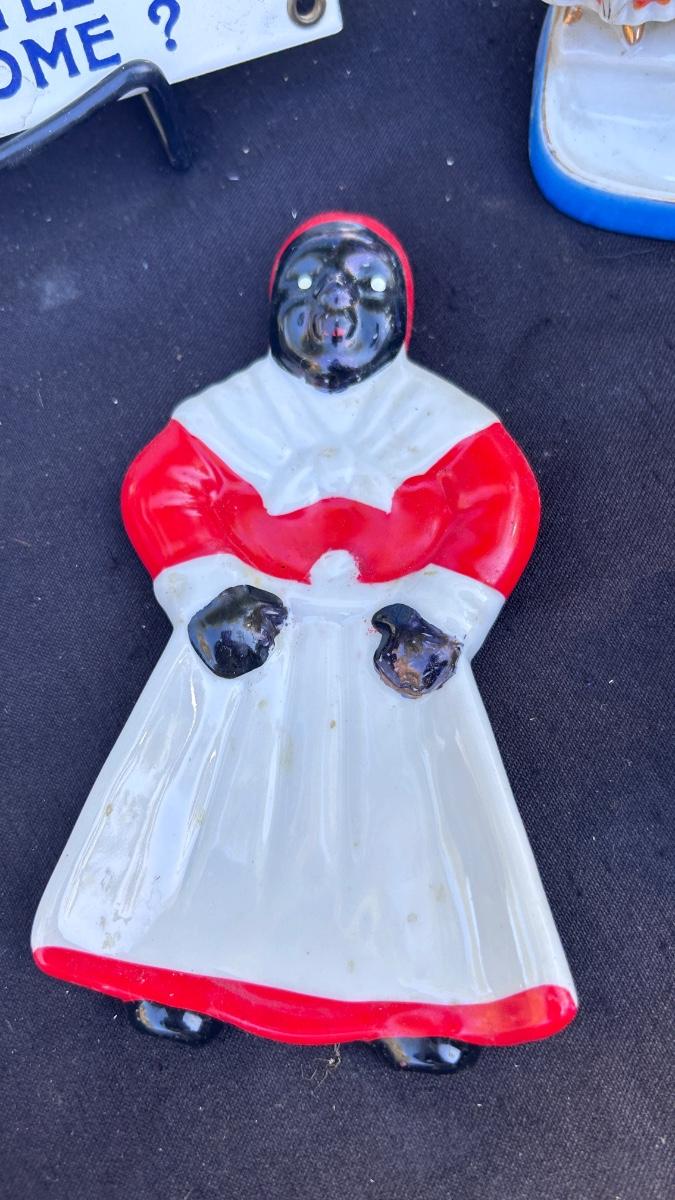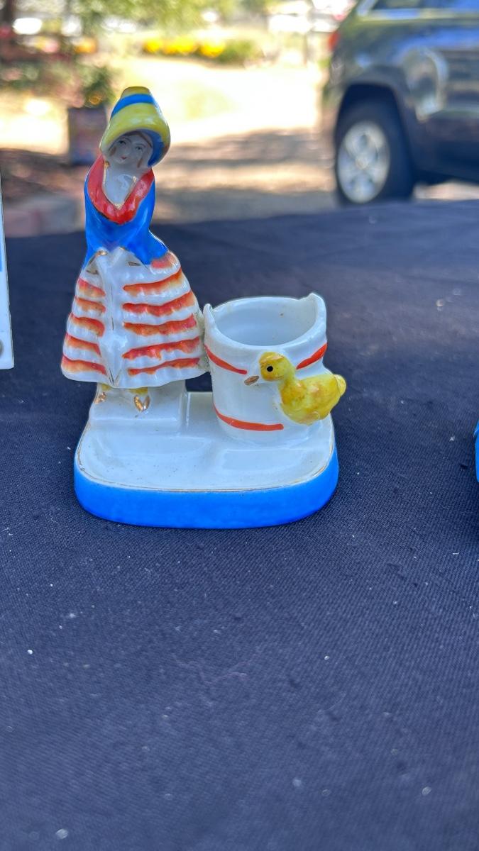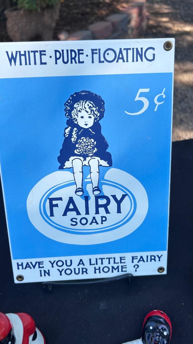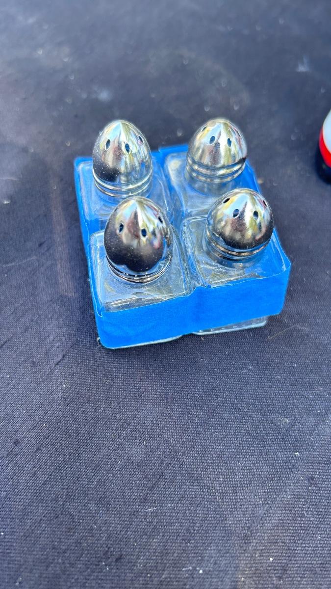 VINTAGE SALT AND PEPPER SHAKERS, TOOTHPICK HOLDERS, AND TIN SIGN