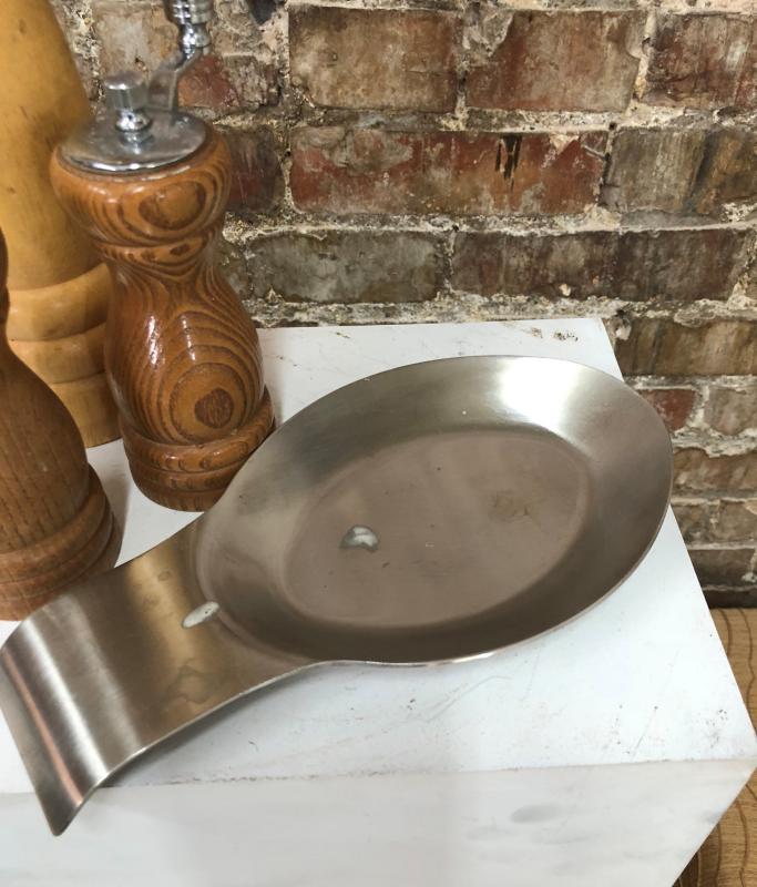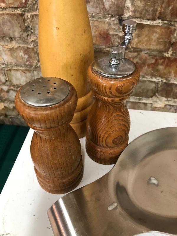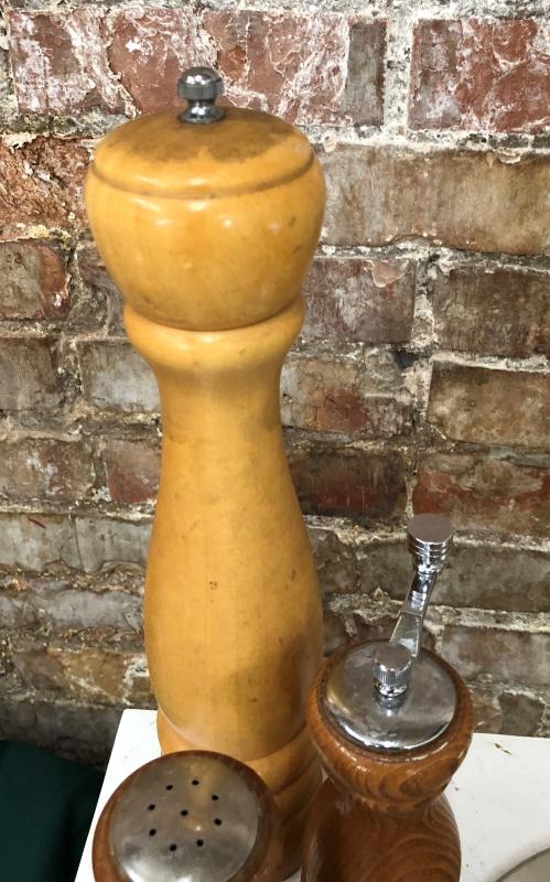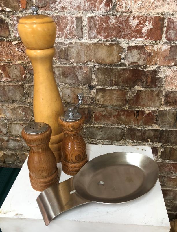 vintage SALT & PEPPER MILLS & c'ontemporary STAINLESS SPOON REST