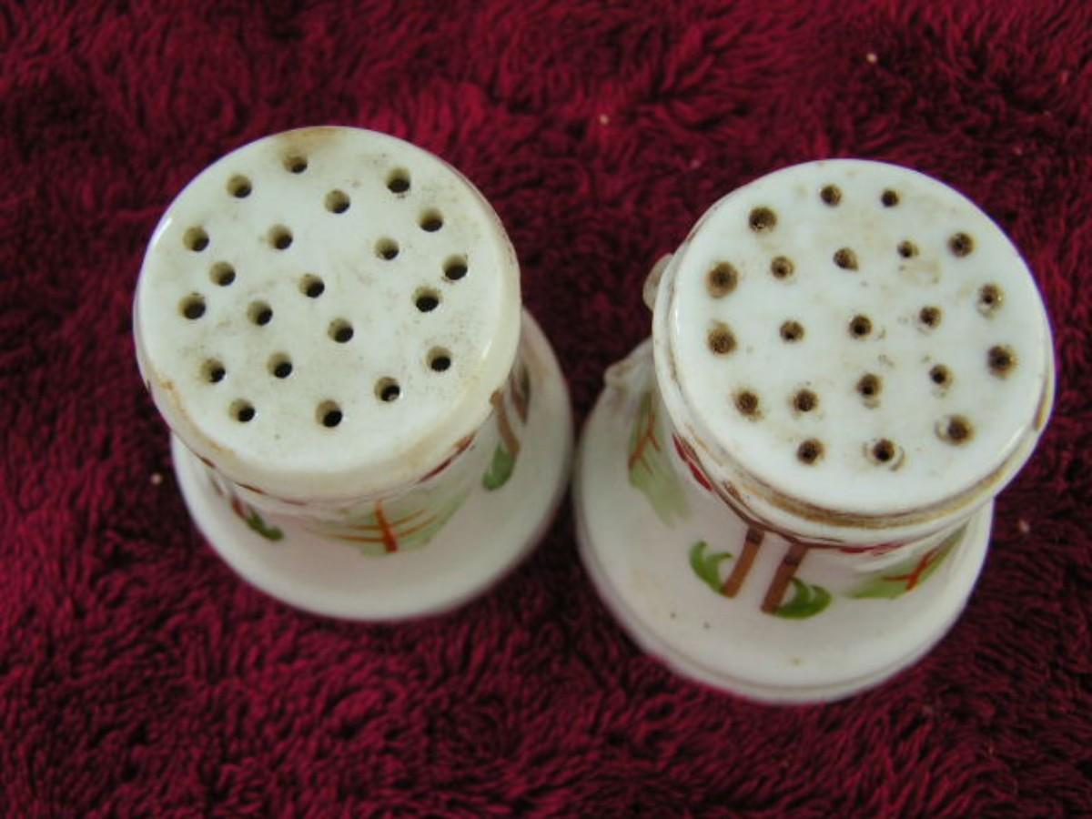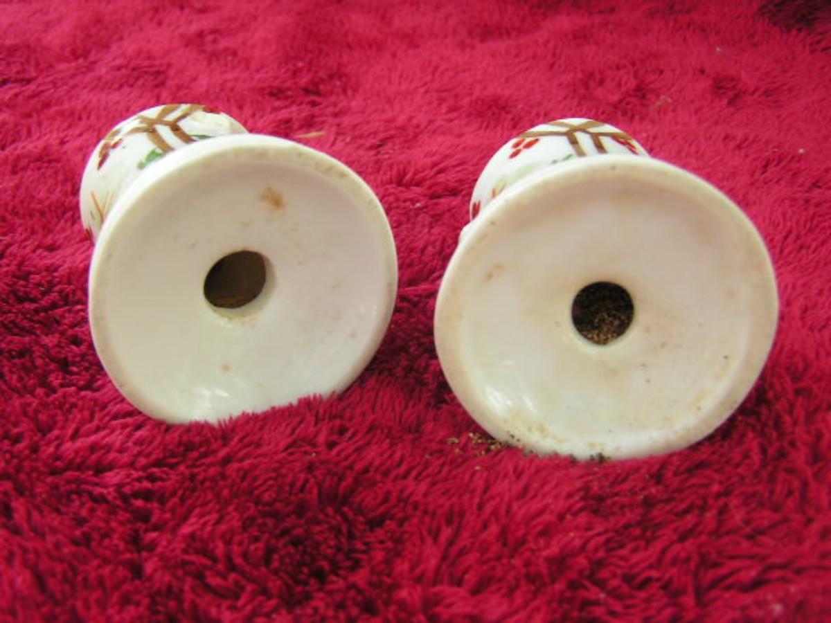 Vintage salt & pepper shaker set. Ceramic, hand painted. Most likely from Japan. NO I.D. Porr condition due to tea cup style handles missing. About 2-1/4" tall.