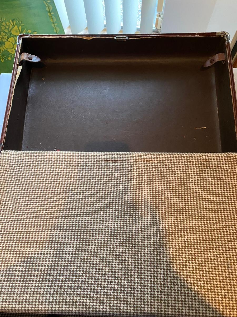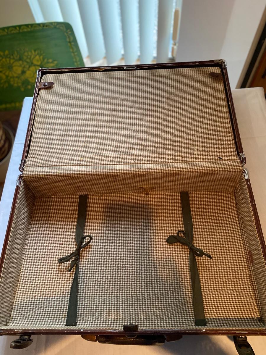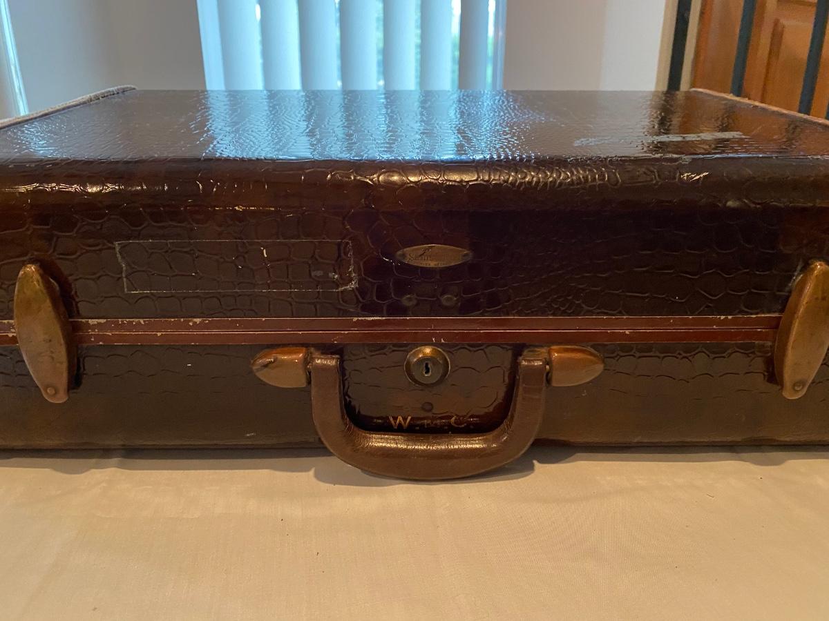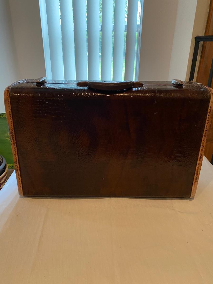 Vintage Samsonite suitcase, reptile w/leather trim, in fair condition. The leather is worn and it’s missing a snap on the inside. Please see pictures. Approx 21-1/2”w x 13-1/4”h.