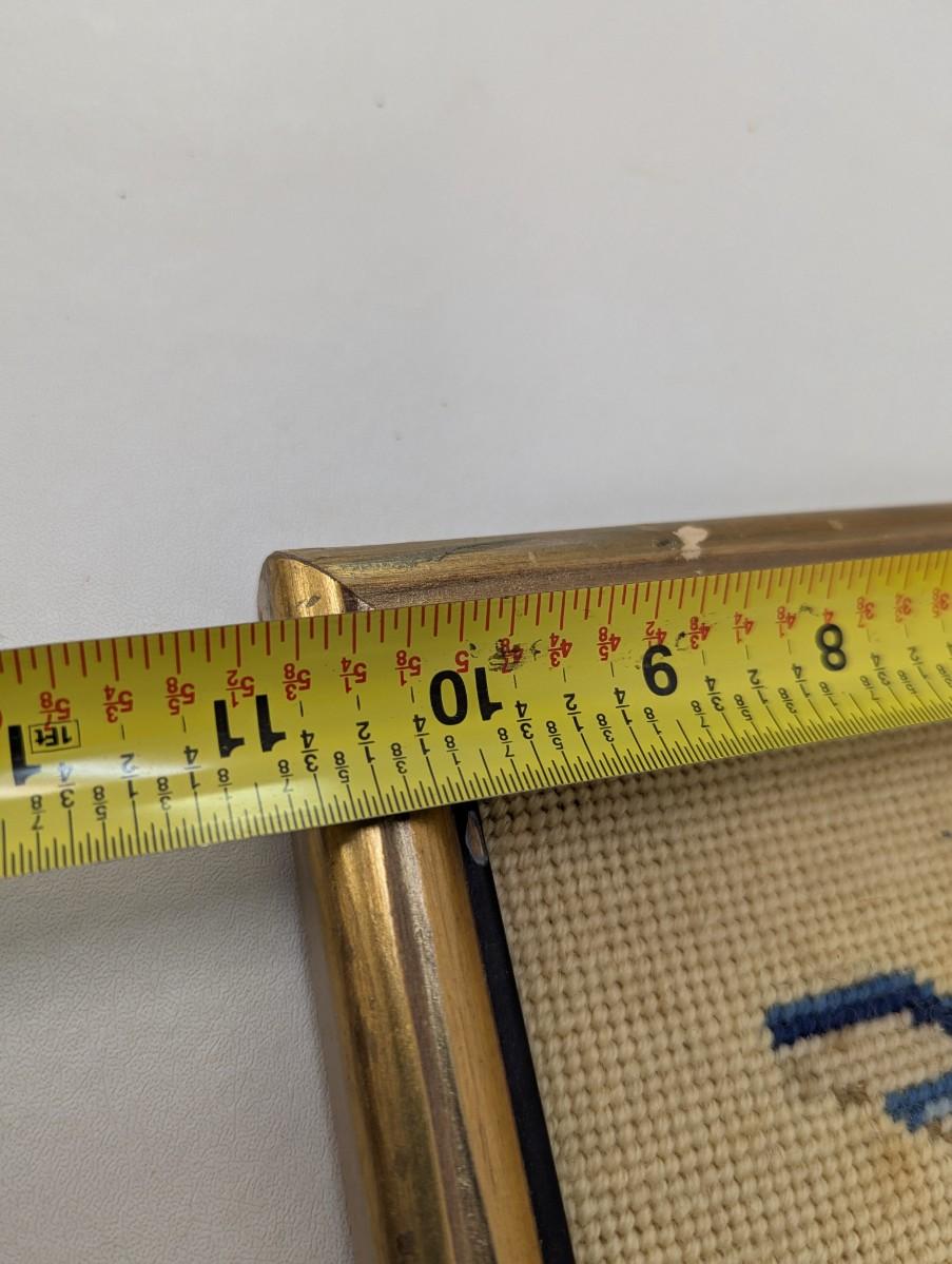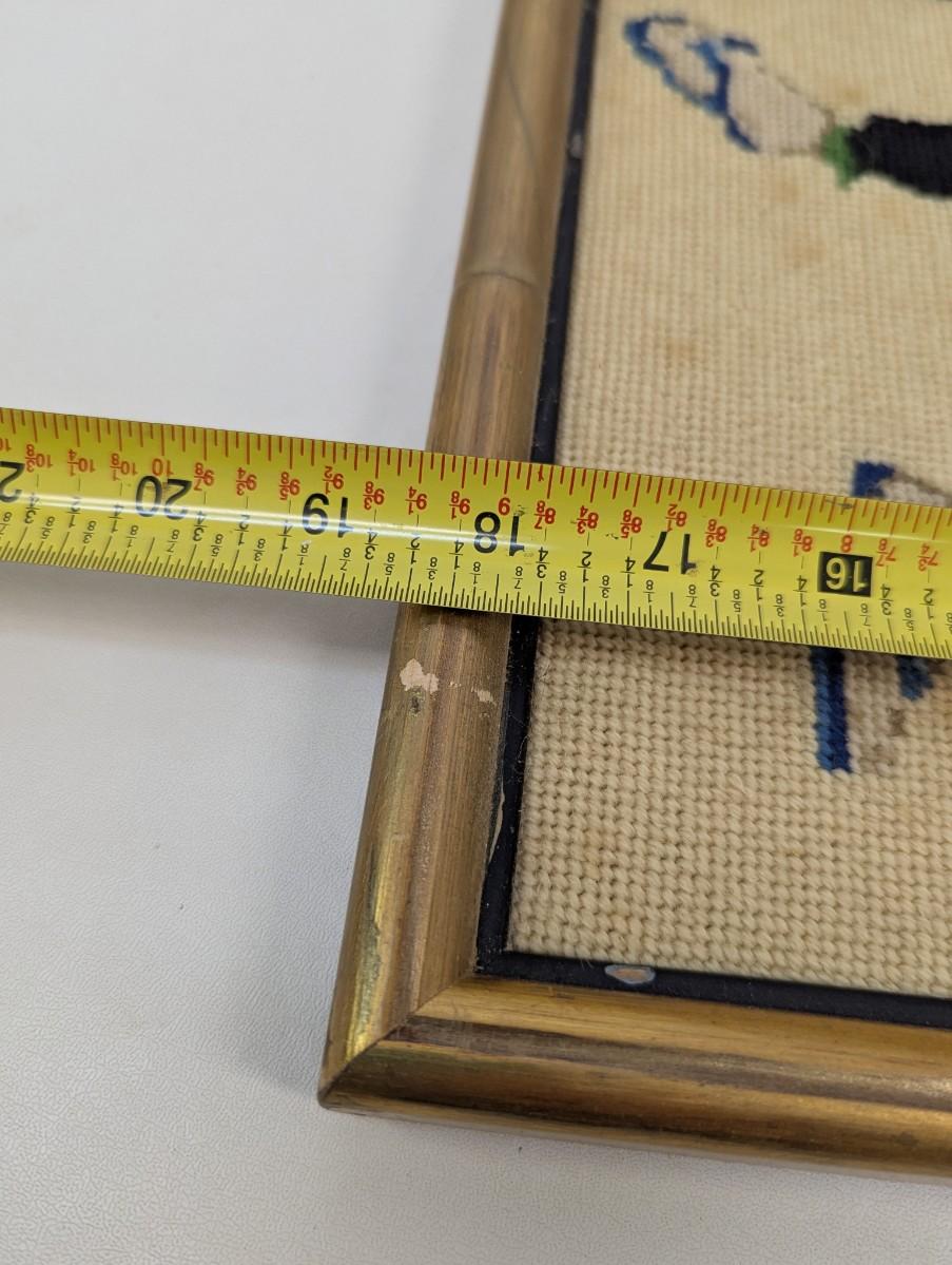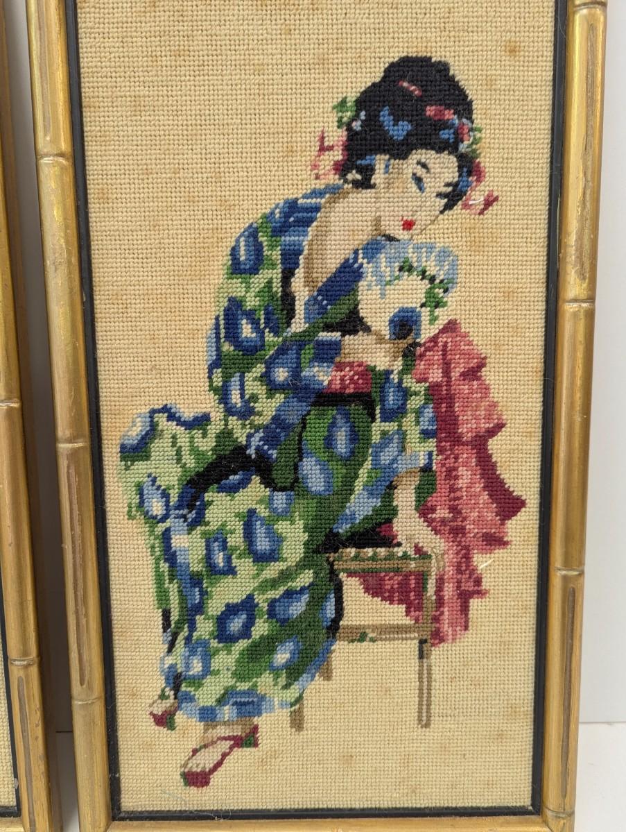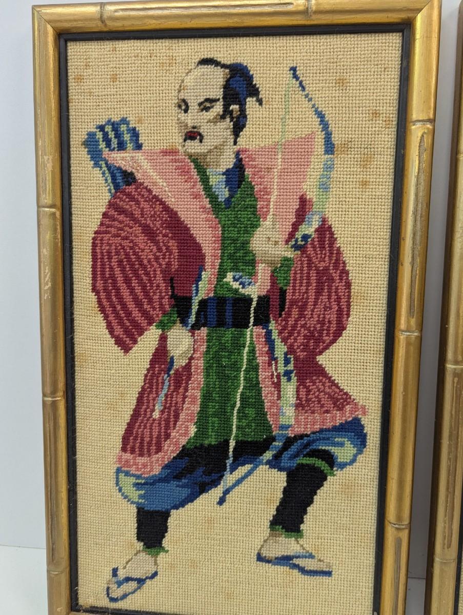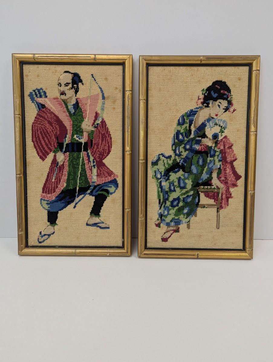 Vintage Samurai Soldier & Geisha Blue Peacock Robe Needlepoint Crewel Framed Bamboo Frame 18 1/2" x 10 1/2"