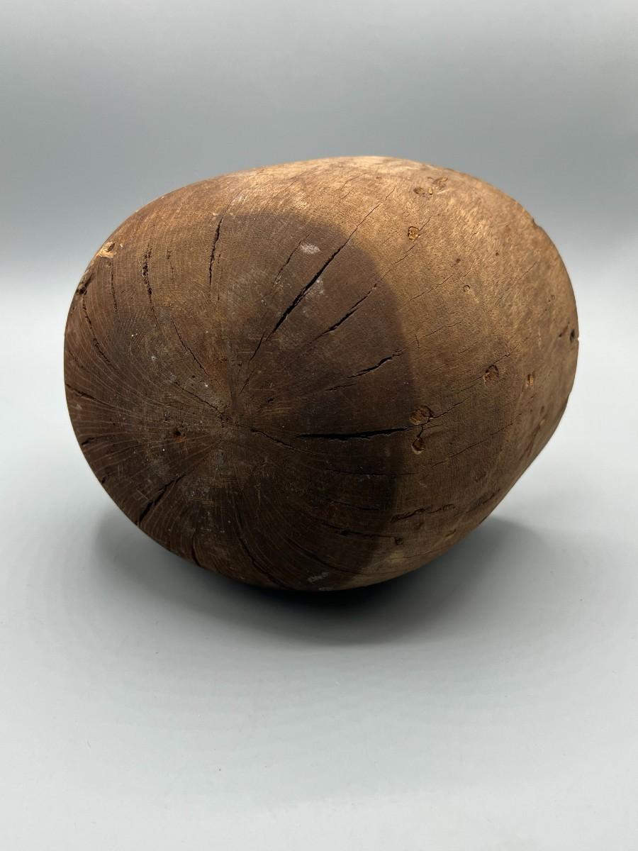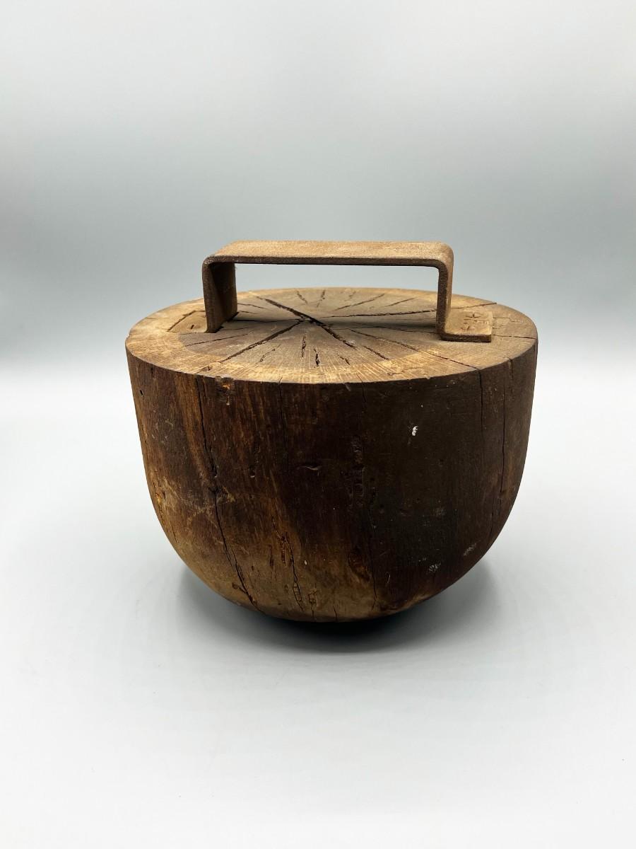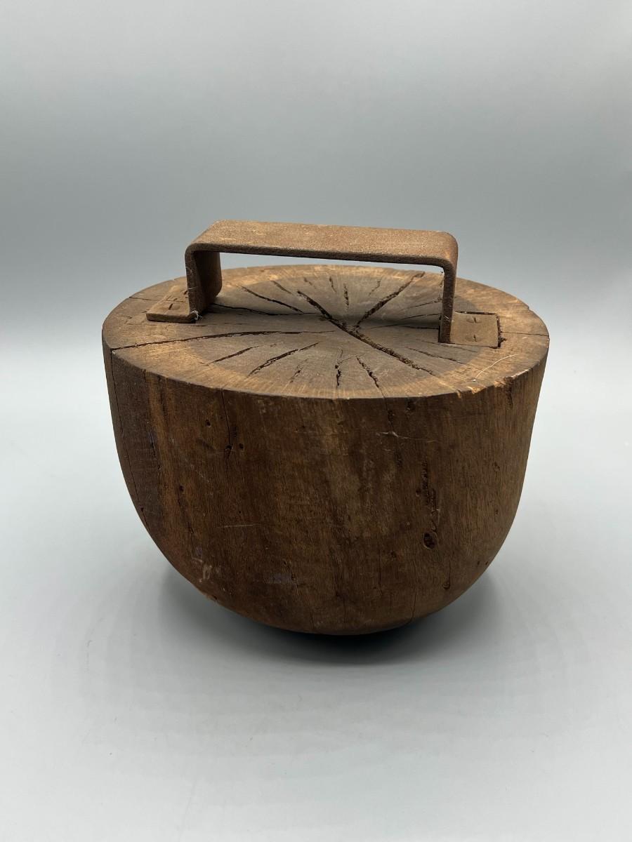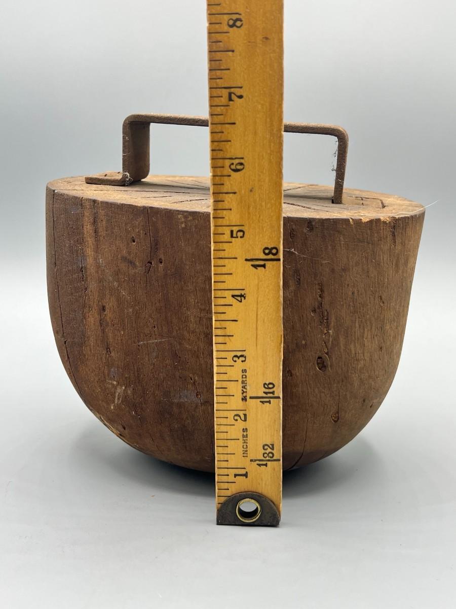 Primitive wood form. Metal handle. Not too sure actual use. Looks like it was either to push and smash something in a bowl or maybe a large strainer of some sort. Could have been used to form things as well. Great for a rustic decor display.