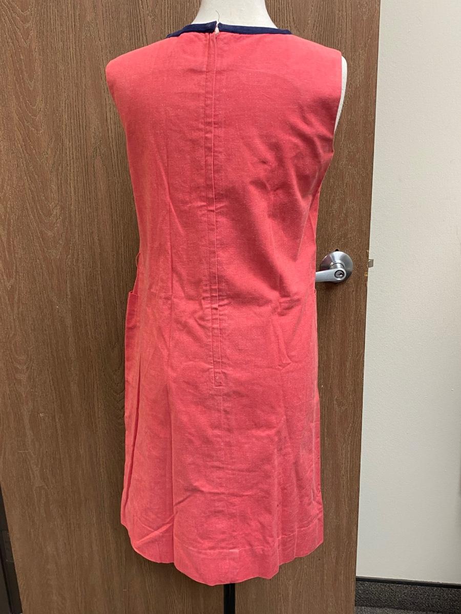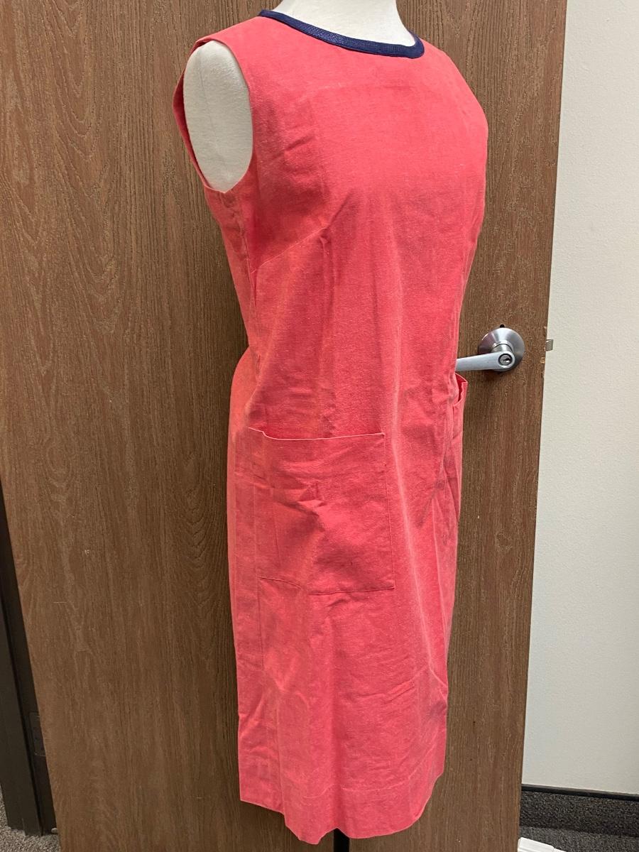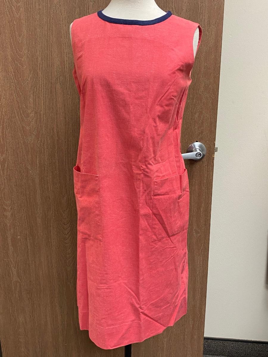 Vintage Sandpipers by Branigans red sleeveless sheath style dress. Zipper back, front pockets, navy blue trim at the neck. Missing belt. Great for dressing up. There is some fade to the red. No holes. No size tag, seems to be a medium/small.