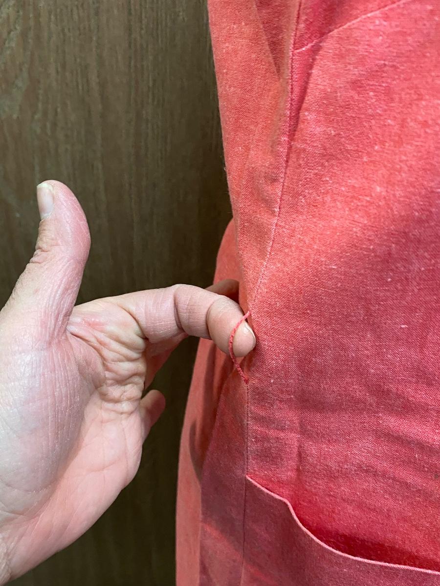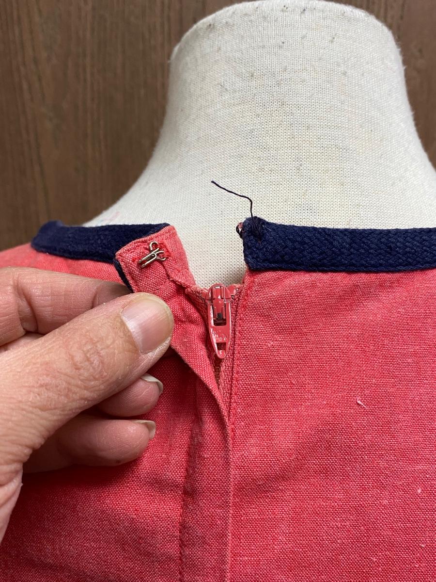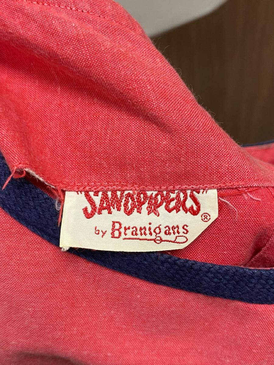 Vintage Sandpipers by Branigans red sleeveless sheath style dress. Zipper back, front pockets, navy blue trim at the neck. Missing belt. Great for dressing up. There is some fade to the red. No holes. No size tag, seems to be a medium/small.