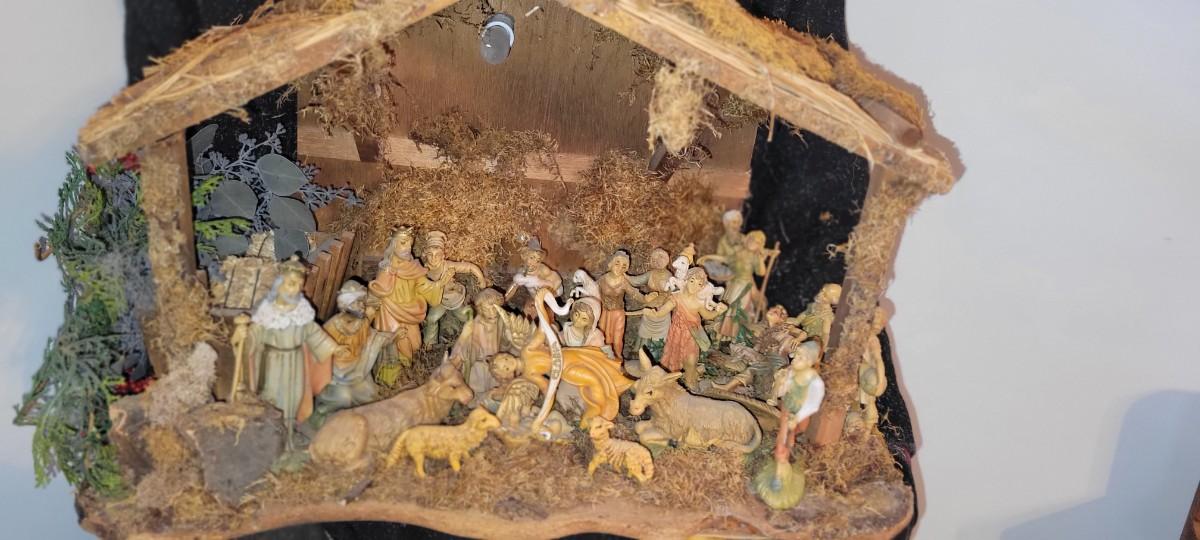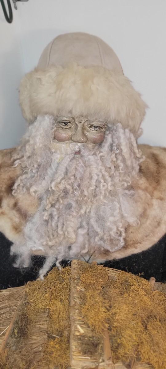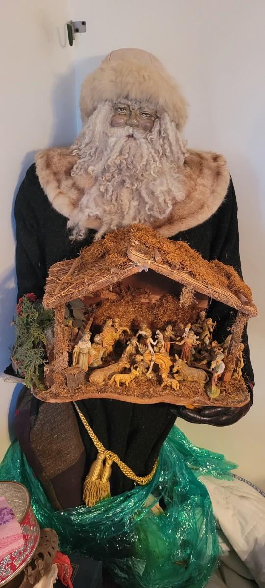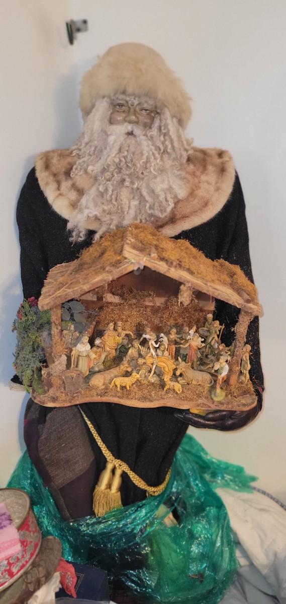 This Santa Claus stands 5' 3" tall. He is vintage. This guy was once displayed at Macy's in NYC. Gloved hands hold a Manger scene.