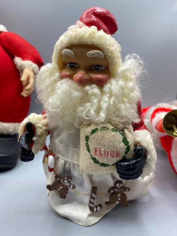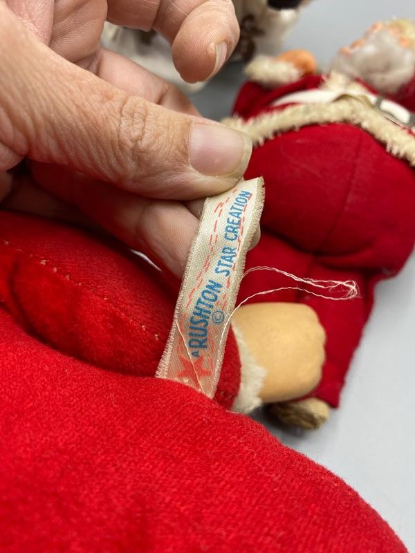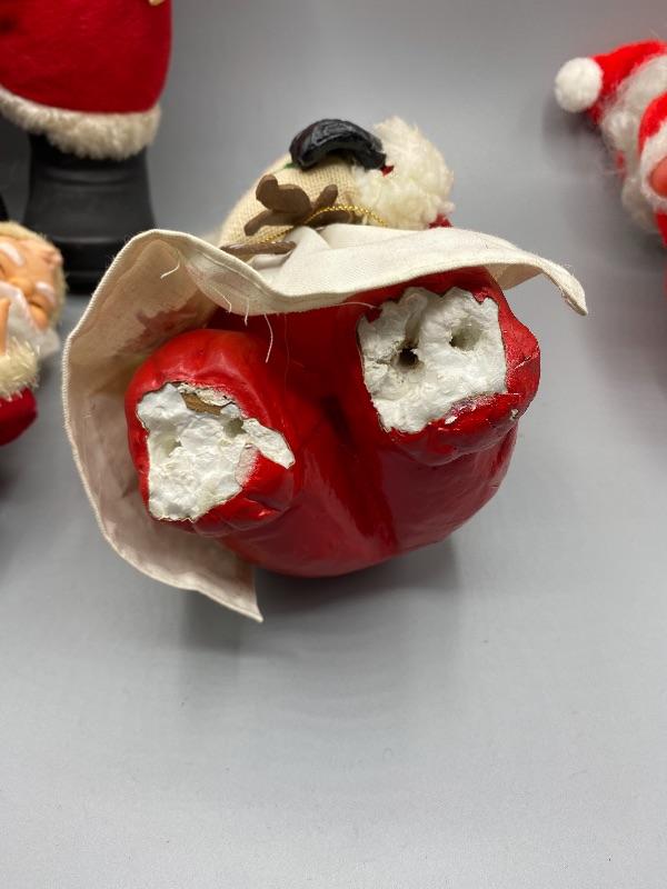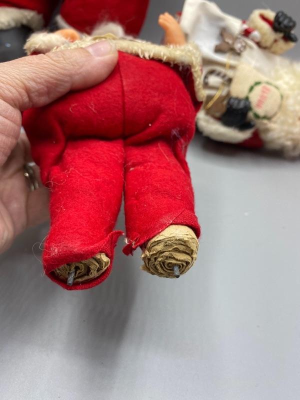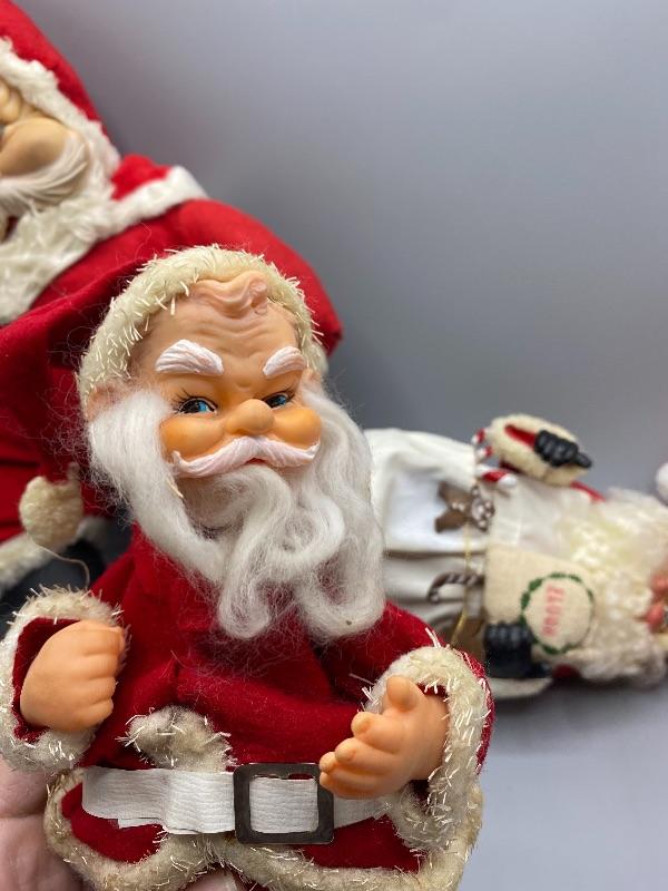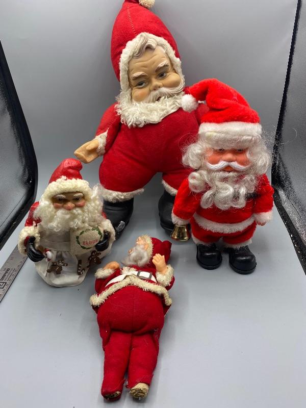 Vintage lot of 4 different Santa Claus dolls. Two are missing part of their legs but could be repurposed. One is a battery operated Santa, rings his bell and moves it looks like. Did not test, but battery terminals look good. Larger Santa plush looks a bit tipsy or tired. He also looks like he should be holding a glass but he actually should be holding a Coke bottle. Needs a little cleaning and a small hole in arm stitched. Made by The Rushton Company, soft body with rubber face, hands, and boots.
