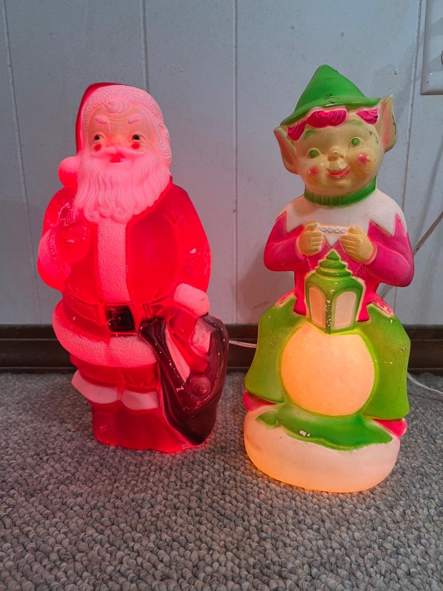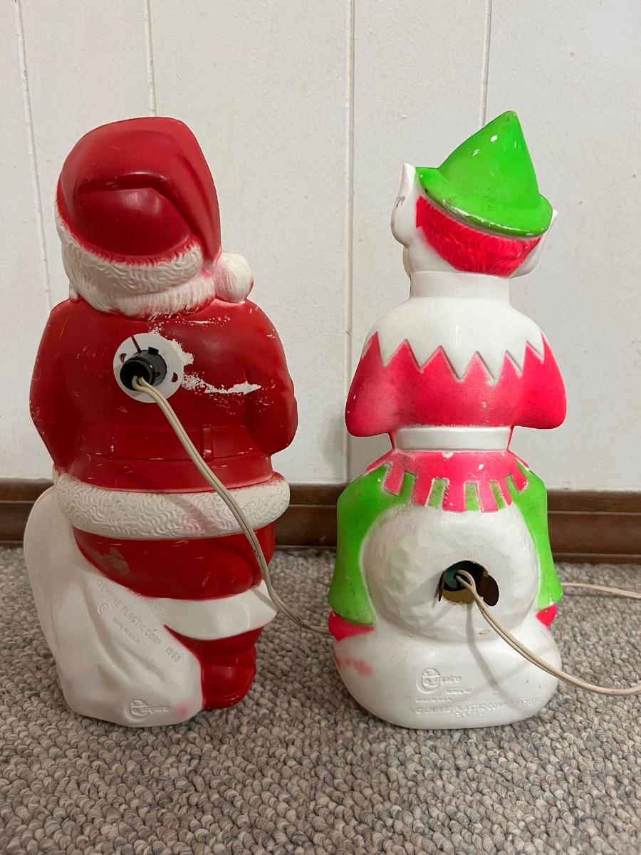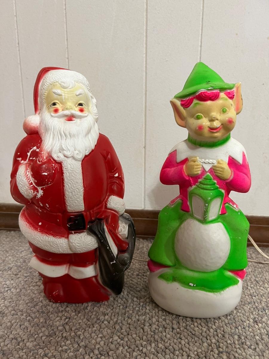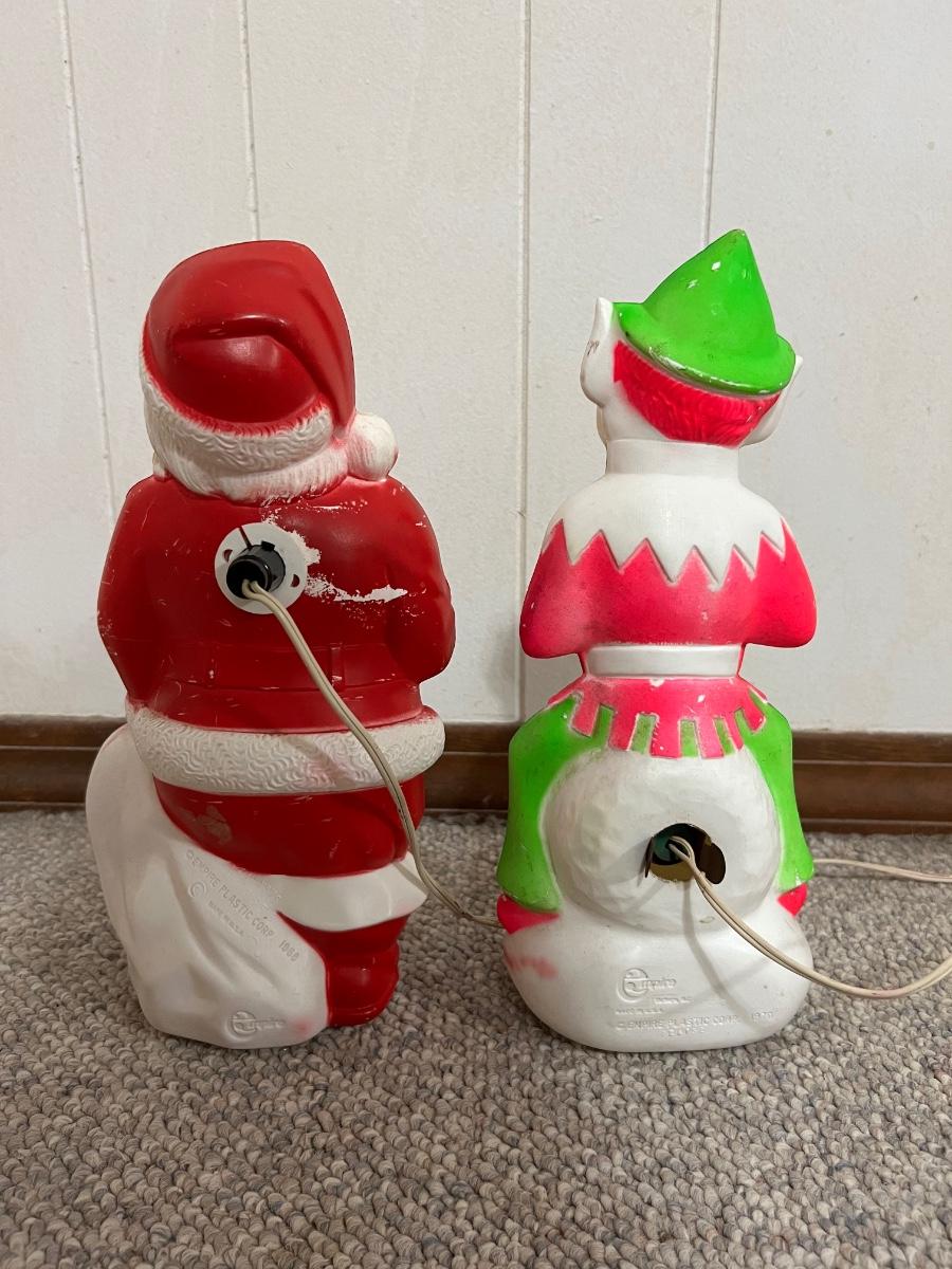 PAIR Vintage Santa 1988 and Vintage Elf 1970 Plastic Christmas Decor. Both light up. Measures 13 inches tall.