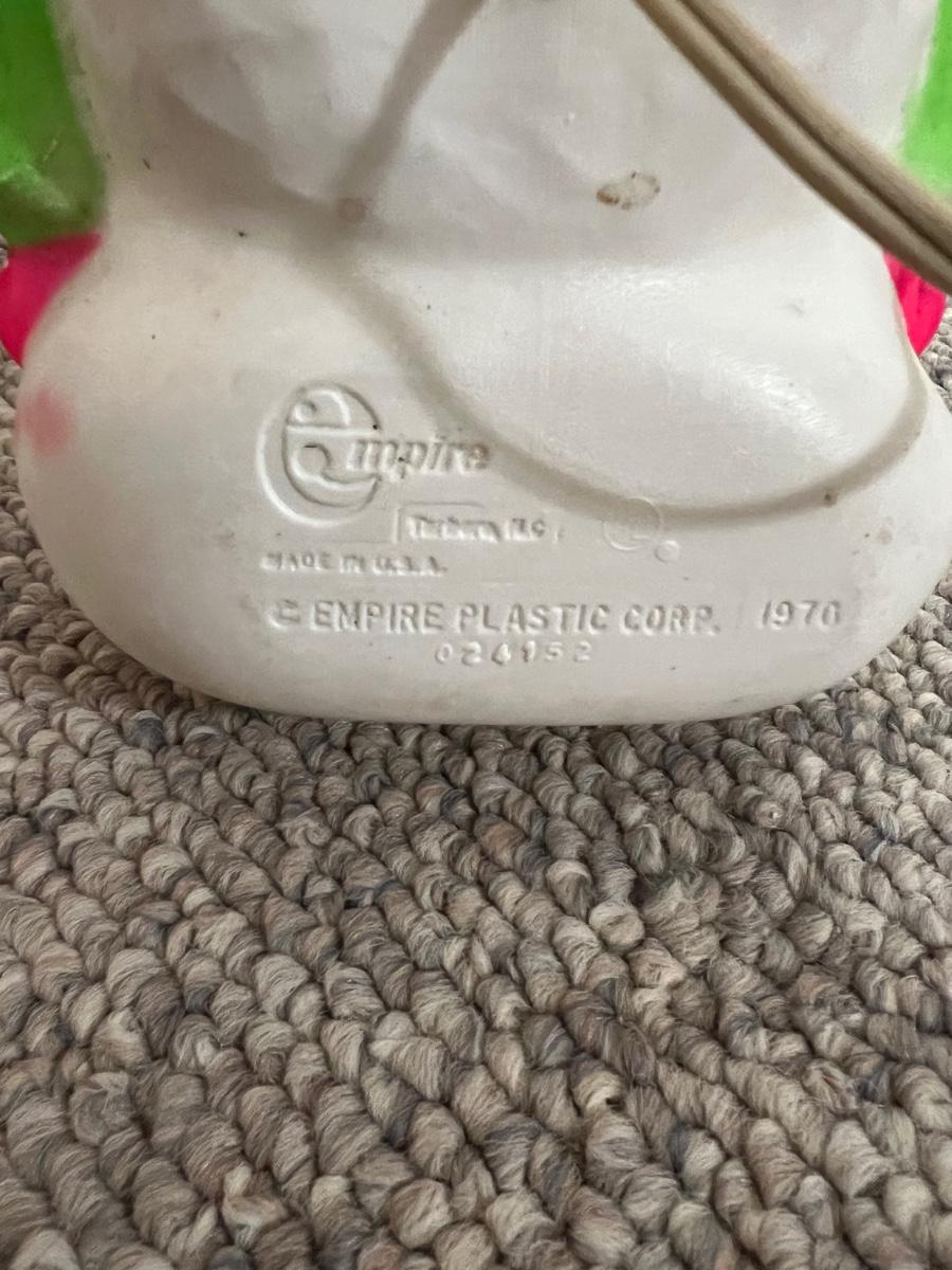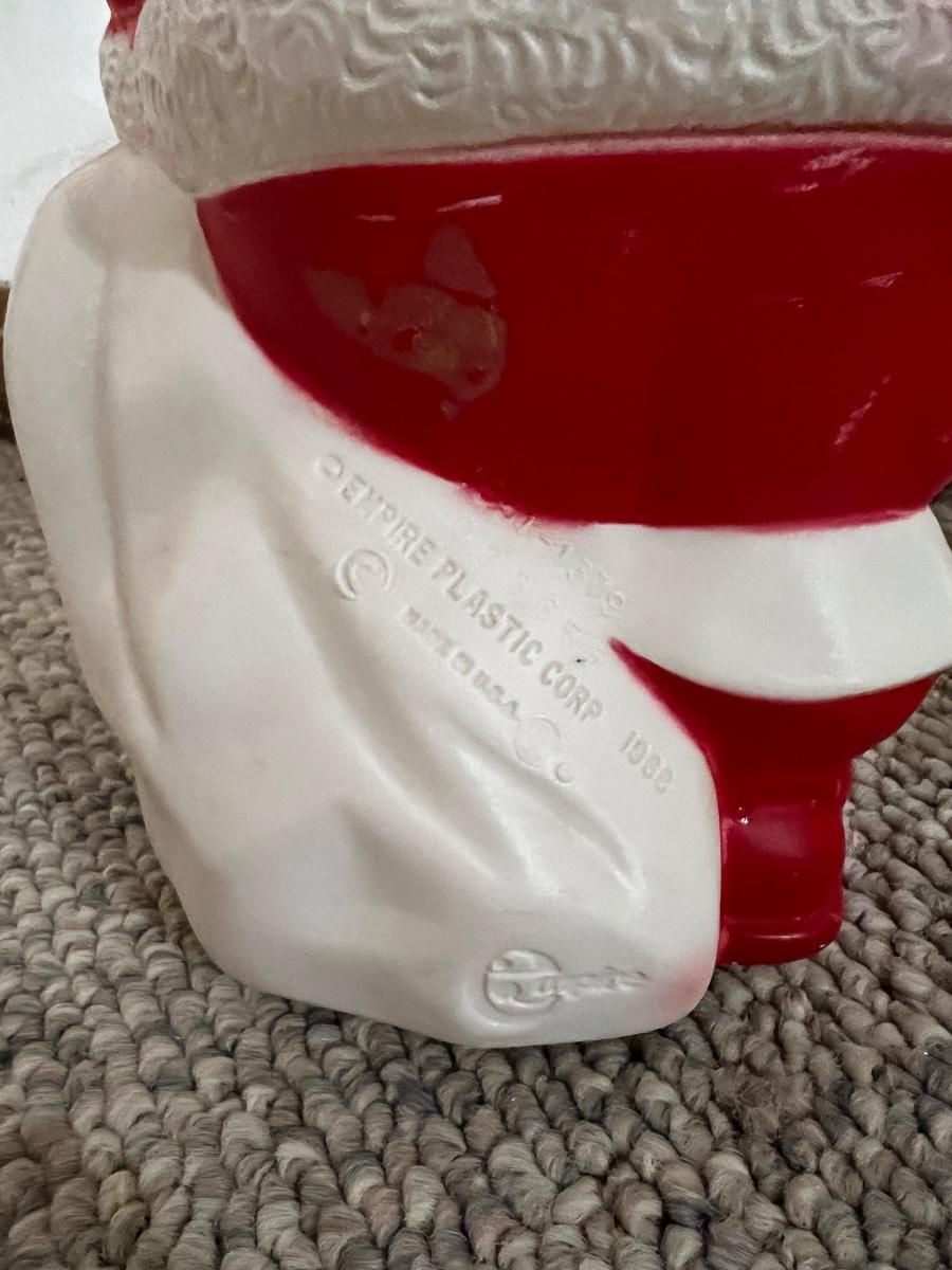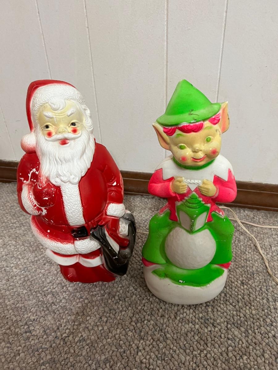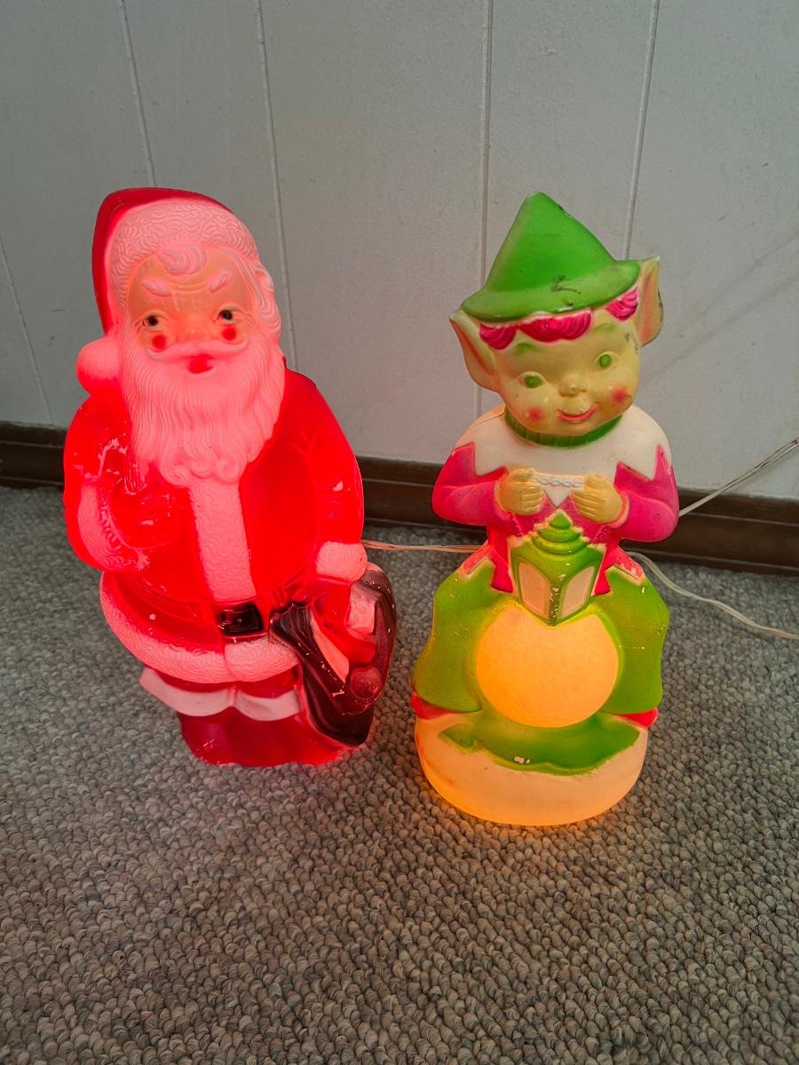 PAIR Vintage Santa 1988 and Vintage Elf 1970 Plastic Christmas Decor. Both light up. Measures 13 inches tall.
