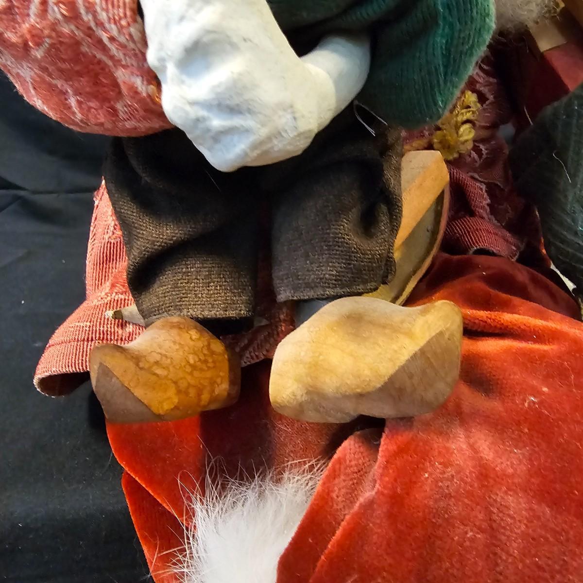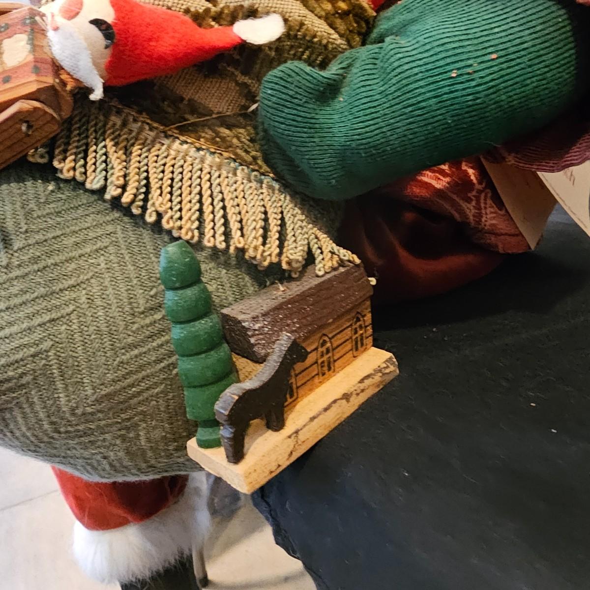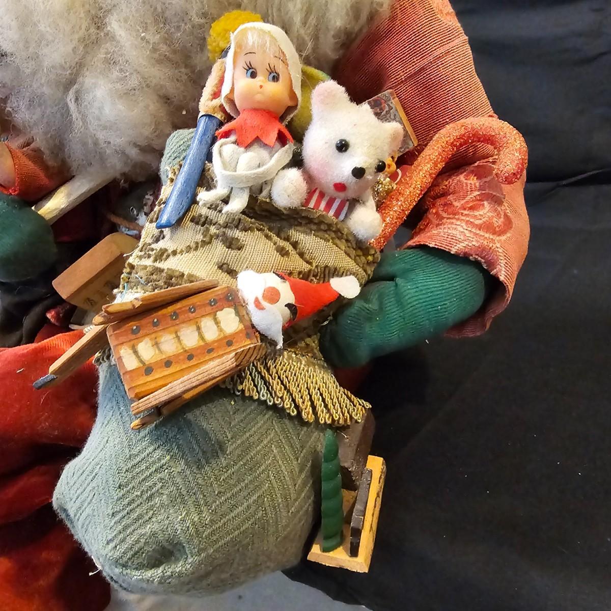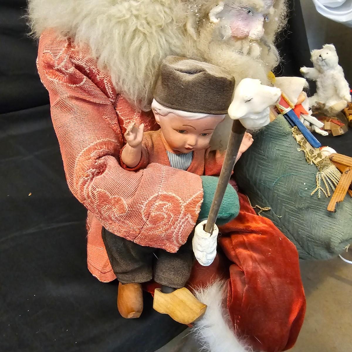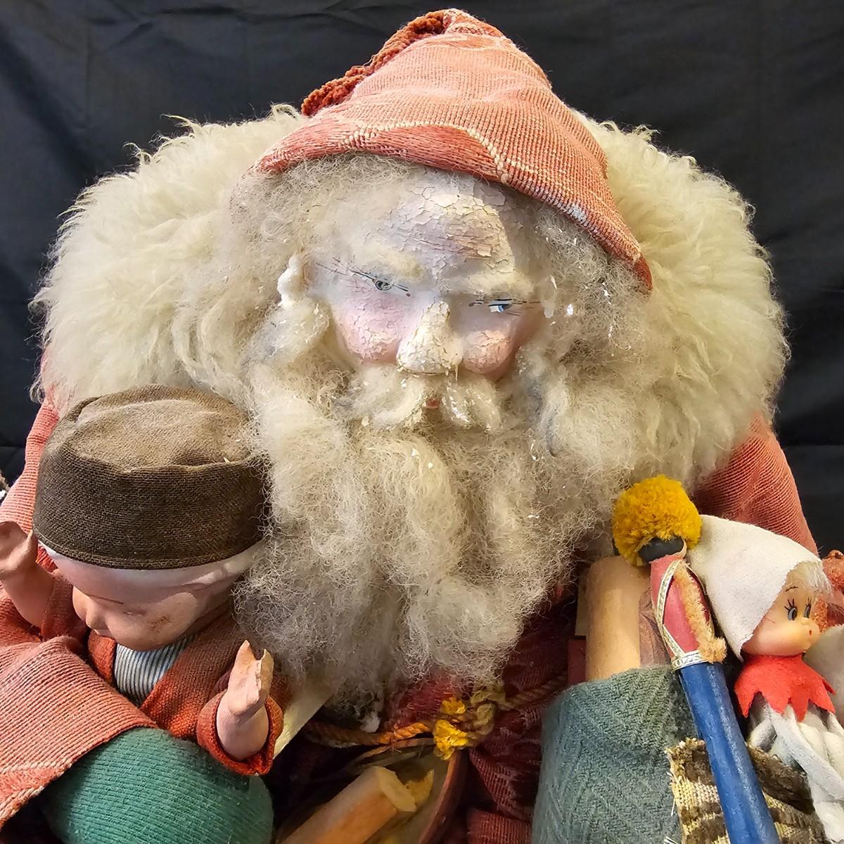 Another Norma DeCamp creation, this one a shelf sitter style Santa, also part of the Wizards Workbench. This figure holds a Dutch boy doll under one arm and has a sack full of other delights. Velvet and brocade attired, this figure measures 12" x 13" x 15"H, has furry collar and a tassled cap. Also includes a small teddy bear, a sack of mini wooden houses and a hand carved wooden jointed Santa figure, 3" x 10"H. Attached tag signed by artist. See photos for details. Parts of large Santa's face are flaking a bit.