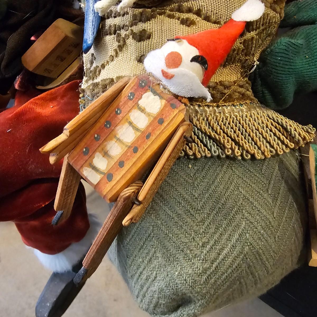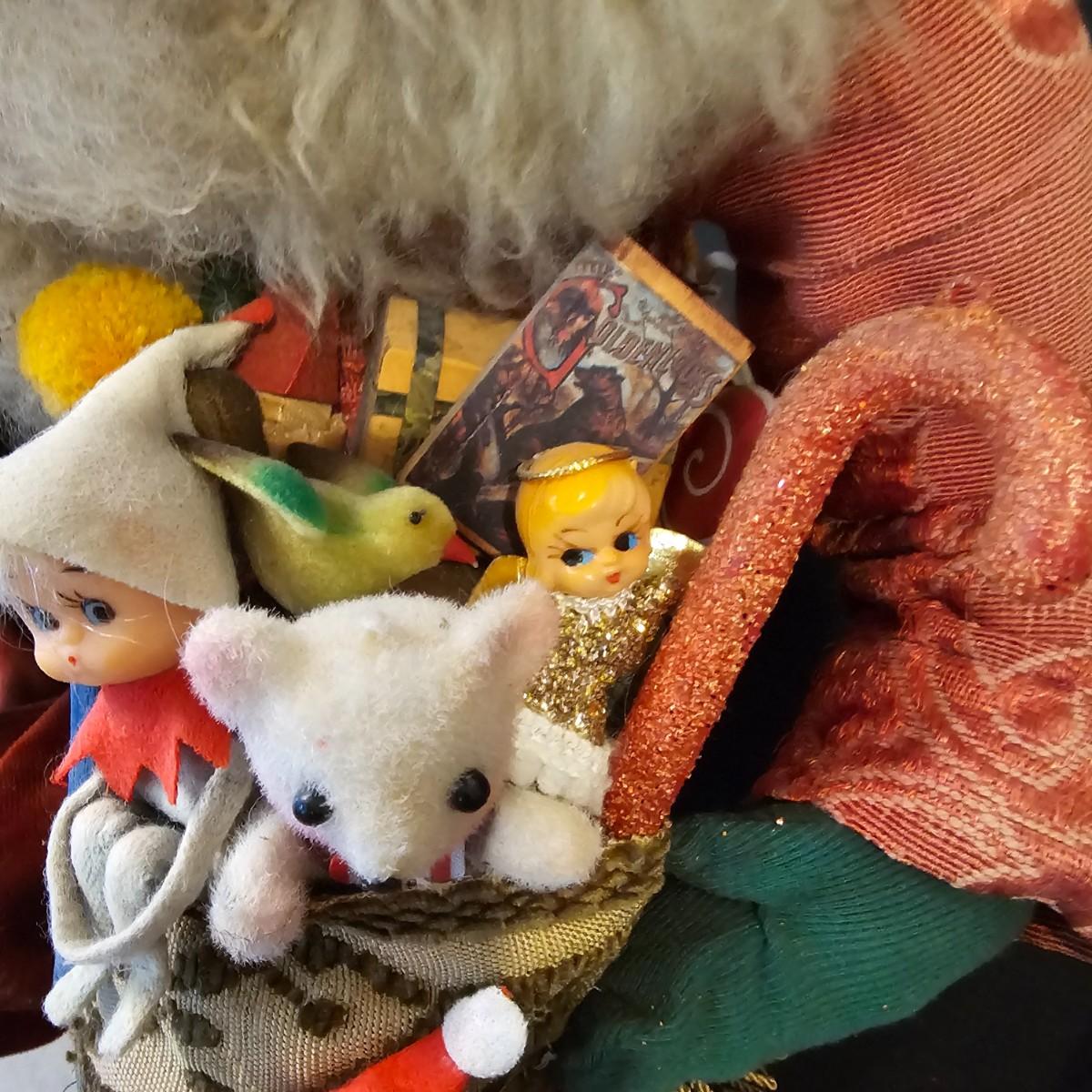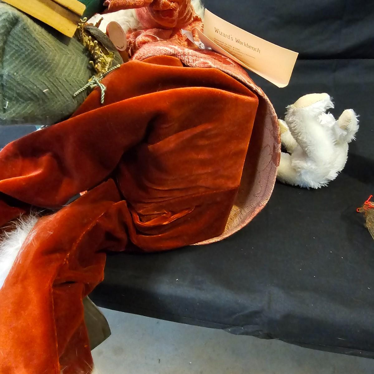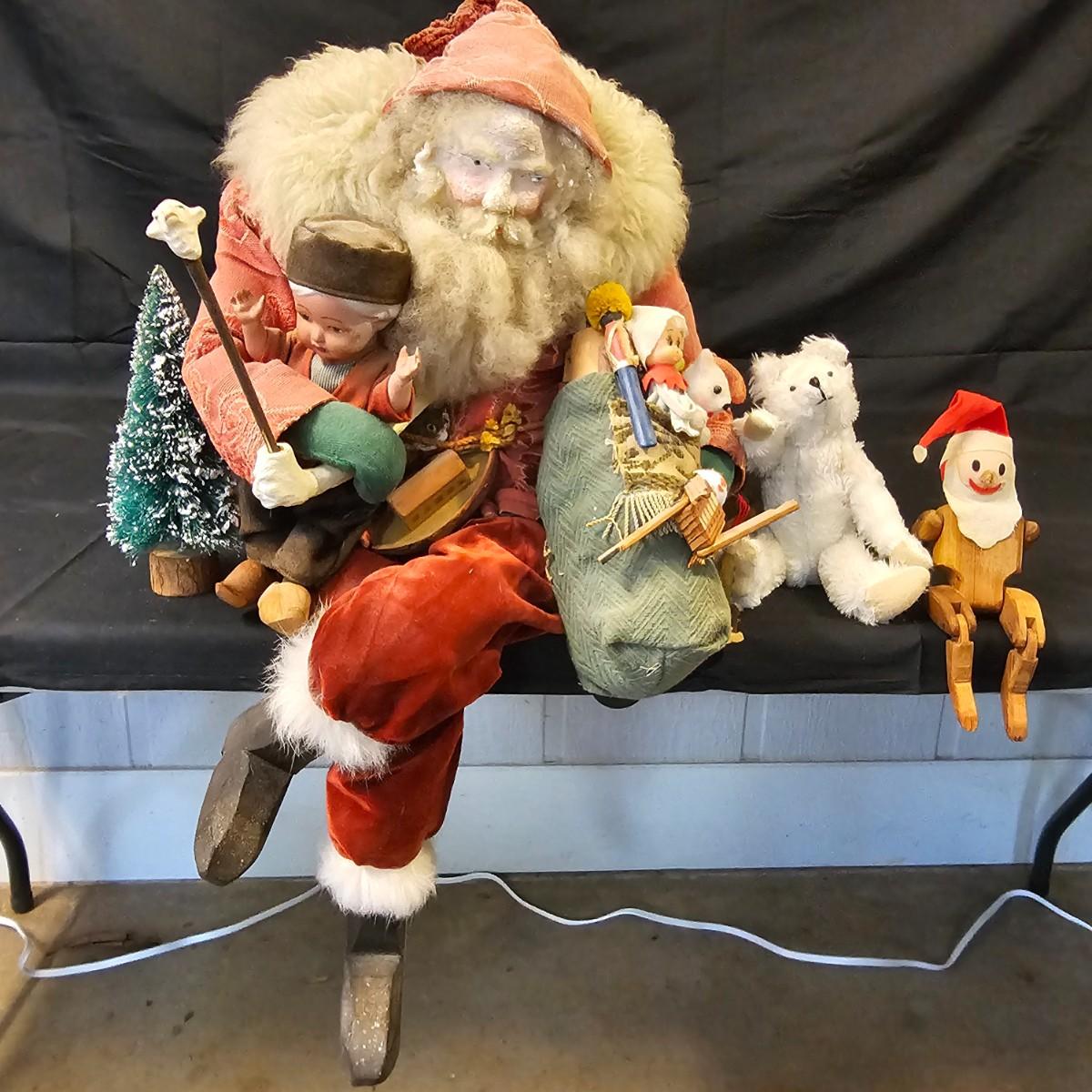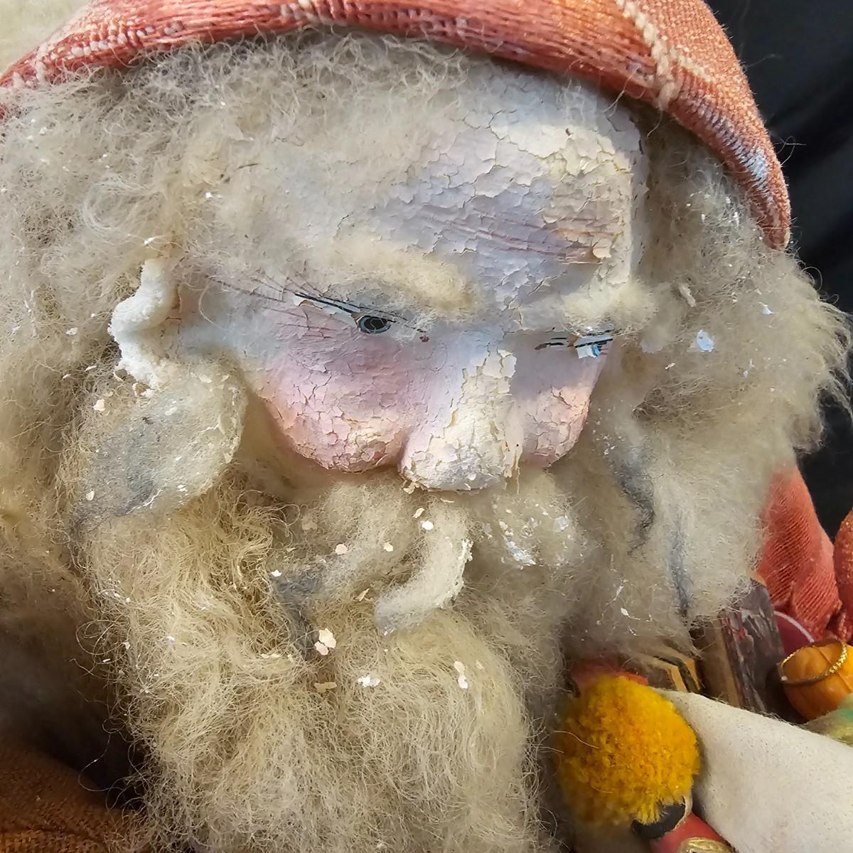 Another Norma DeCamp creation, this one a shelf sitter style Santa, also part of the Wizards Workbench. This figure holds a Dutch boy doll under one arm and has a sack full of other delights. Velvet and brocade attired, this figure measures 12" x 13" x 15"H, has furry collar and a tassled cap. Also includes a small teddy bear, a sack of mini wooden houses and a hand carved wooden jointed Santa figure, 3" x 10"H. Attached tag signed by artist. See photos for details. Parts of large Santa's face are flaking a bit.