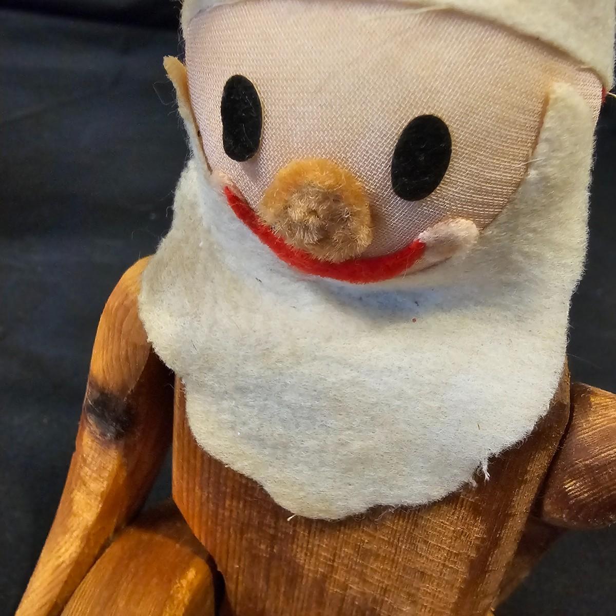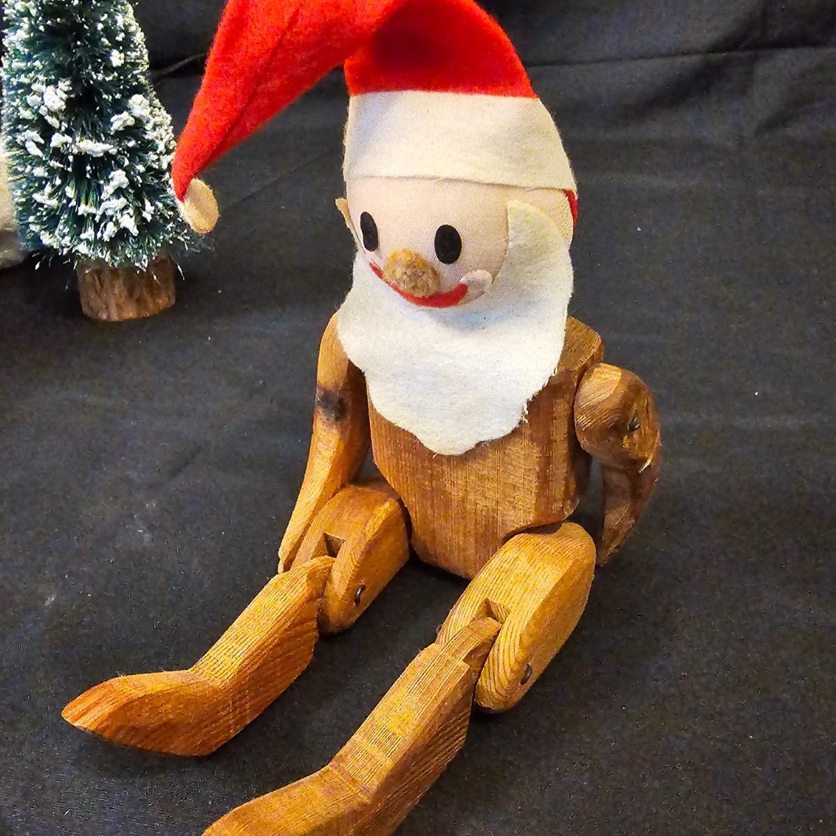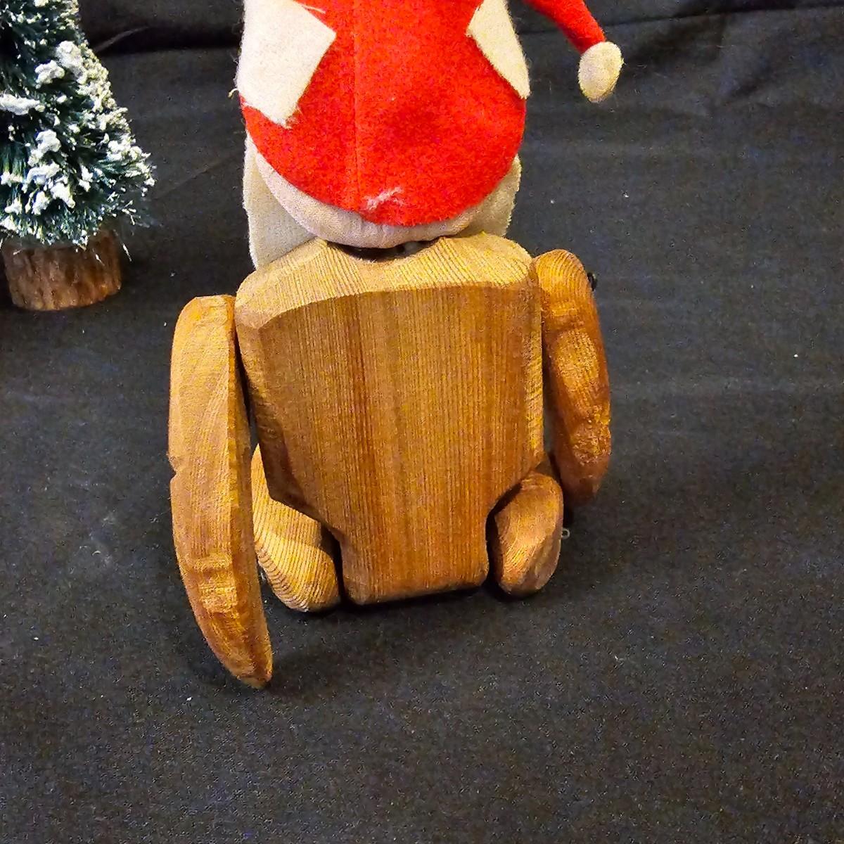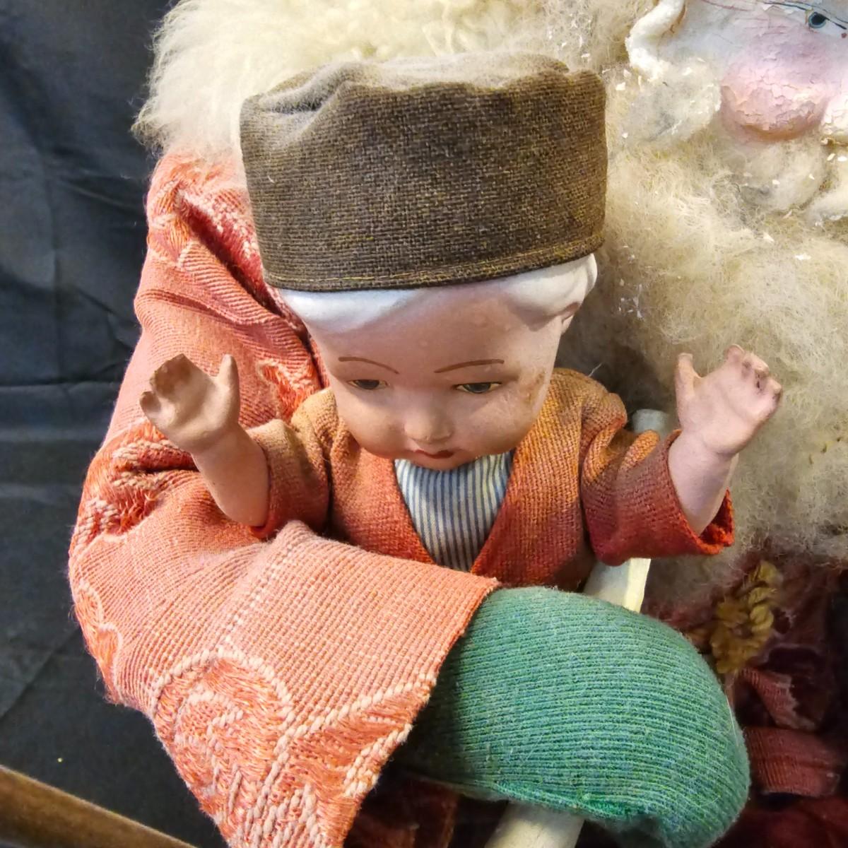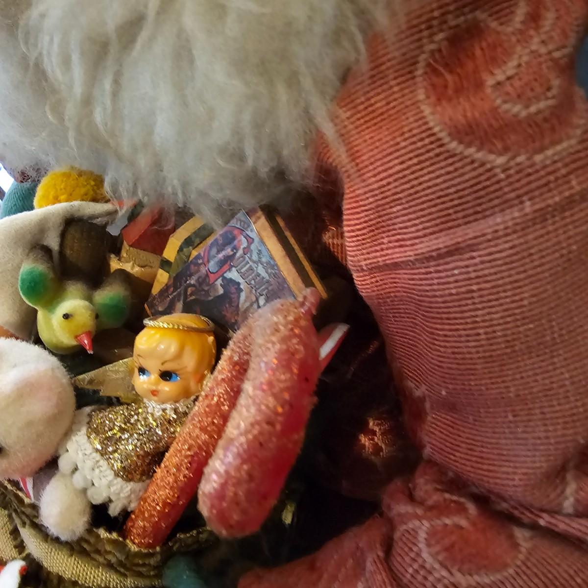 Another Norma DeCamp creation, this one a shelf sitter style Santa, also part of the Wizards Workbench. This figure holds a Dutch boy doll under one arm and has a sack full of other delights. Velvet and brocade attired, this figure measures 12" x 13" x 15"H, has furry collar and a tassled cap. Also includes a small teddy bear, a sack of mini wooden houses and a hand carved wooden jointed Santa figure, 3" x 10"H. Attached tag signed by artist. See photos for details. Parts of large Santa's face are flaking a bit.