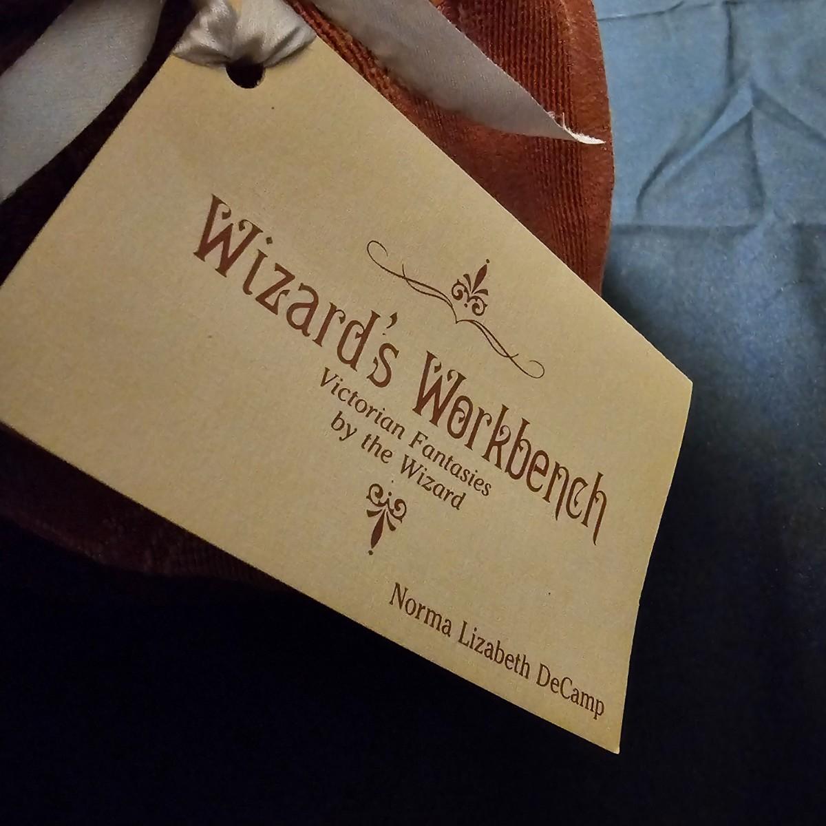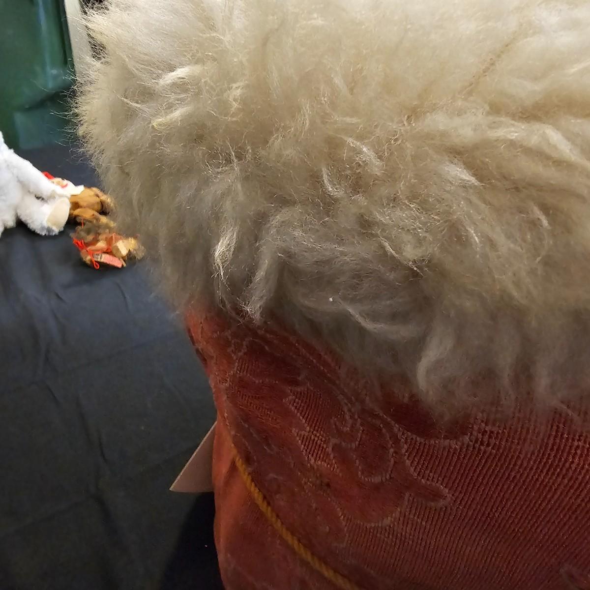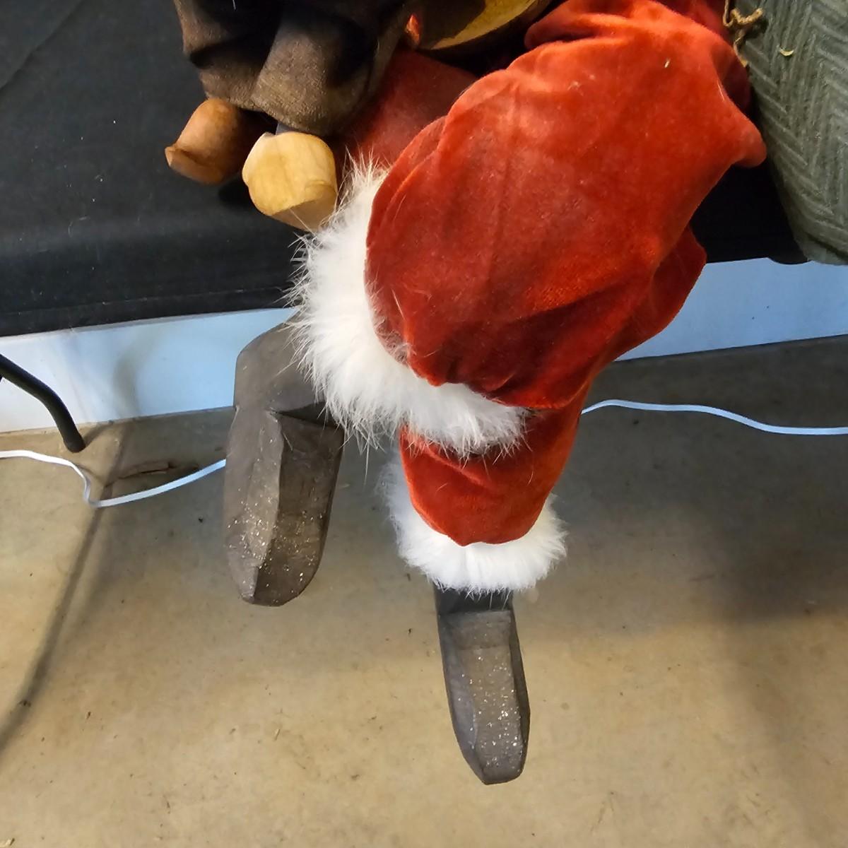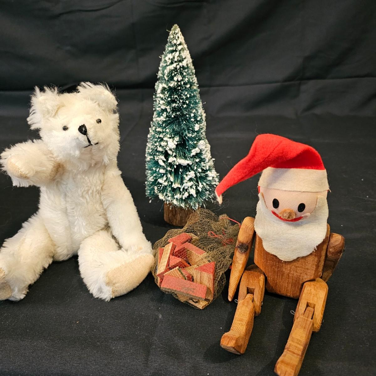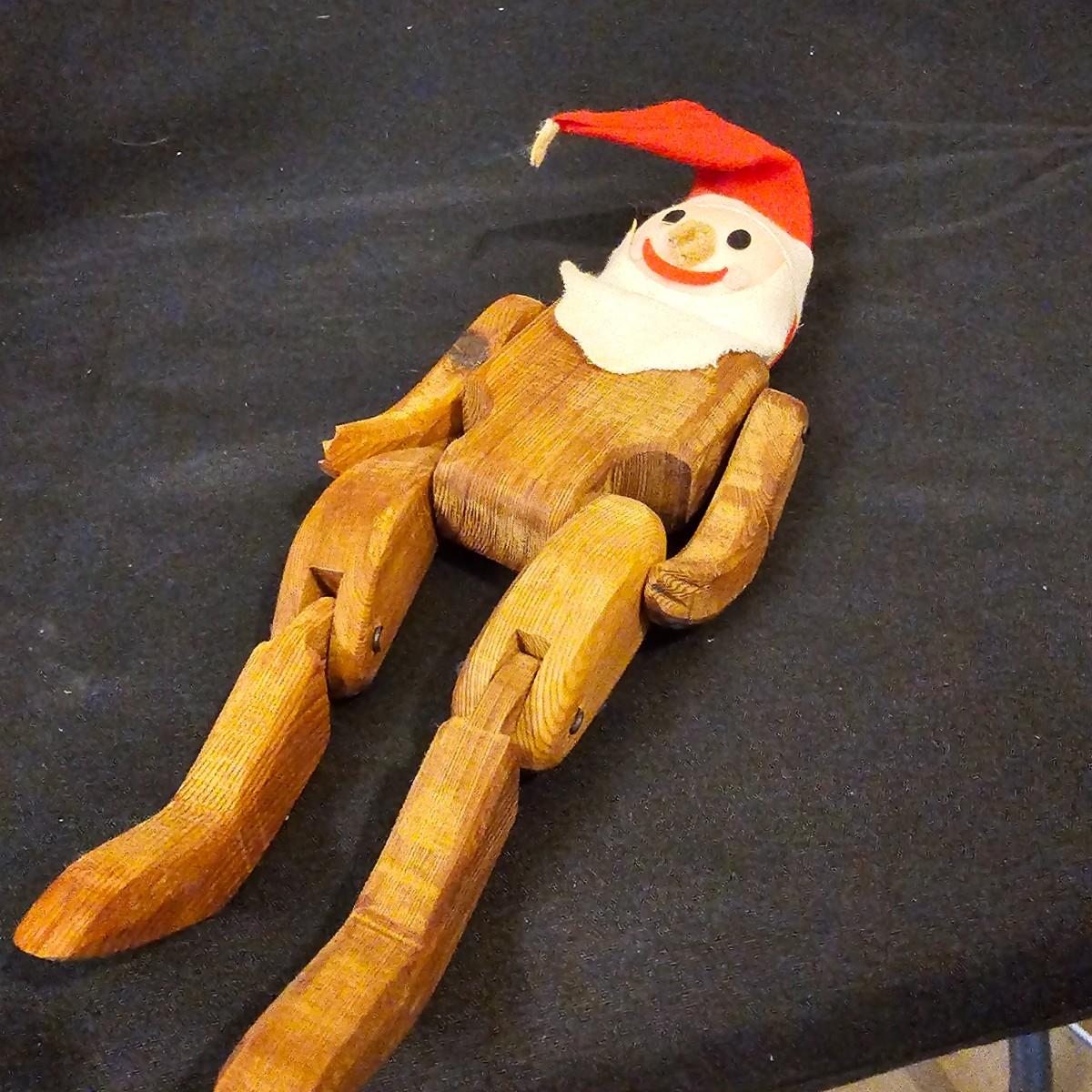 Another Norma DeCamp creation, this one a shelf sitter style Santa, also part of the Wizards Workbench. This figure holds a Dutch boy doll under one arm and has a sack full of other delights. Velvet and brocade attired, this figure measures 12" x 13" x 15"H, has furry collar and a tassled cap. Also includes a small teddy bear, a sack of mini wooden houses and a hand carved wooden jointed Santa figure, 3" x 10"H. Attached tag signed by artist. See photos for details. Parts of large Santa's face are flaking a bit.