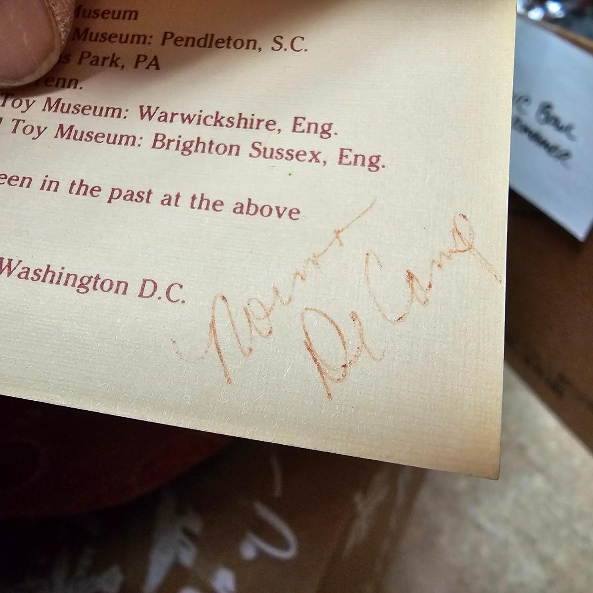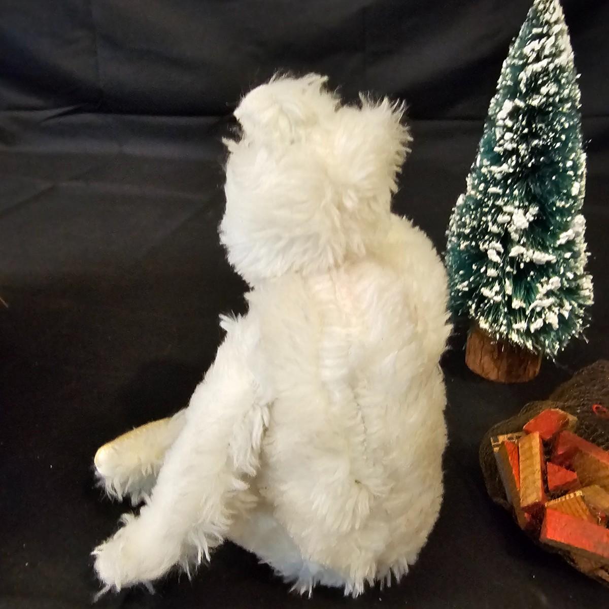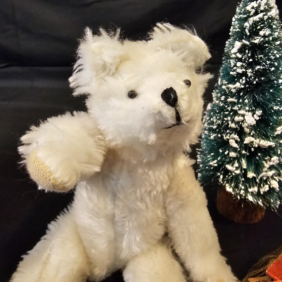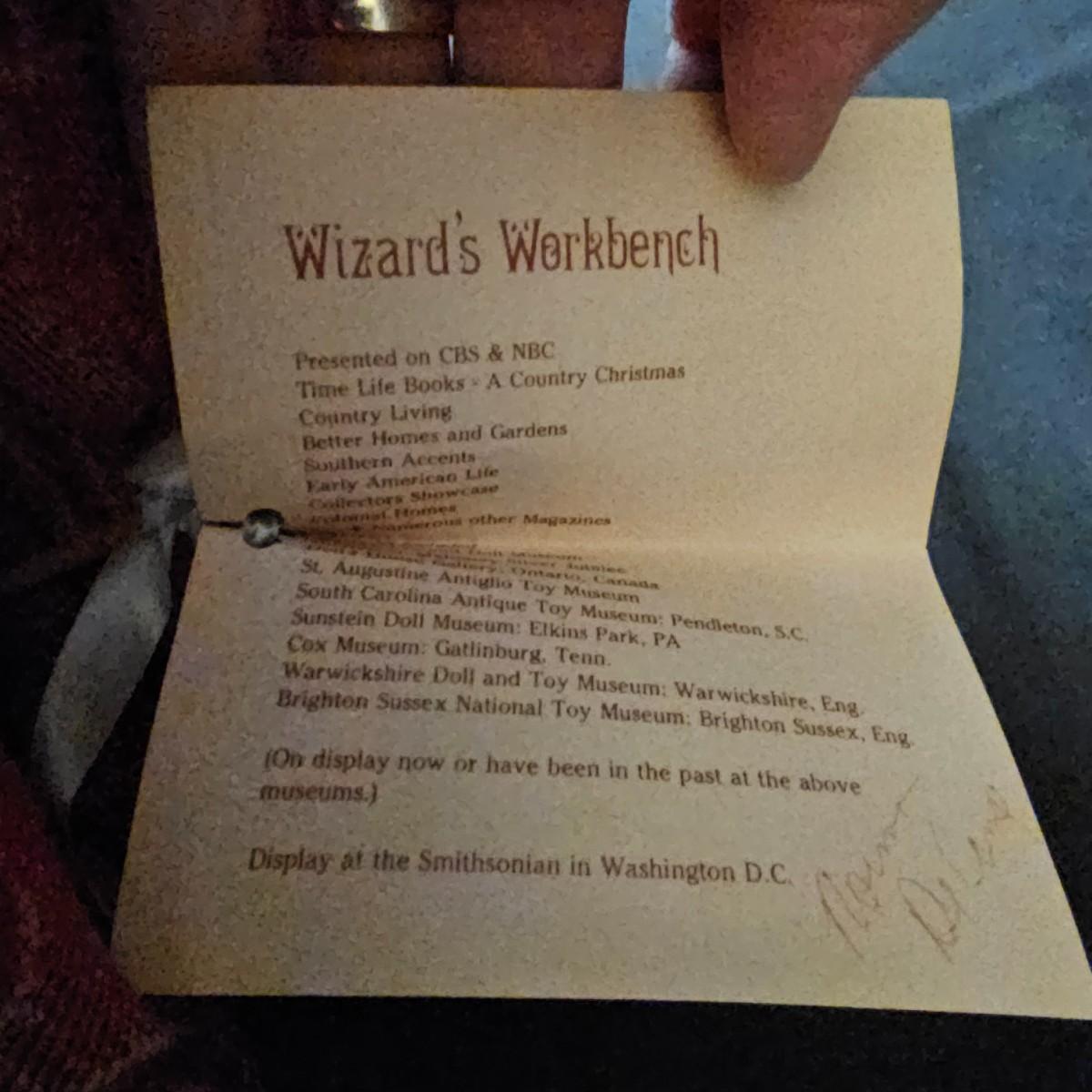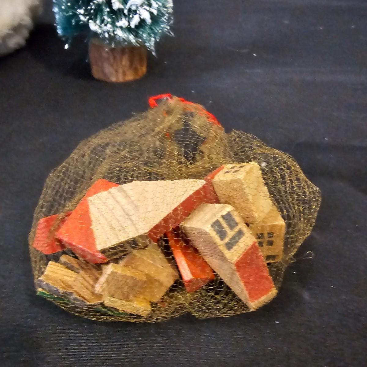 Another Norma DeCamp creation, this one a shelf sitter style Santa, also part of the Wizards Workbench. This figure holds a Dutch boy doll under one arm and has a sack full of other delights. Velvet and brocade attired, this figure measures 12" x 13" x 15"H, has furry collar and a tassled cap. Also includes a small teddy bear, a sack of mini wooden houses and a hand carved wooden jointed Santa figure, 3" x 10"H. Attached tag signed by artist. See photos for details. Parts of large Santa's face are flaking a bit.