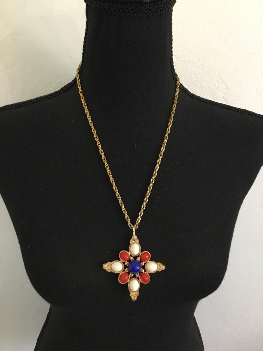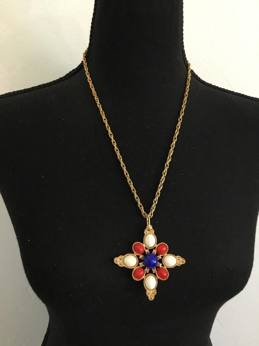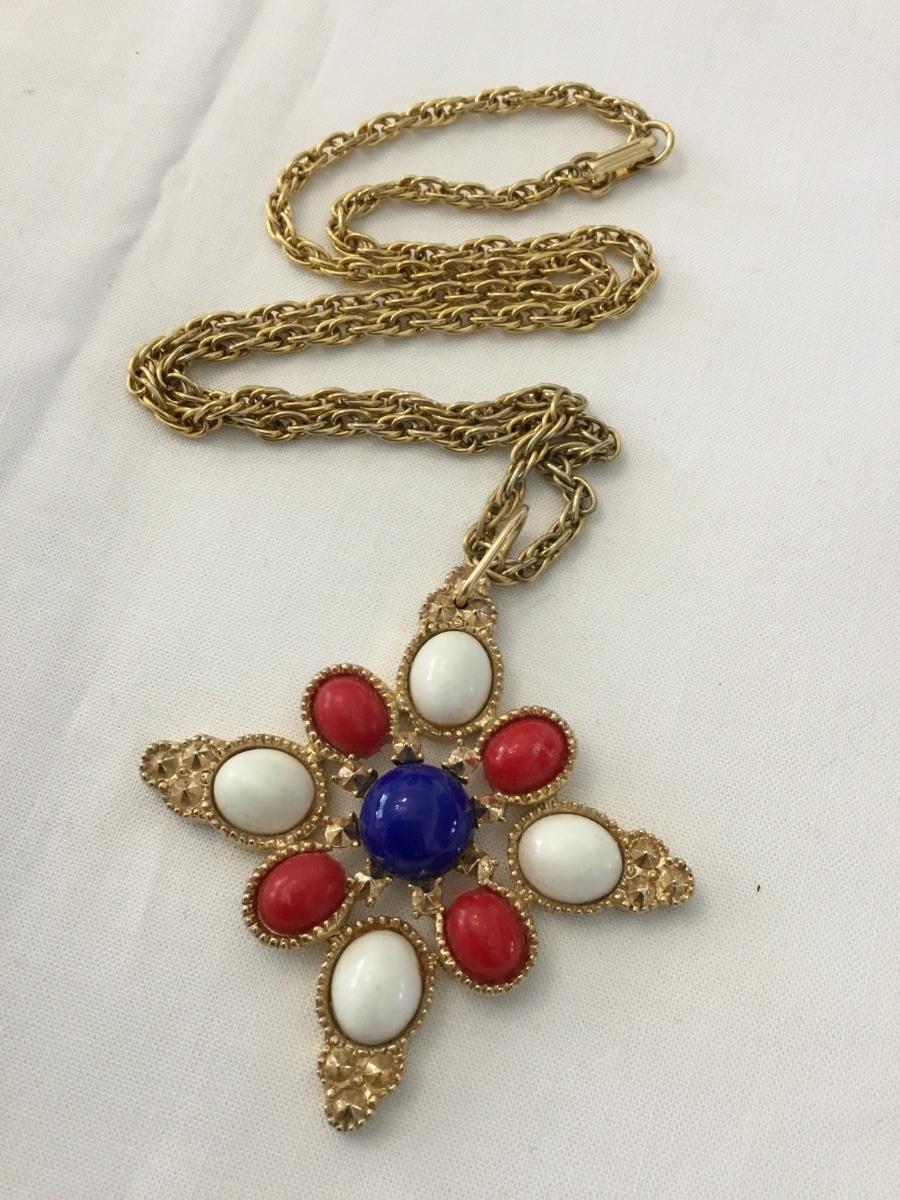 Vintage, Sarah Coventry, gold, toned, red white, and blue statement necklace