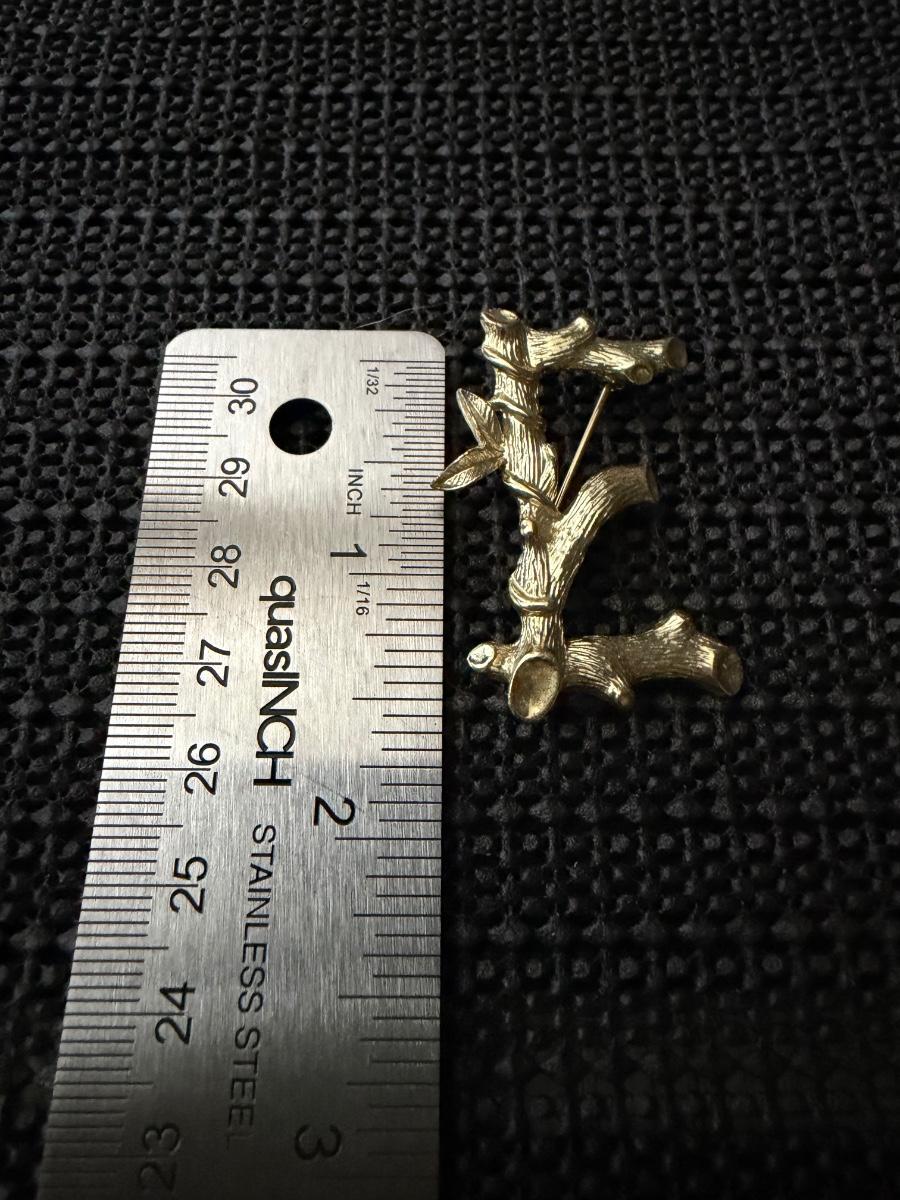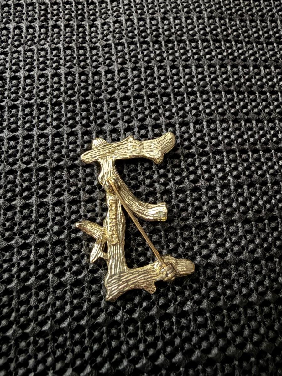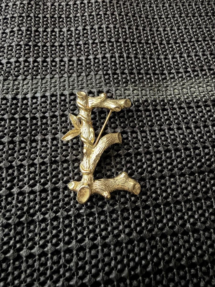 vintage Sarah Coventry gold-tone initial "E" brooch from the 1964 "Sarah's ABCs" collection, featuring a faux bois branch and leaf design.