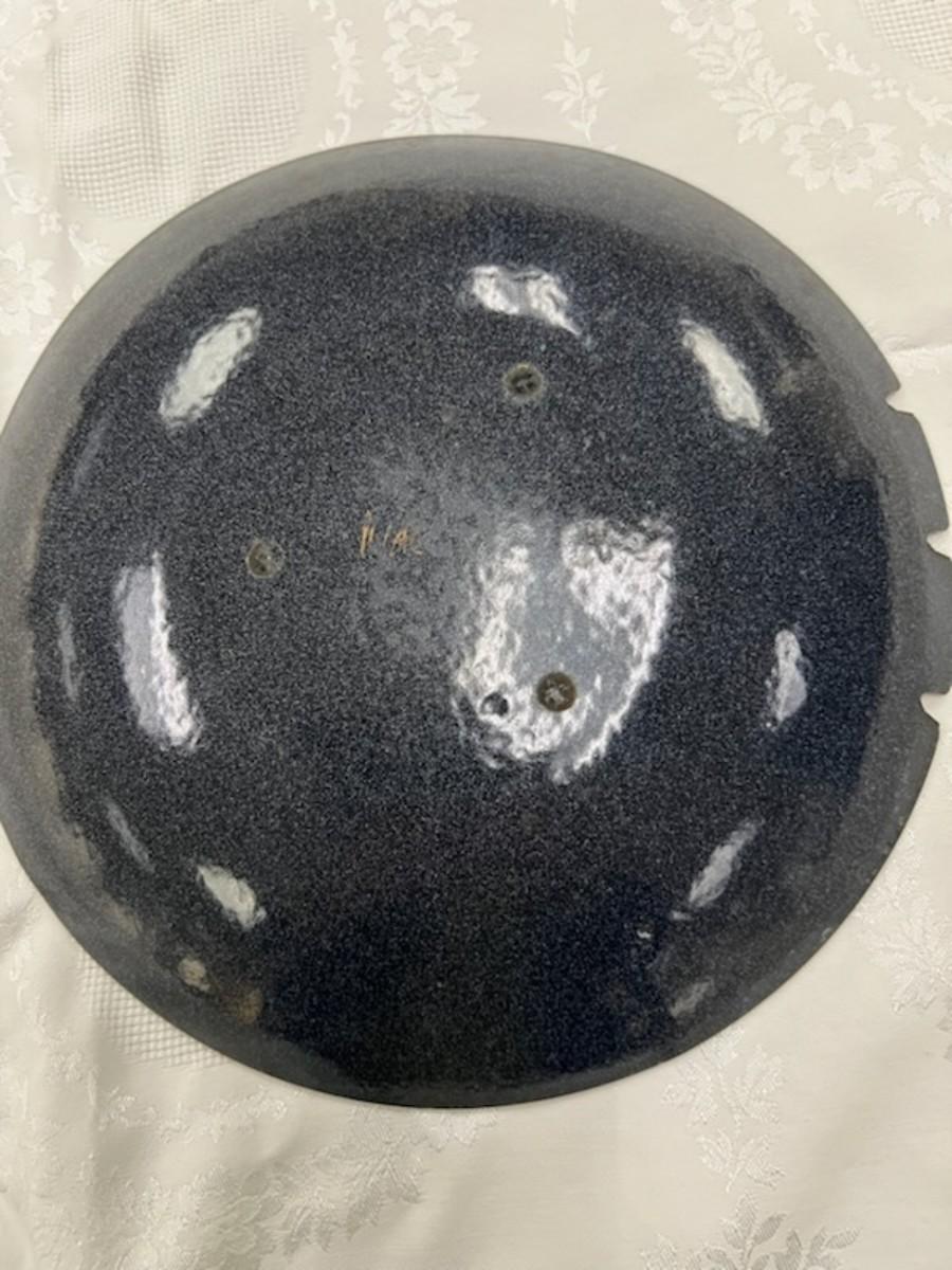 11.5 " diameter by 1.75" tall, porcelain and copper bowl. Good condition.