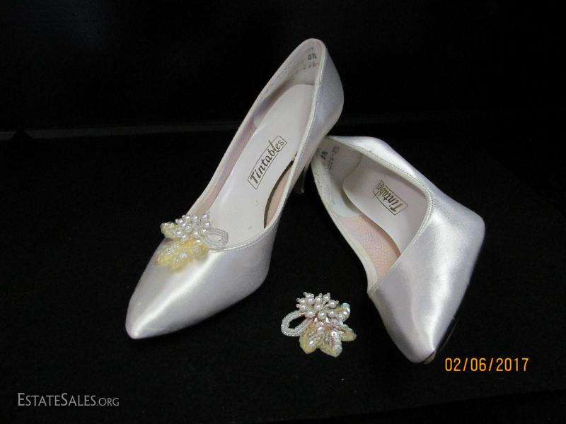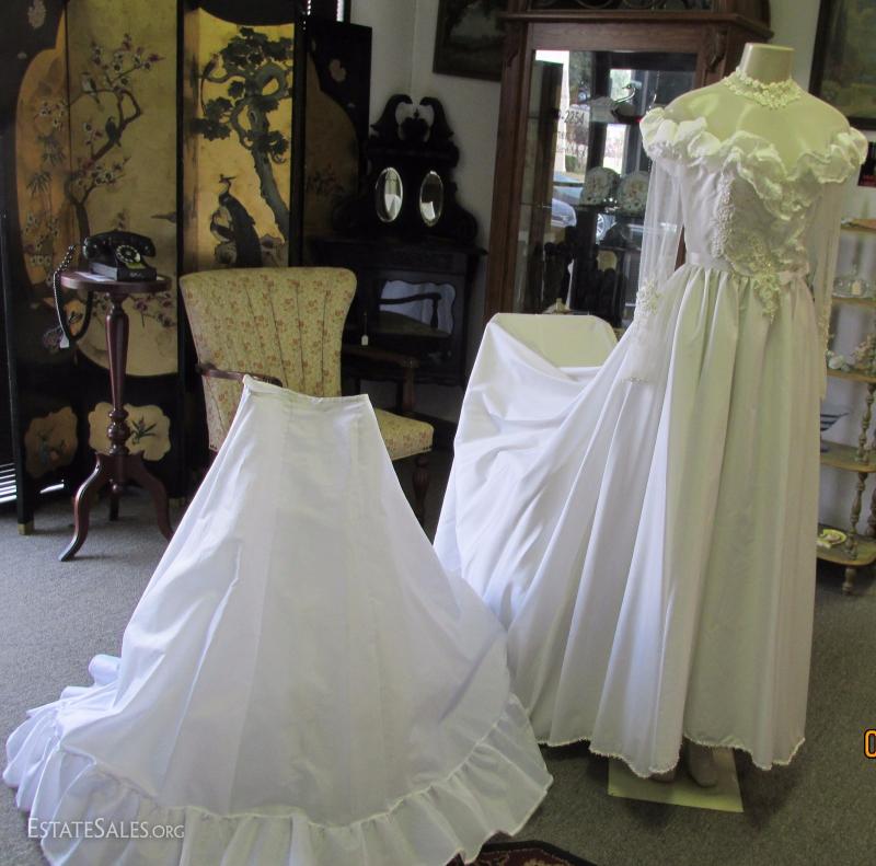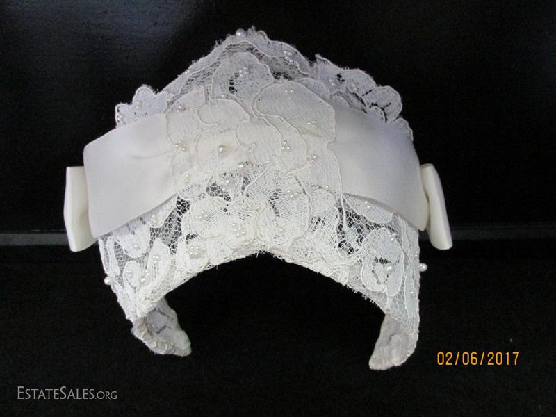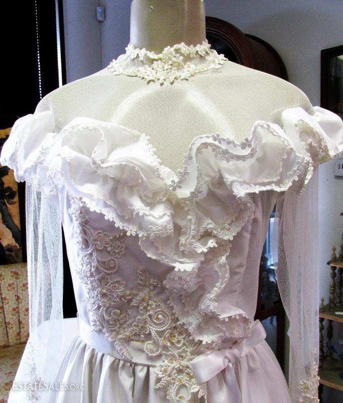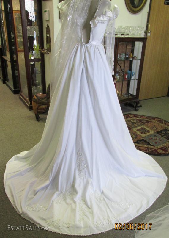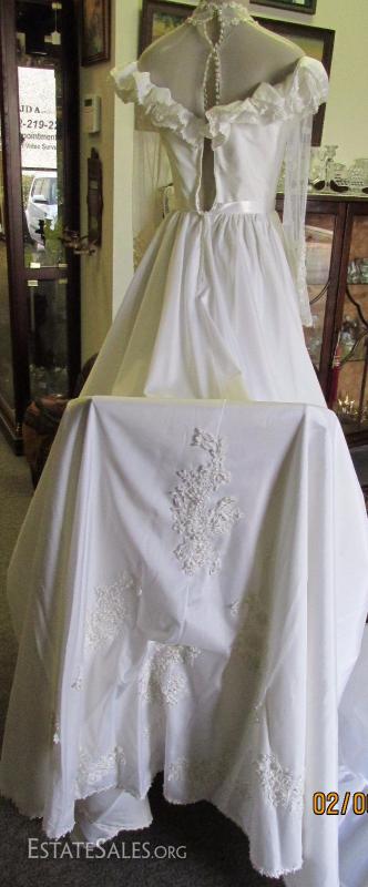 Satin with Faux Pearl, Sequin and Chantilly Lace Wedding Dress size 5 used once. Waist to hem is 40" and bust area is 18" (armpit to armpit). Dress has a couple of small (maybe coffee) spots. The lighting used can cause picture color to appear lighter/darker than actual item color. Please view photos at full screen size for best detail.