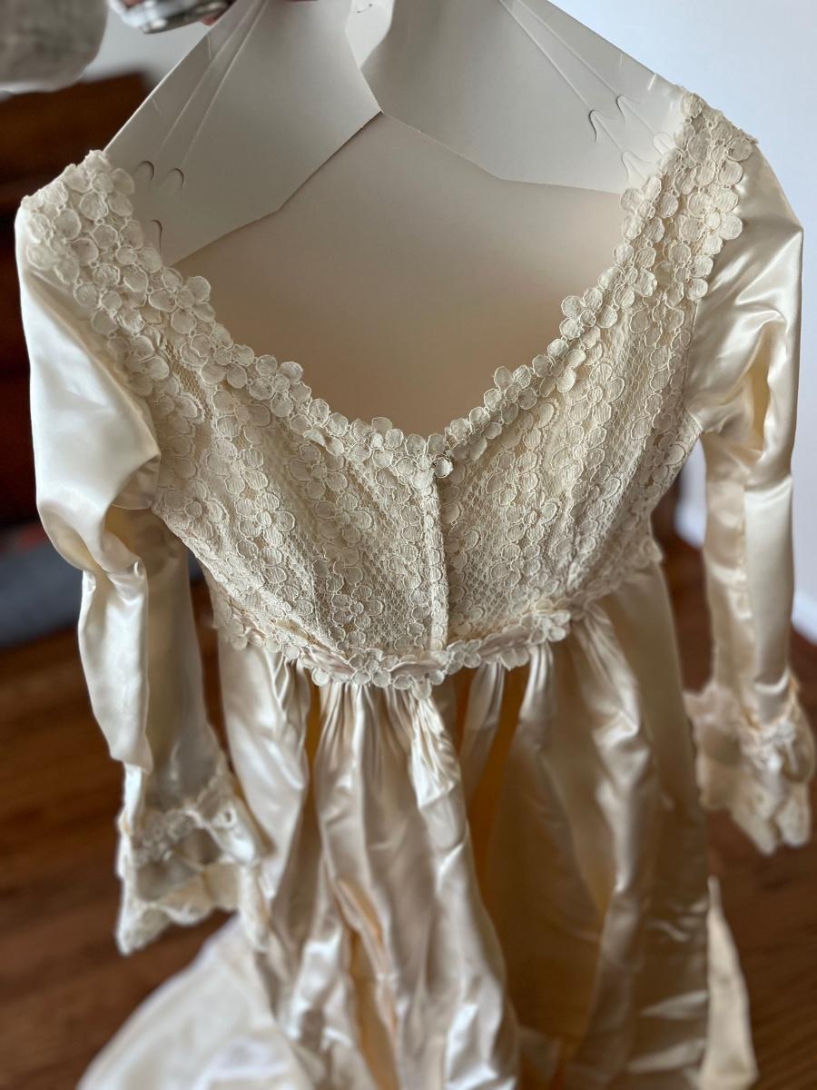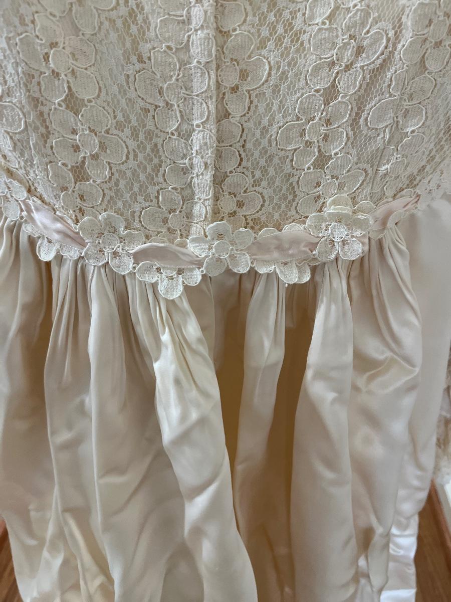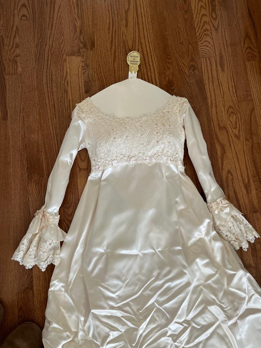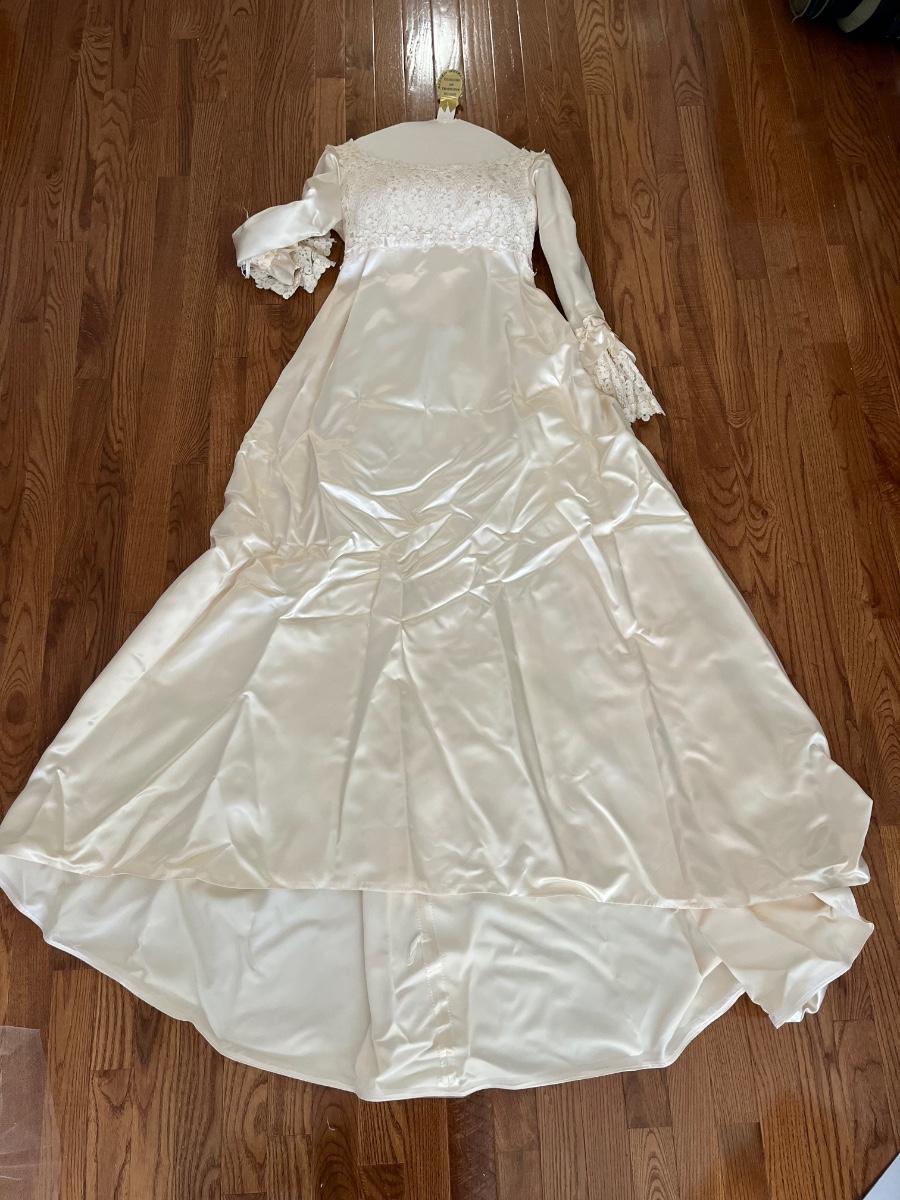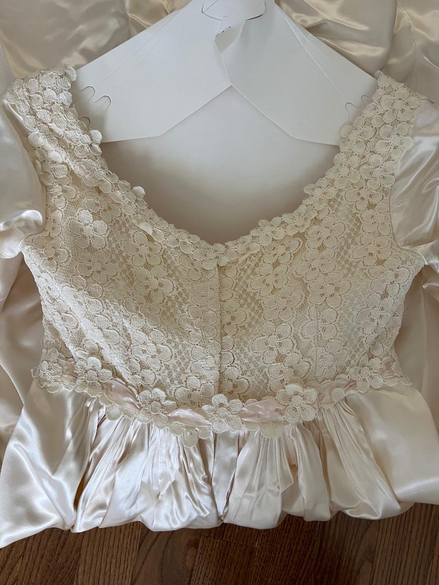 Vintage wedding dress and veil have been beautifully sealed. The dress is made of cream colored satin and trimmed in beautiful lace details, with a hint of pink at the bodice and forearm. Veil is approx 84” long. The dress is 14.5” shoulder to shoulder x 27” at bodice and 52.5” from bottom of dress to shoulder.