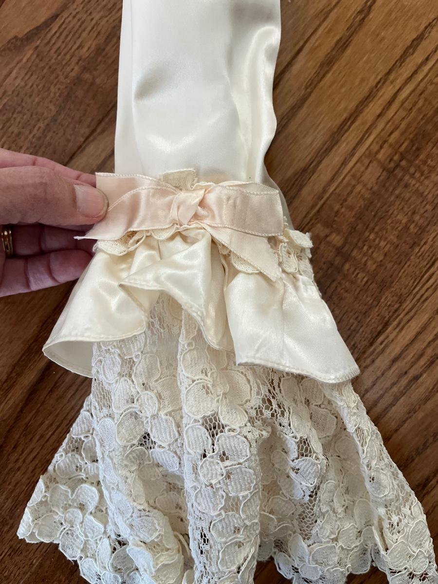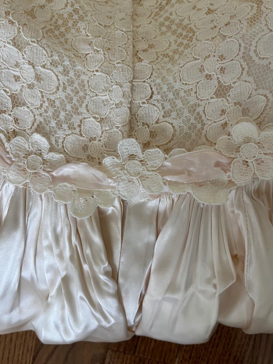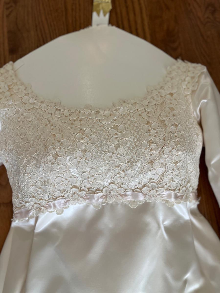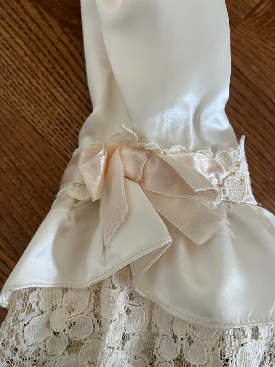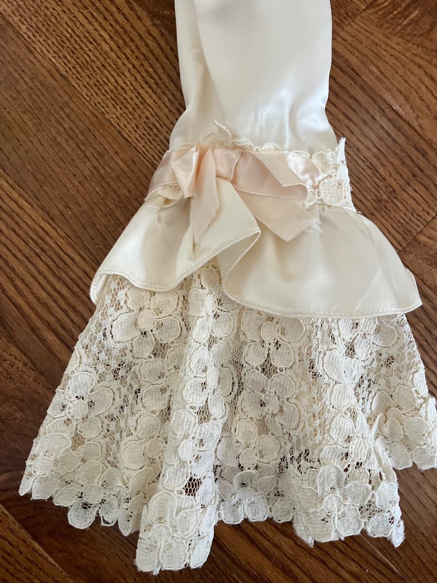 Vintage wedding dress and veil have been beautifully sealed. The dress is made of cream colored satin and trimmed in beautiful lace details, with a hint of pink at the bodice and forearm. Veil is approx 84” long. The dress is 14.5” shoulder to shoulder x 27” at bodice and 52.5” from bottom of dress to shoulder.