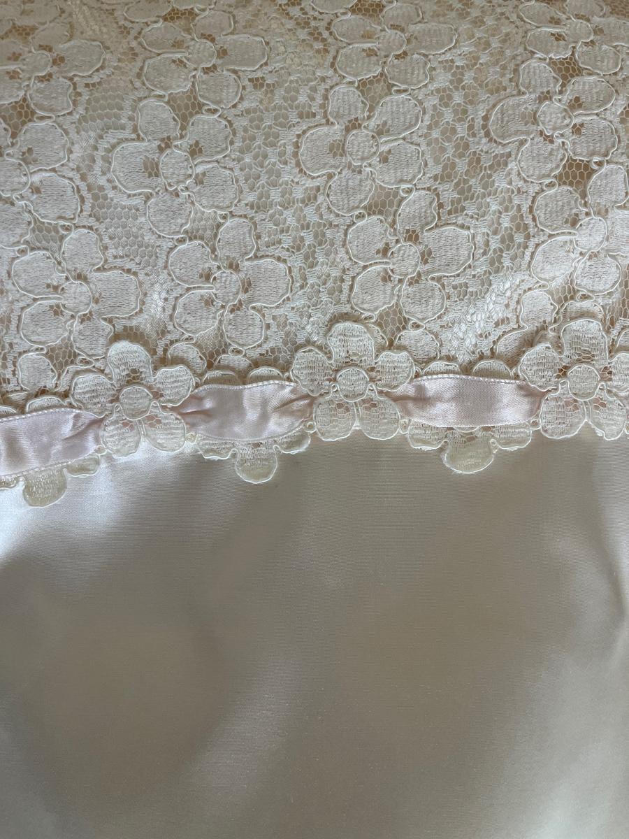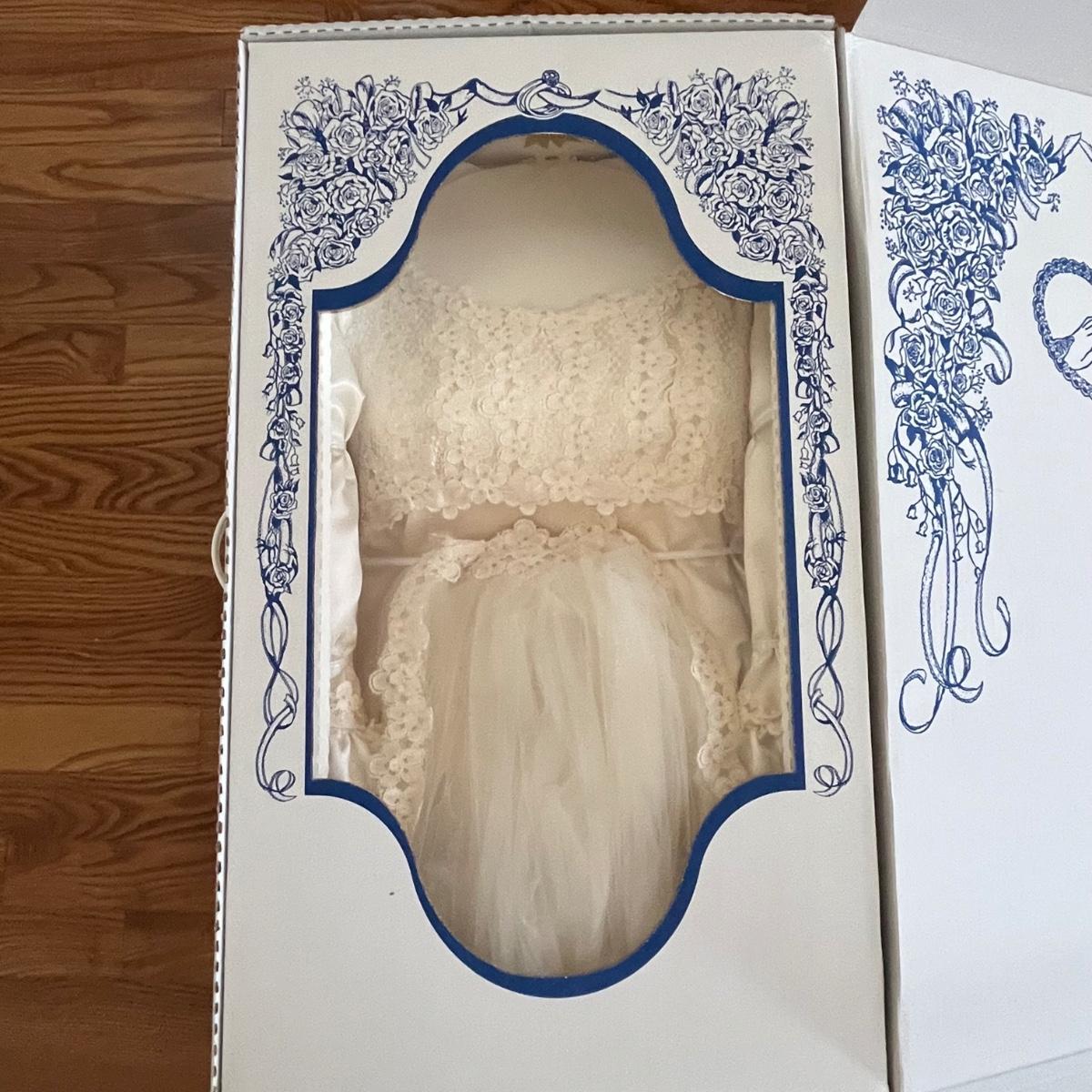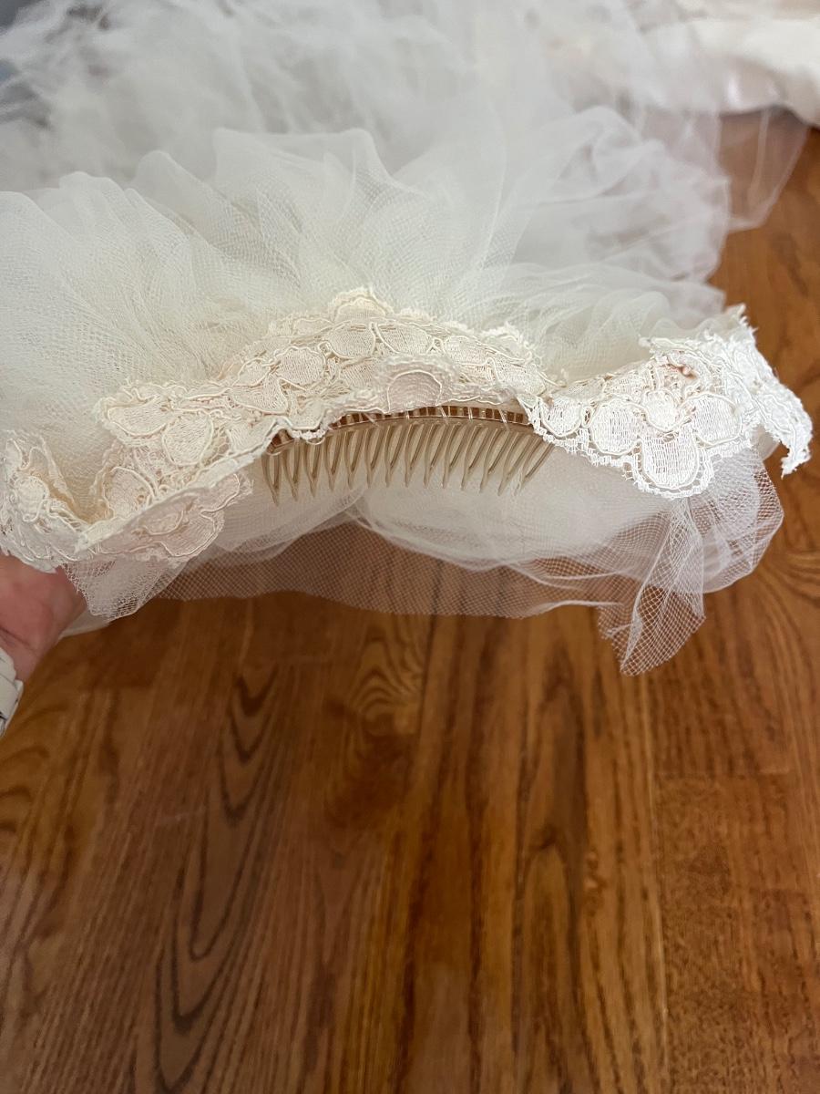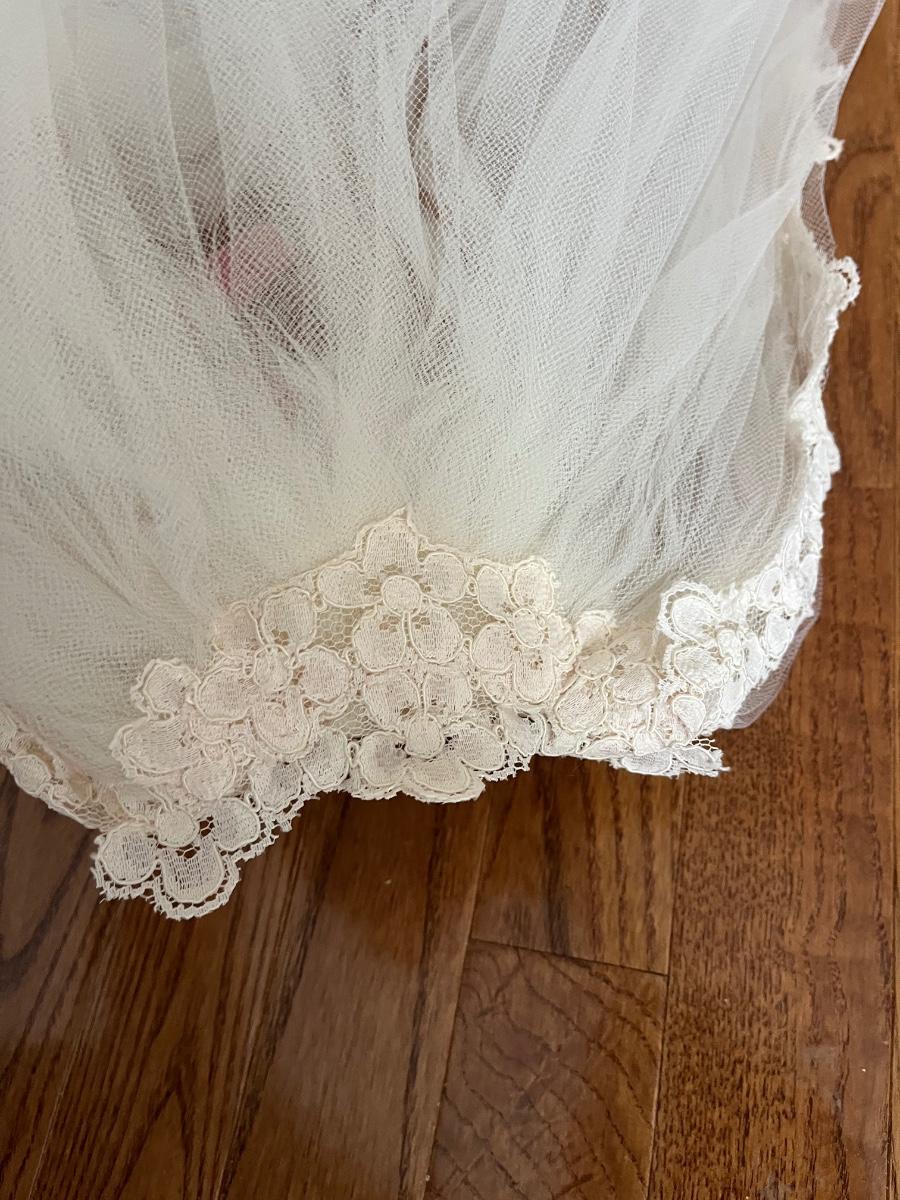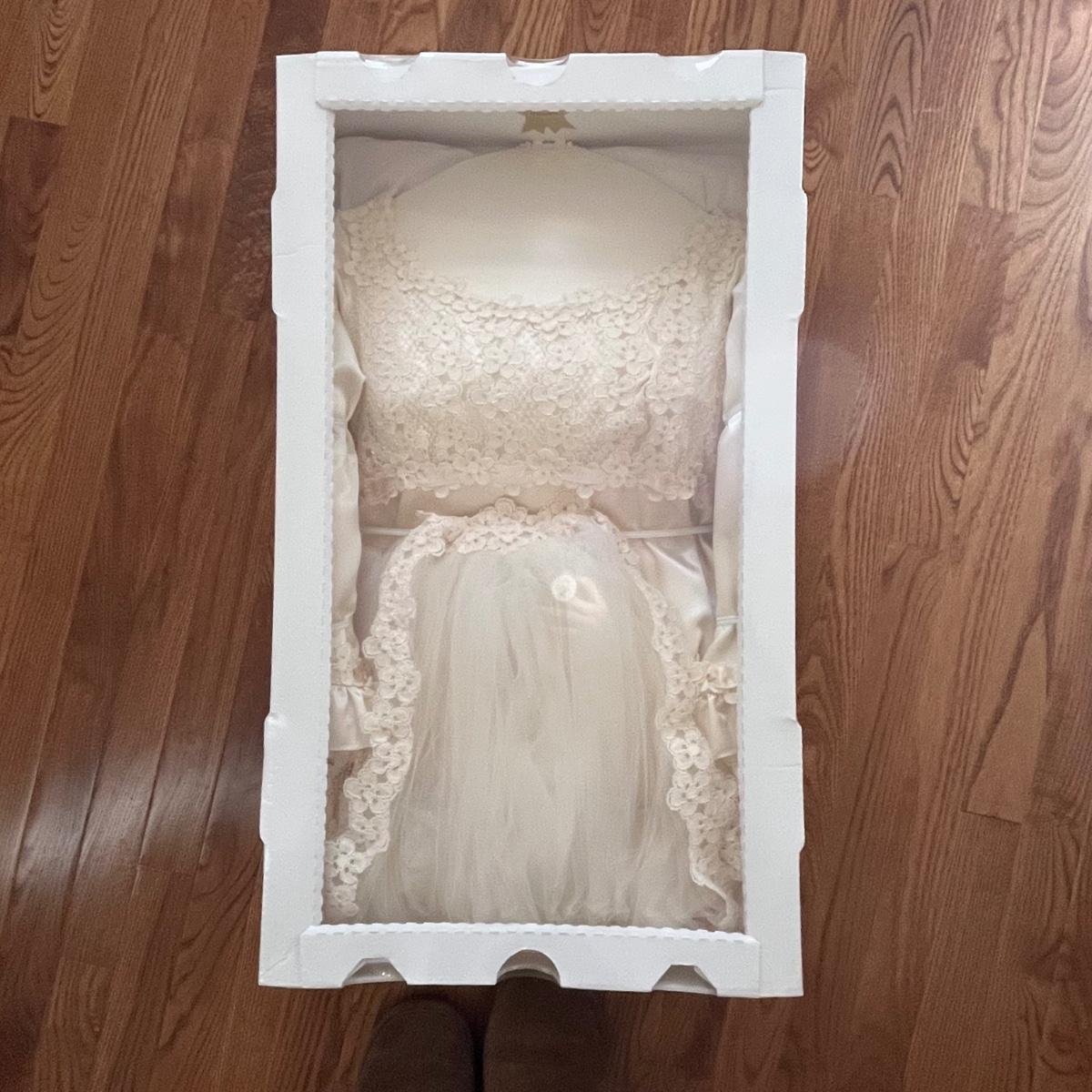 Vintage wedding dress and veil have been beautifully sealed. The dress is made of cream colored satin and trimmed in beautiful lace details, with a hint of pink at the bodice and forearm. Veil is approx 84” long. The dress is 14.5” shoulder to shoulder x 27” at bodice and 52.5” from bottom of dress to shoulder.
