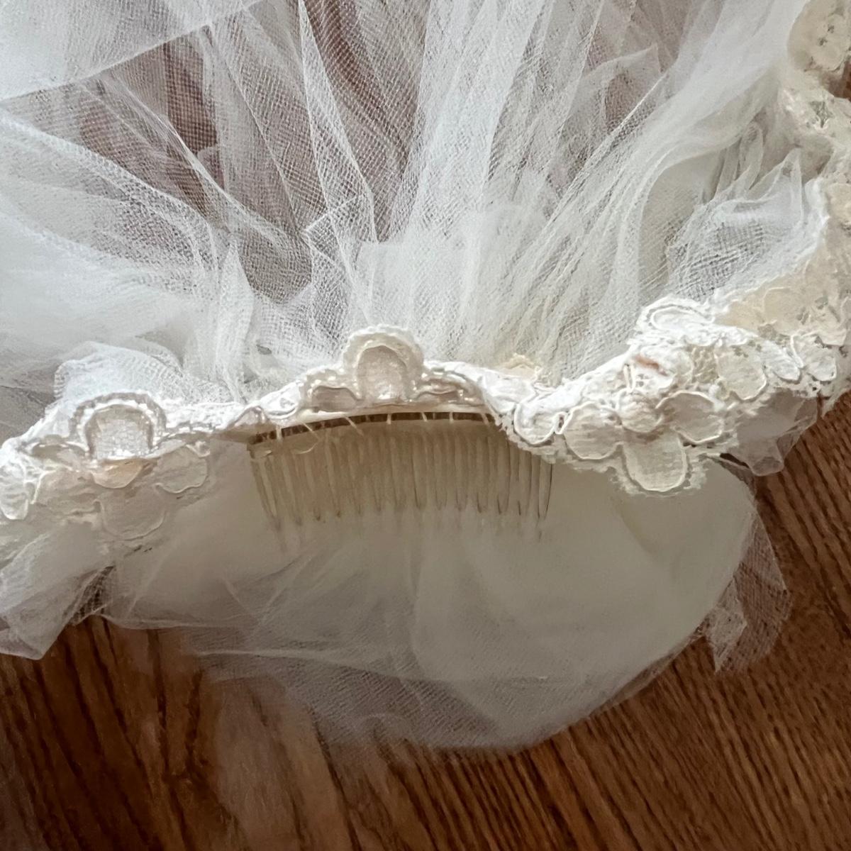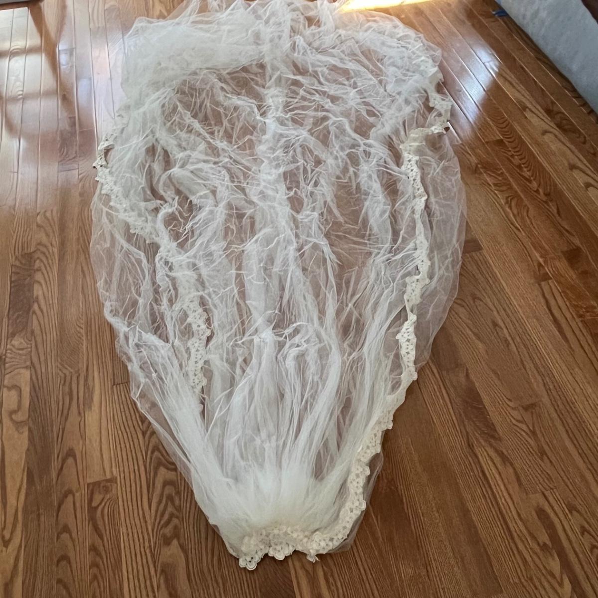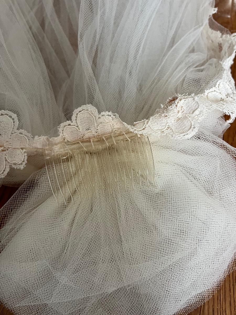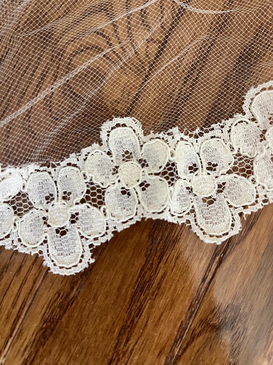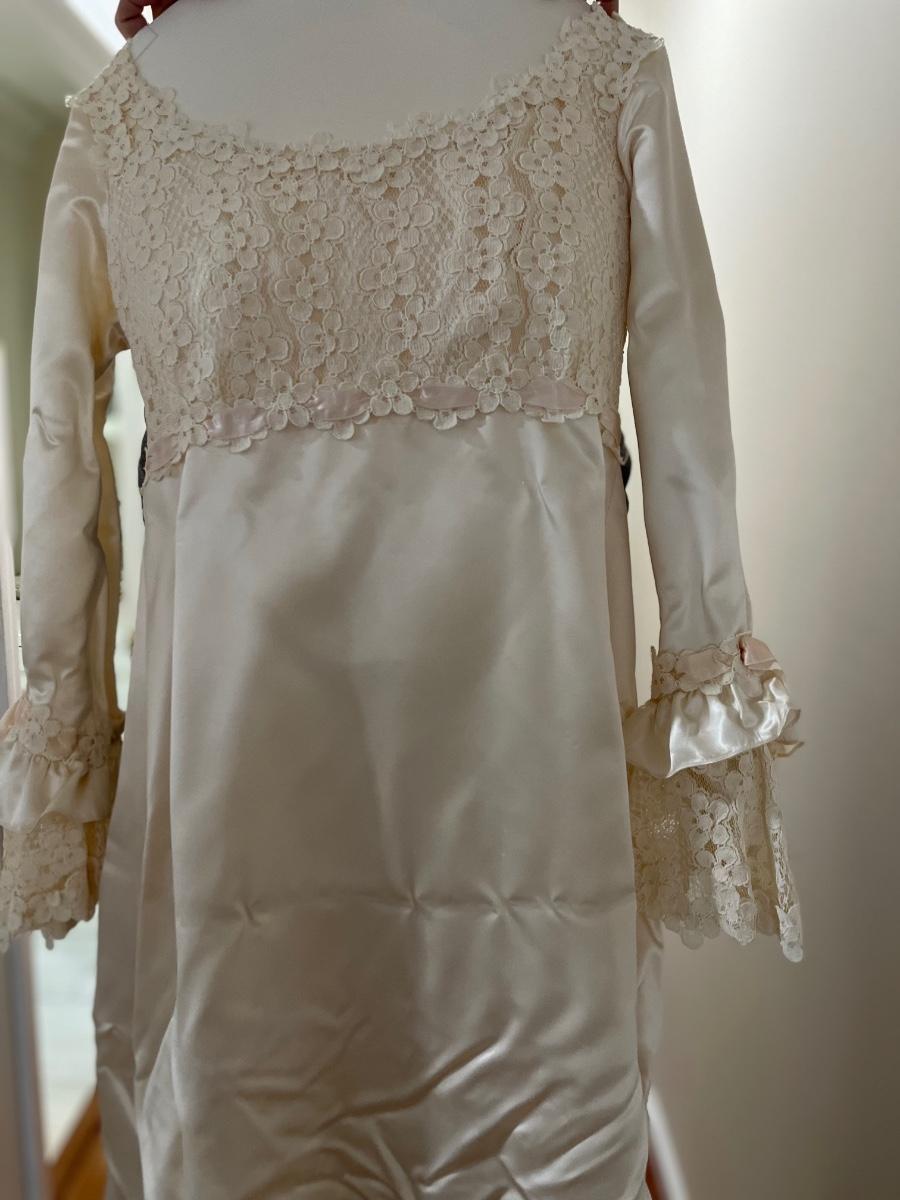 Vintage wedding dress and veil have been beautifully sealed. The dress is made of cream colored satin and trimmed in beautiful lace details, with a hint of pink at the bodice and forearm. Veil is approx 84” long. The dress is 14.5” shoulder to shoulder x 27” at bodice and 52.5” from bottom of dress to shoulder.