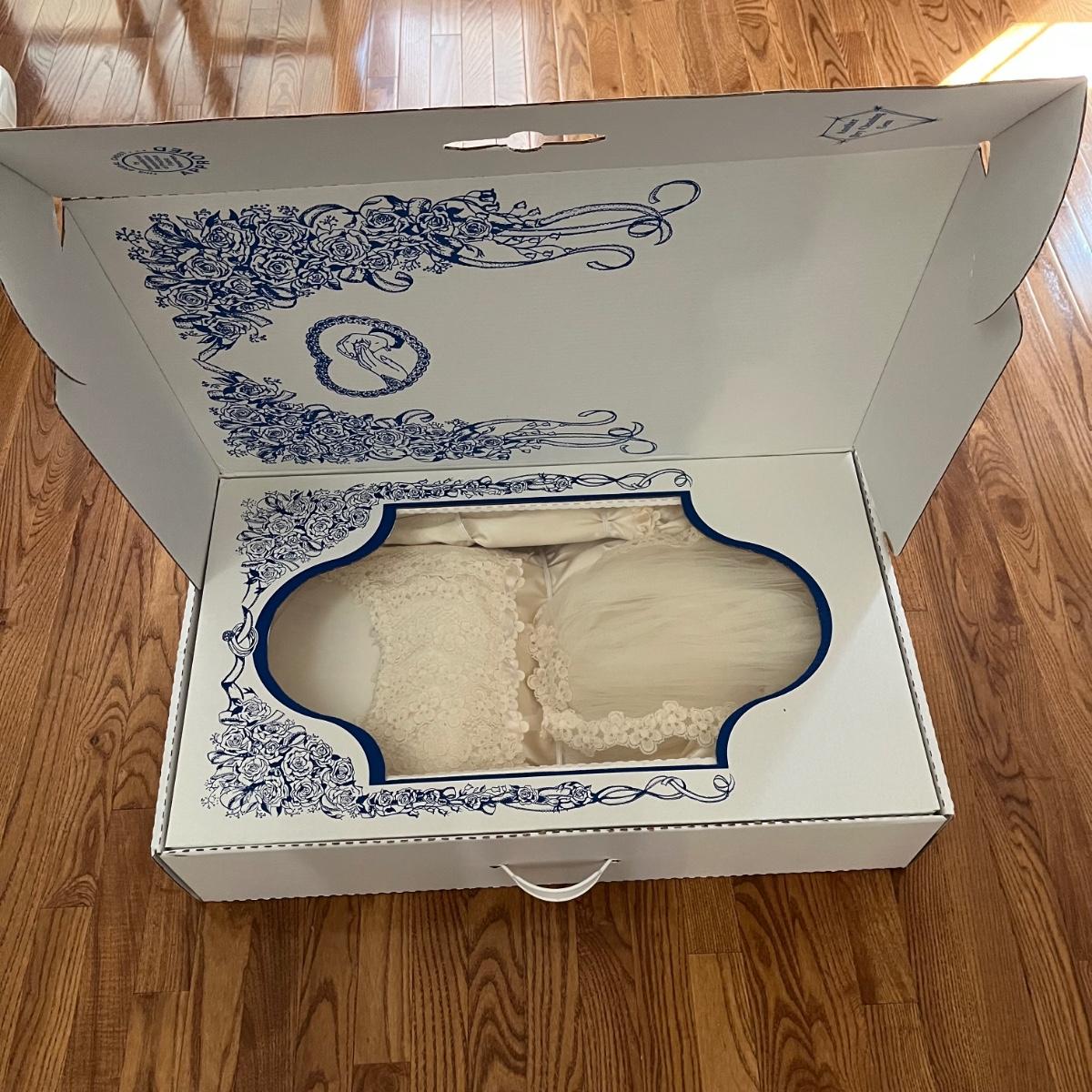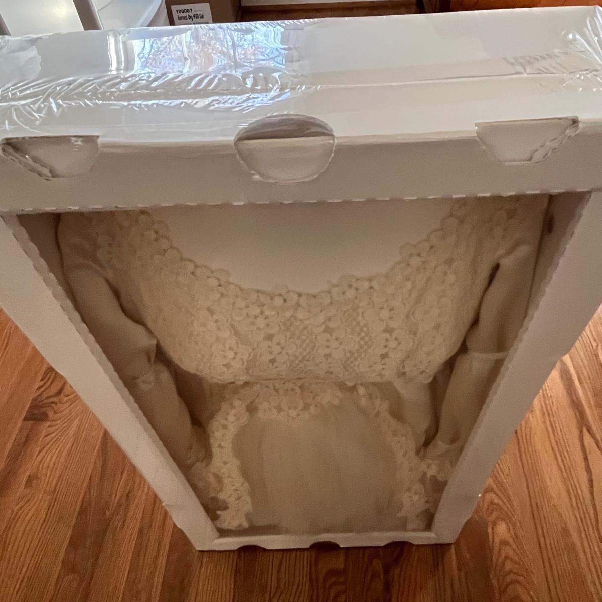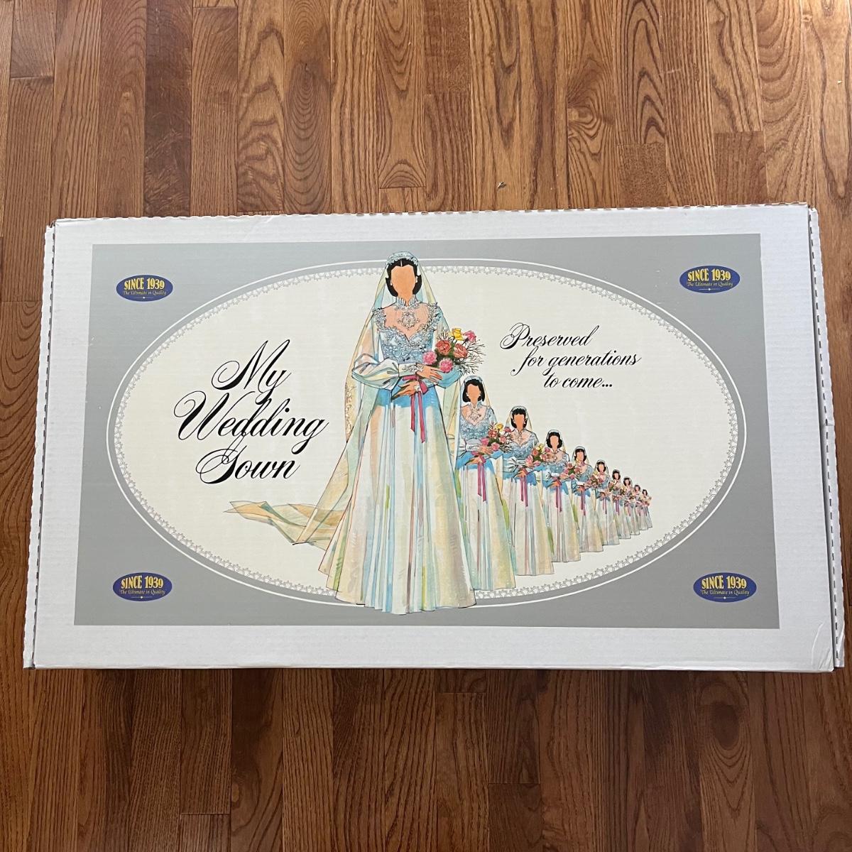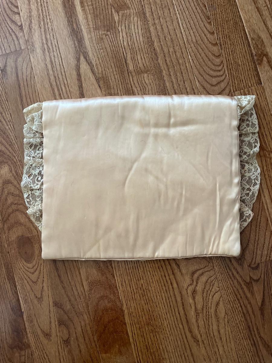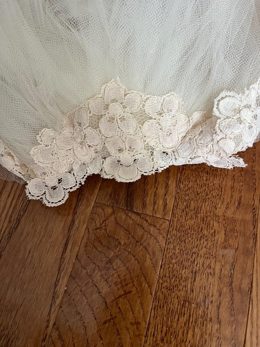 Vintage wedding dress and veil have been beautifully sealed. The dress is made of cream colored satin and trimmed in beautiful lace details, with a hint of pink at the bodice and forearm. Veil is approx 84” long. The dress is 14.5” shoulder to shoulder x 27” at bodice and 52.5” from bottom of dress to shoulder.