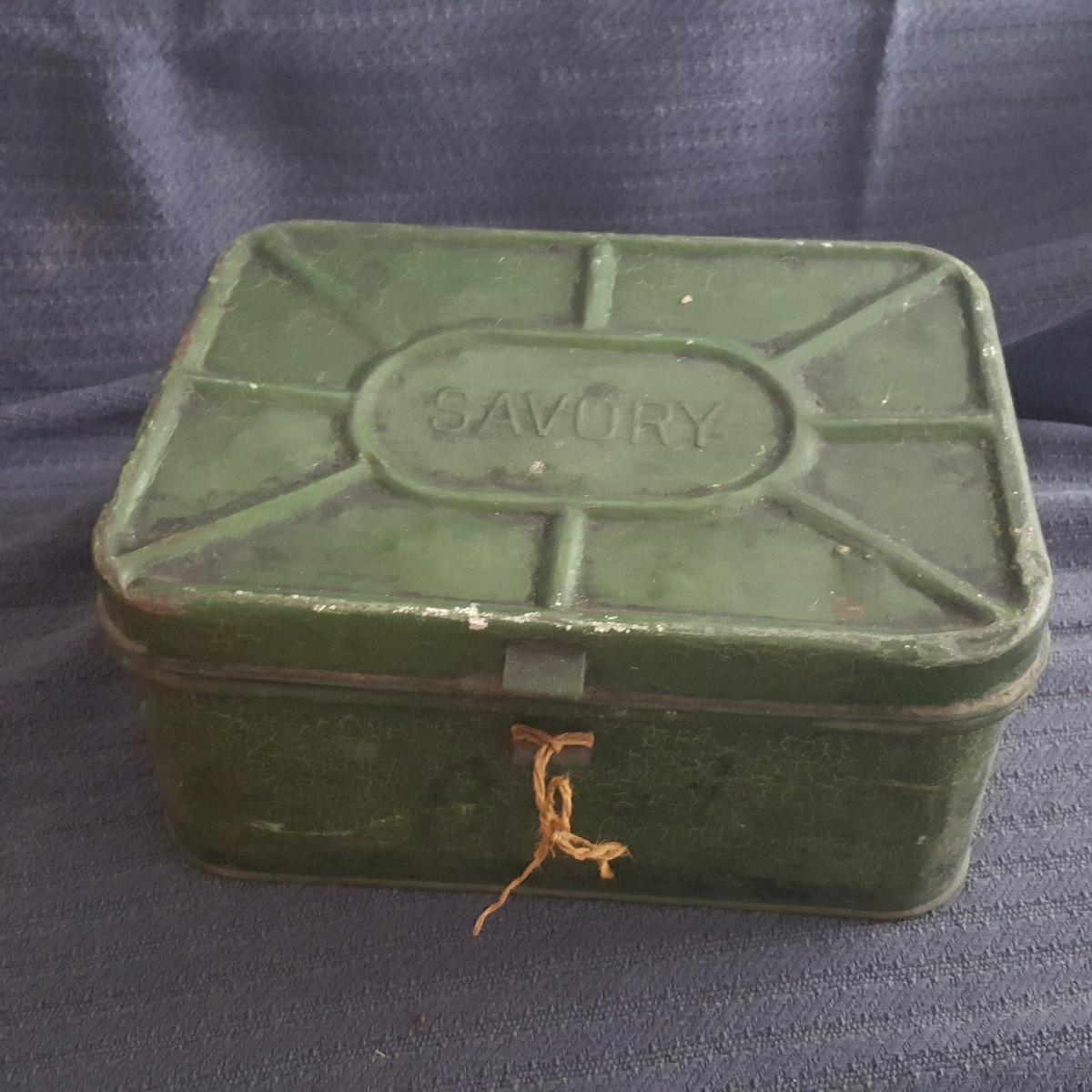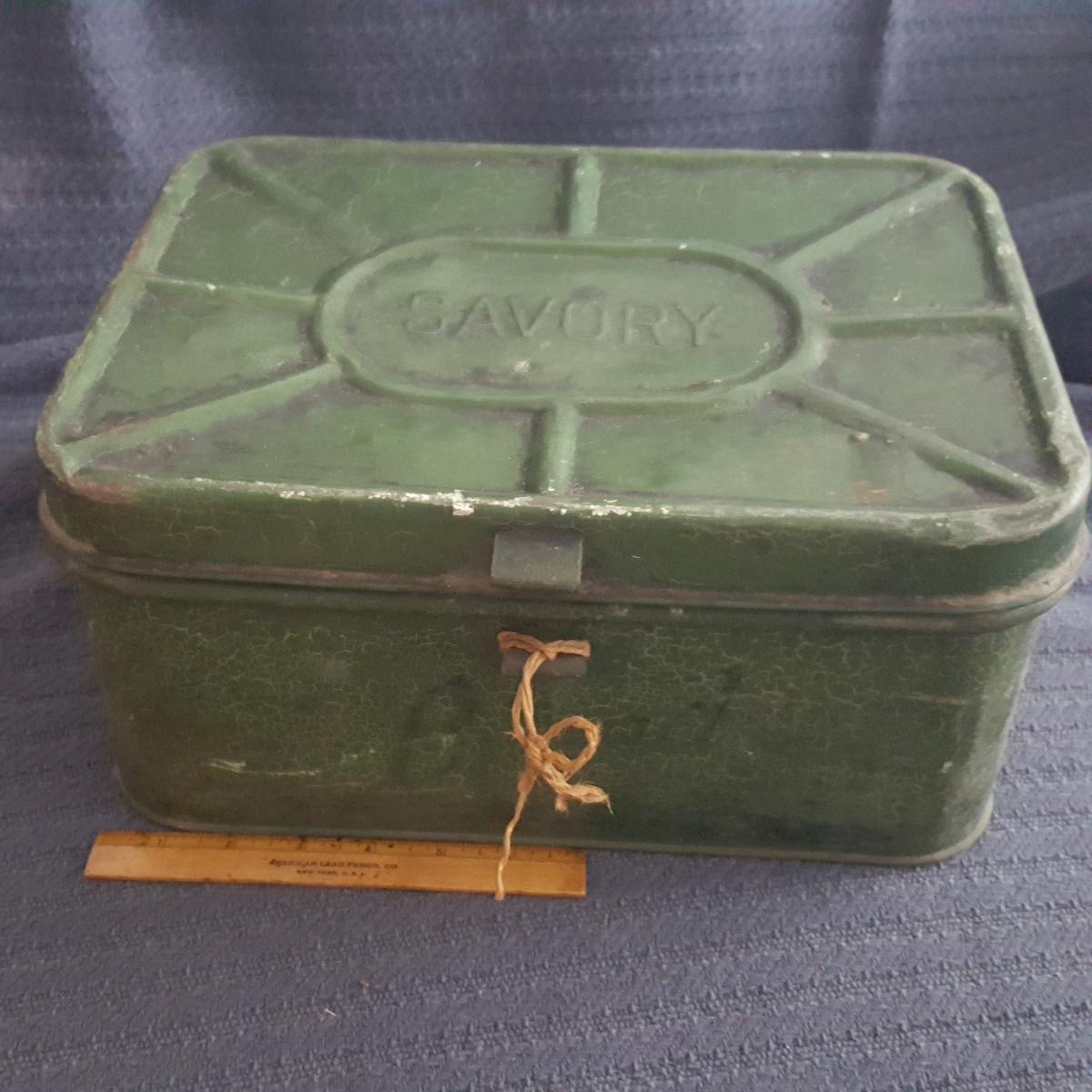 This auction lot is for a Vintage Savory Bread Box. Well used, with appropriate dents, bangs and dings to make it real and a great color. This box measures about 10 X 12 X 6-inches and can be used for just about any old thing. Need one? Here it is, bid high and bid now.