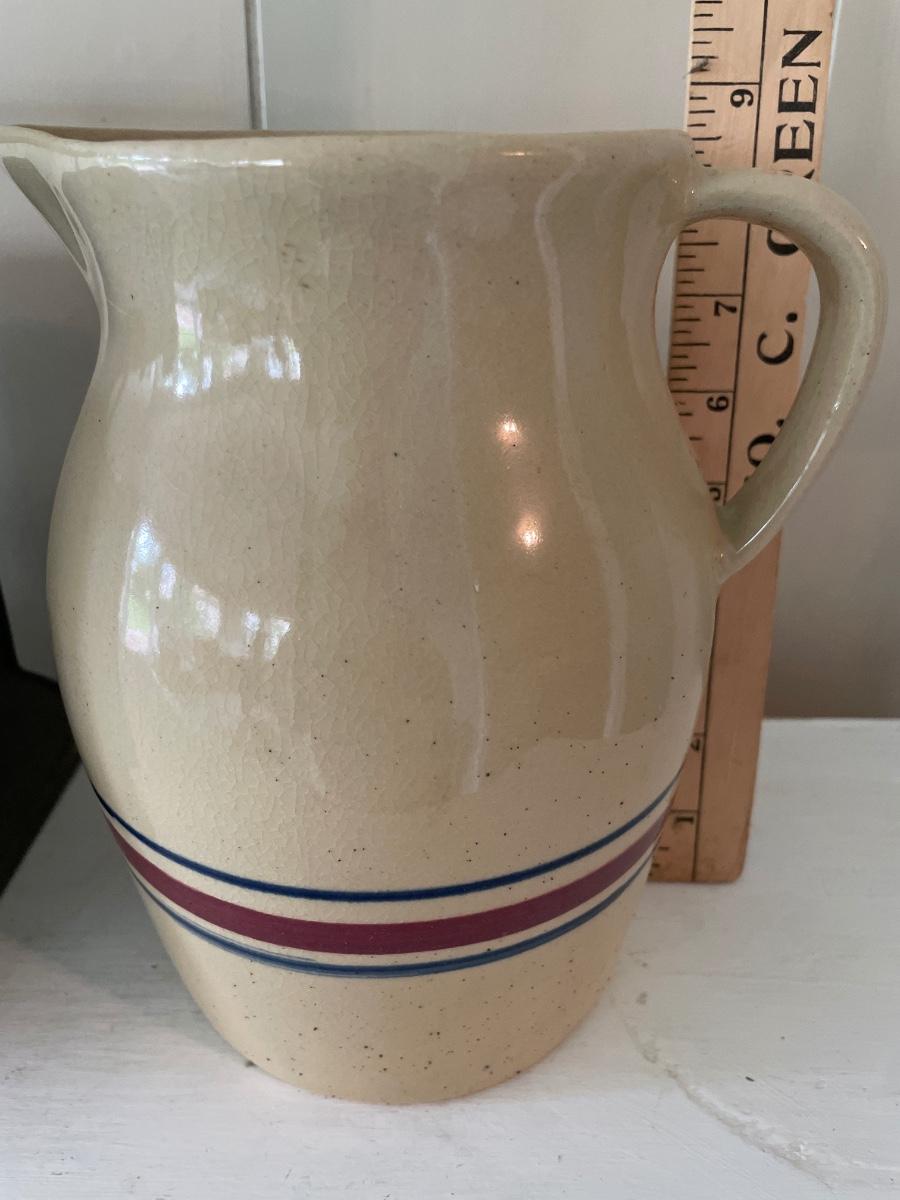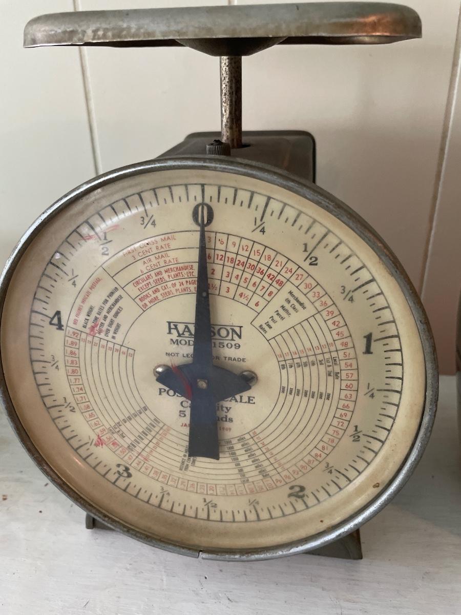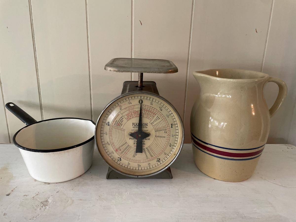 Vintage scale, enamel pot, and Roseville pitcher