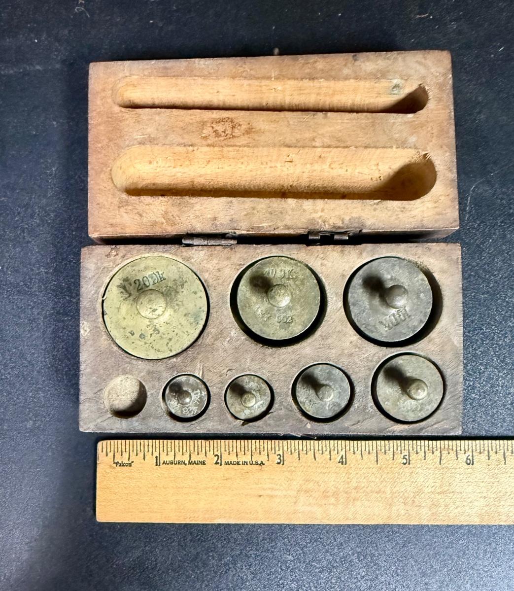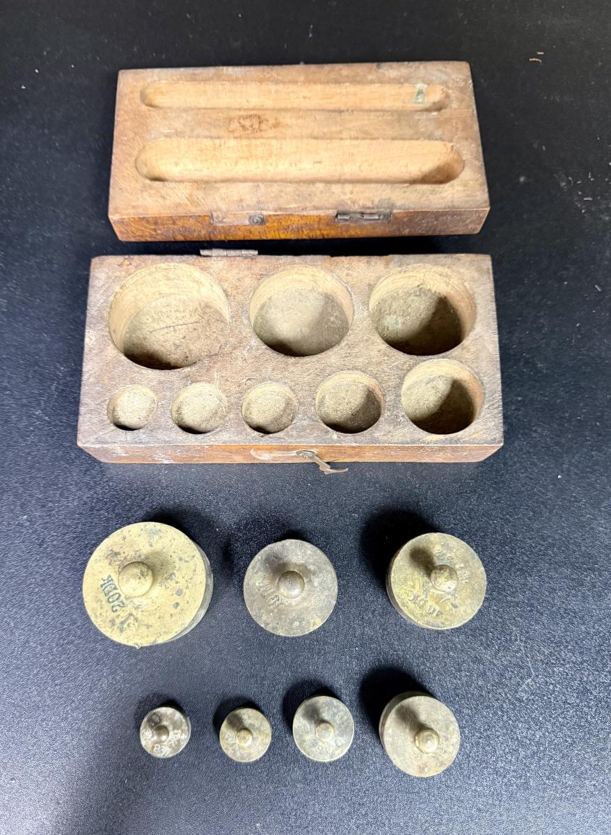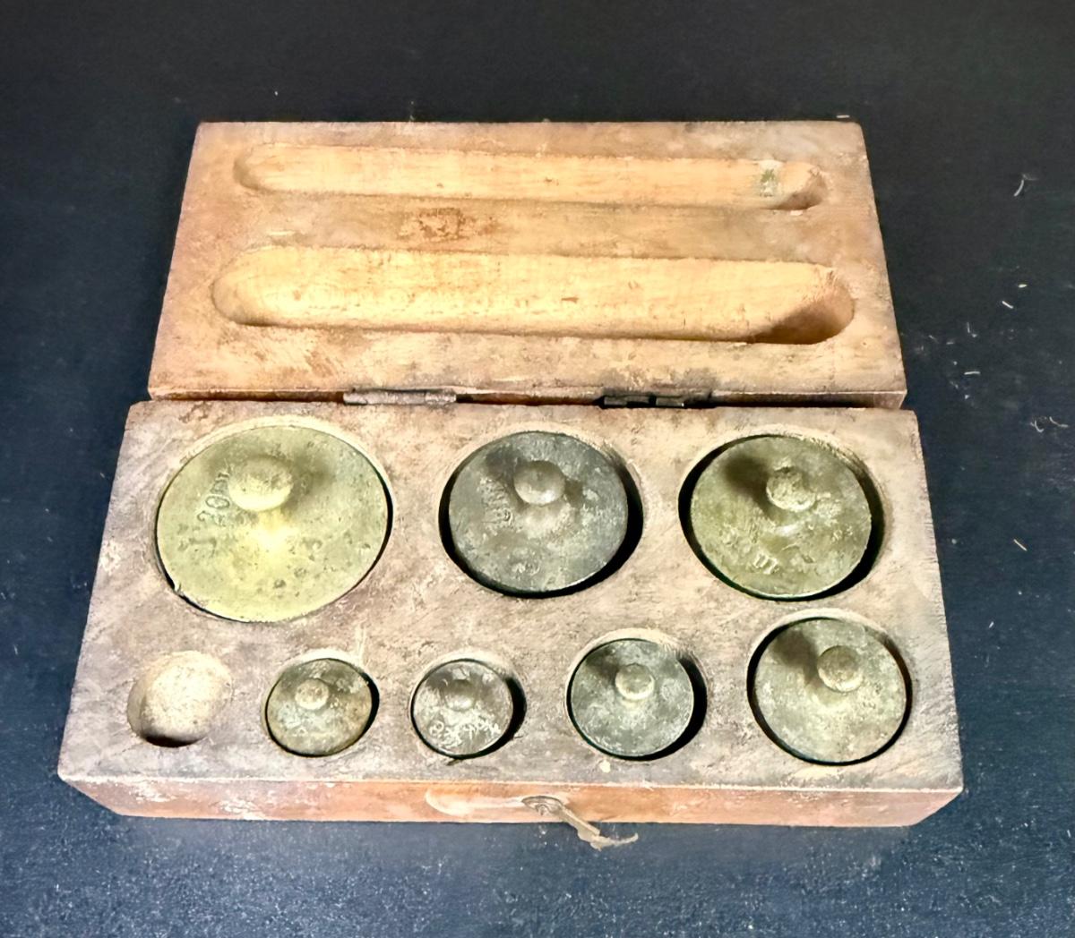 Antique set of brass scale weights in a wooden box. 7 weights are included, the smallest one is missing. Box hinge is broken.