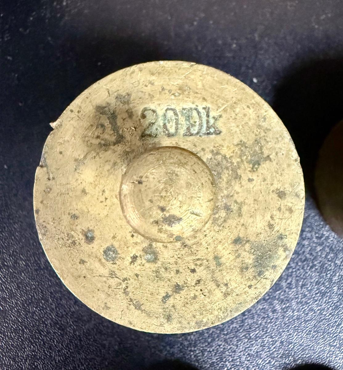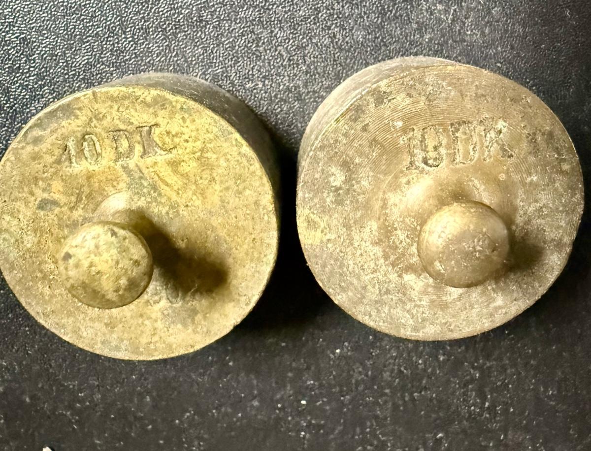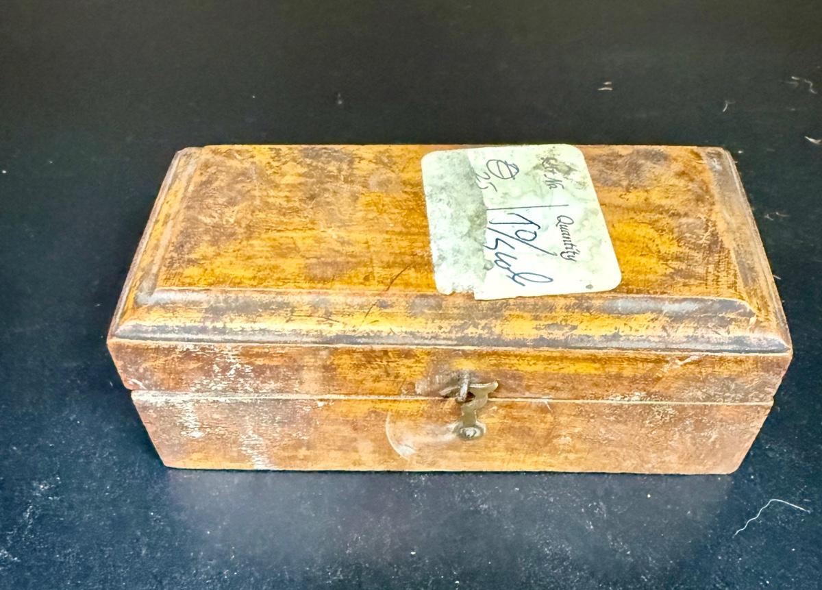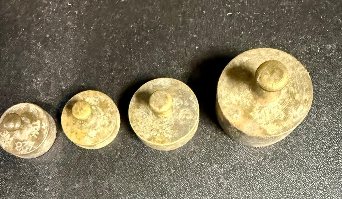Antique set of brass scale weights in a wooden box. 7 weights are included, the smallest one is missing. Box hinge is broken.