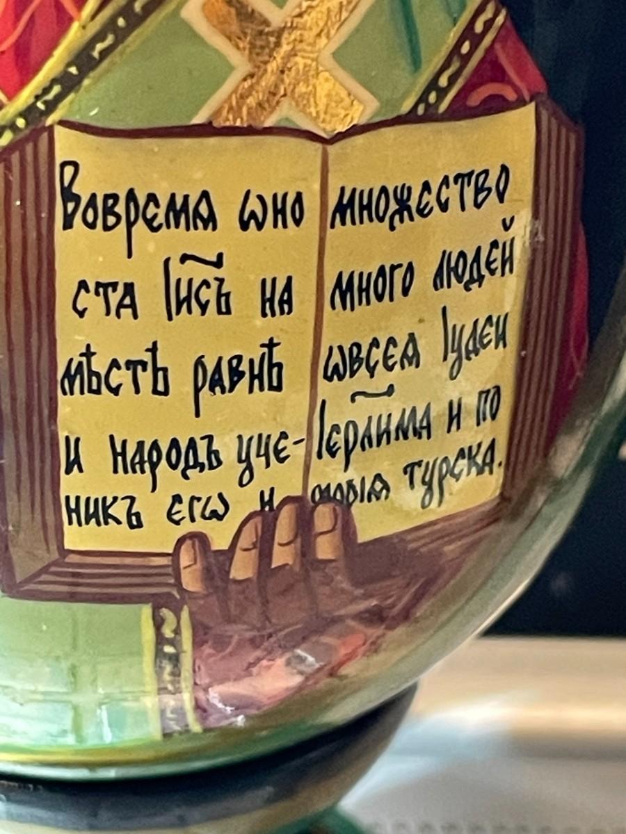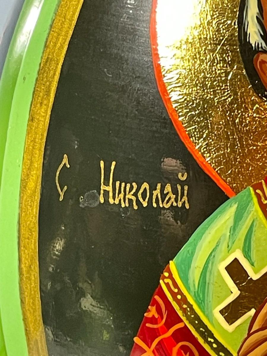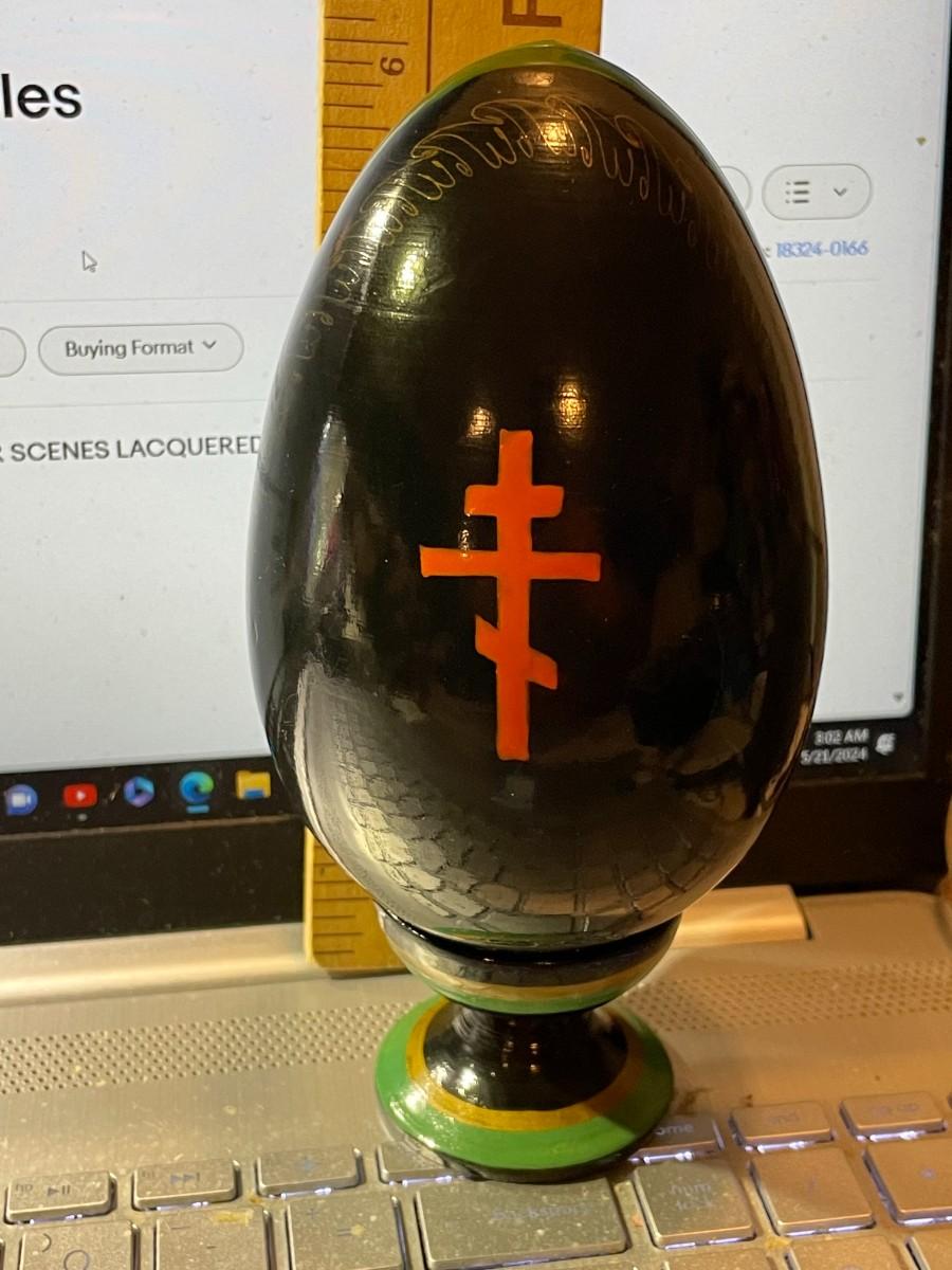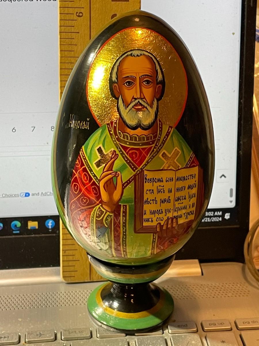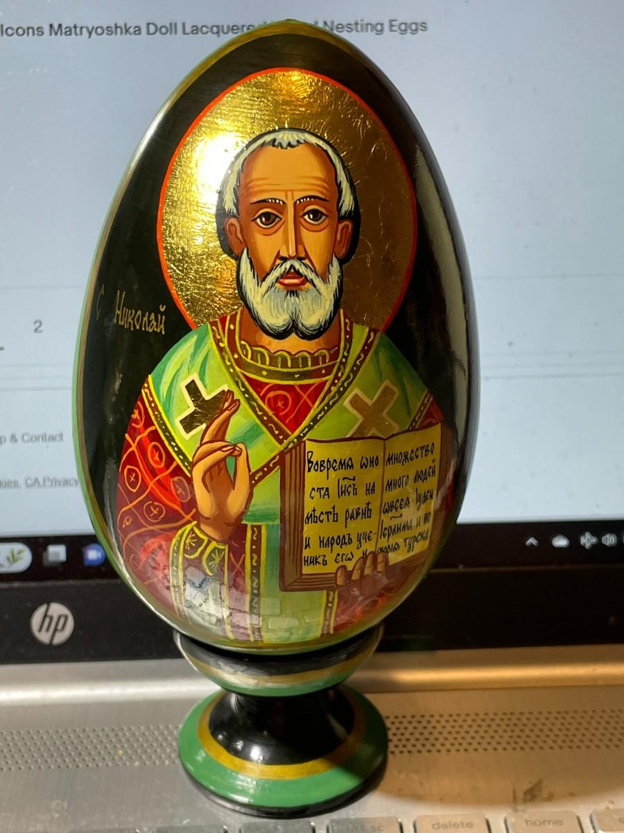 Vintage Scarce Artist Signed RUSSIAN Religious Orthodox Hand Painted Lacquered Wooden Egg Approx 6" Tall w/Stand in VG Preowned Condition. $8 Domestic Shipping.