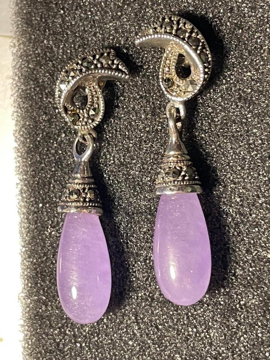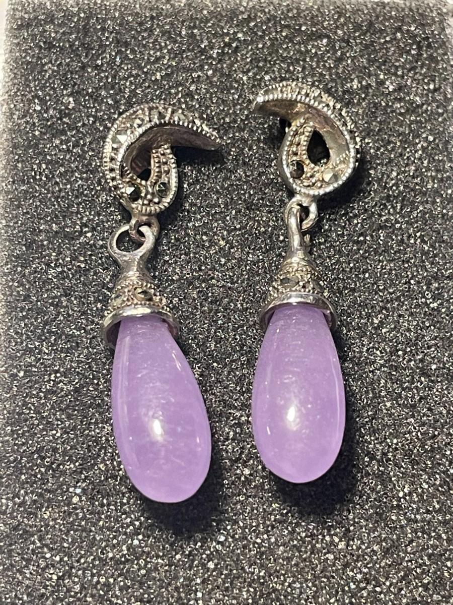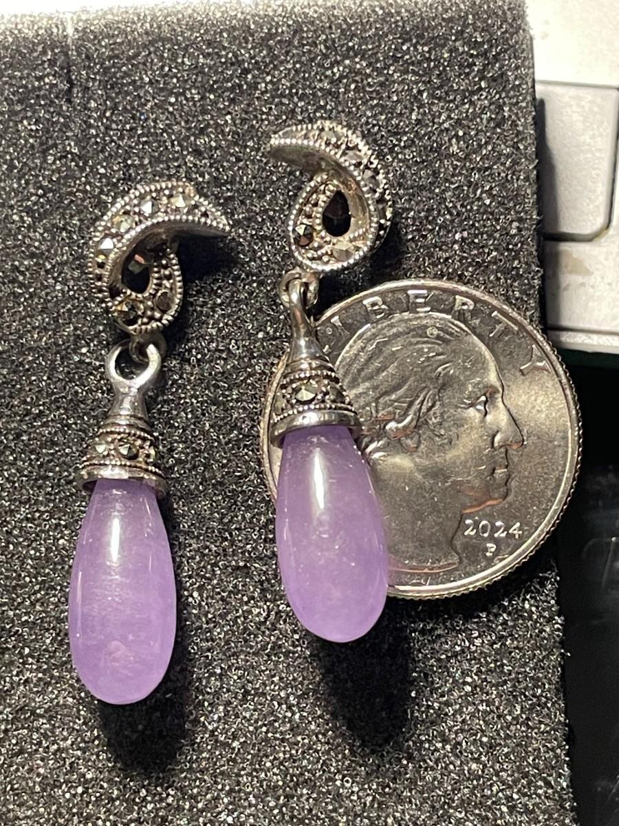 Vintage Scarce Chinese Export Lavender Jadeite Sterling Silver Marcasite Dangling Earrings in VG Preowned Condition. $5 DOMESTIC SHIPPING.