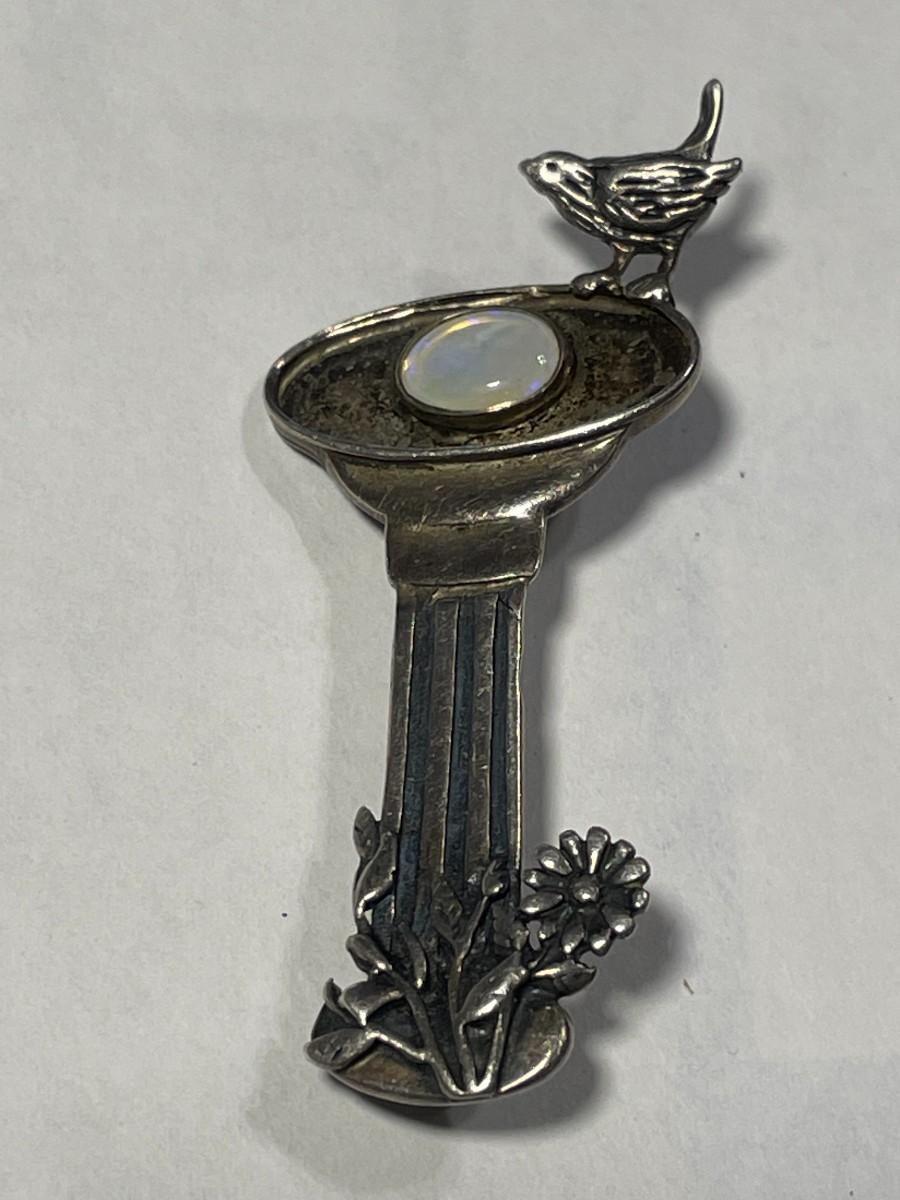 Vintage Scarce Sterling Silver Bird Bath Pin 2" Tall with Opalescence Stone in Good Preowned Condition. $5 DOMESTIC SHIPPING.