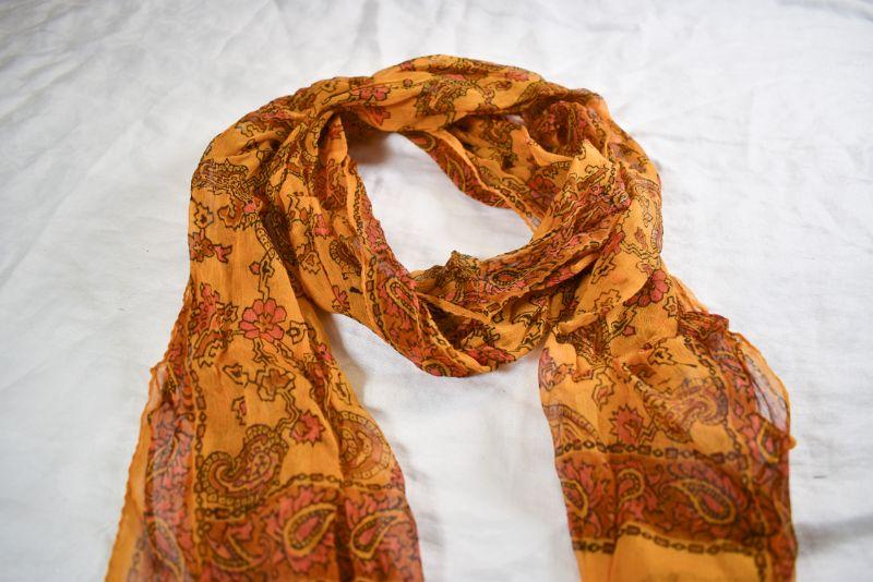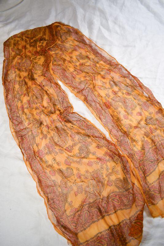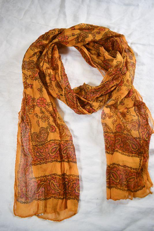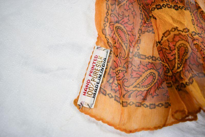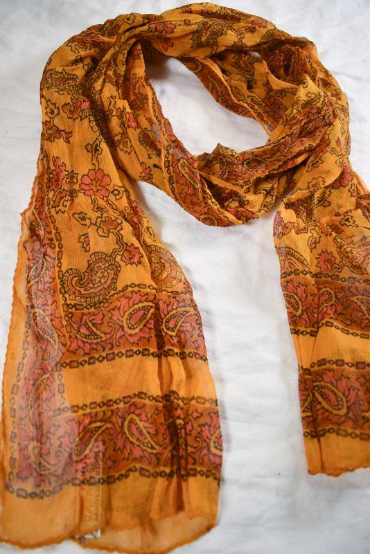 Silk scarf hand printed in India. Beautiful autumn colors. **Please read Terms and Conditions before placing a bid. Pick up is Sunday, November 24 from 9am to 3pm or Tuesday, November 26 from 4pm-7pm in Mantua, NJ. All sales are final. All sales are as is, where is. Please review all photos. Any props included in photos are not included in listing. All measurements are approximate.