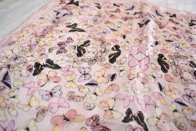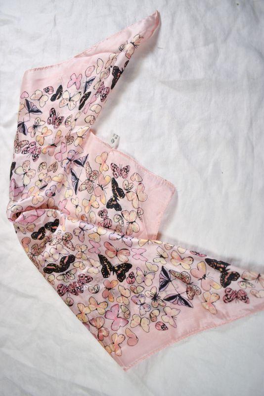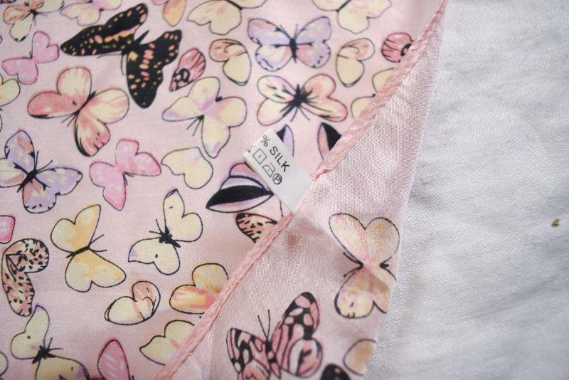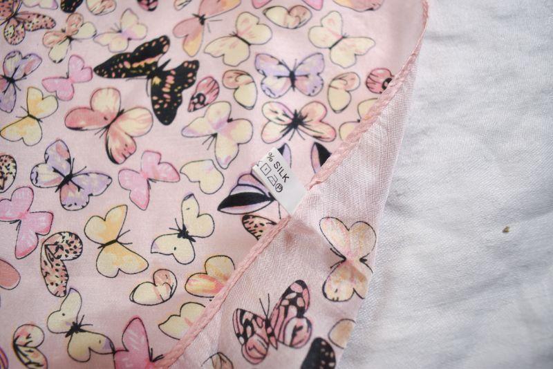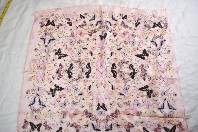 Silk scarf has a pink field of butterflies. **Please read Terms and Conditions before placing a bid. Pick up is Sunday, November 24 from 9am to 3pm or Tuesday, November 26 from 4pm-7pm in Mantua, NJ. All sales are final. All sales are as is, where is. Please review all photos. Any props included in photos are not included in listing. All measurements are approximate.