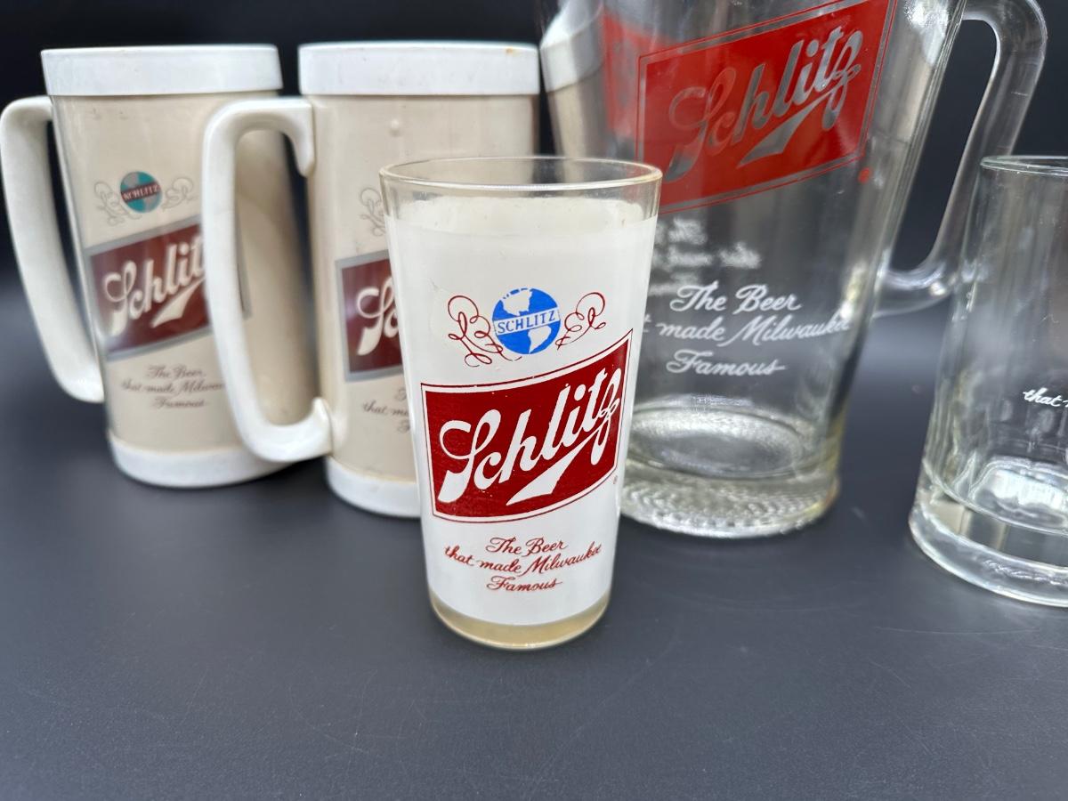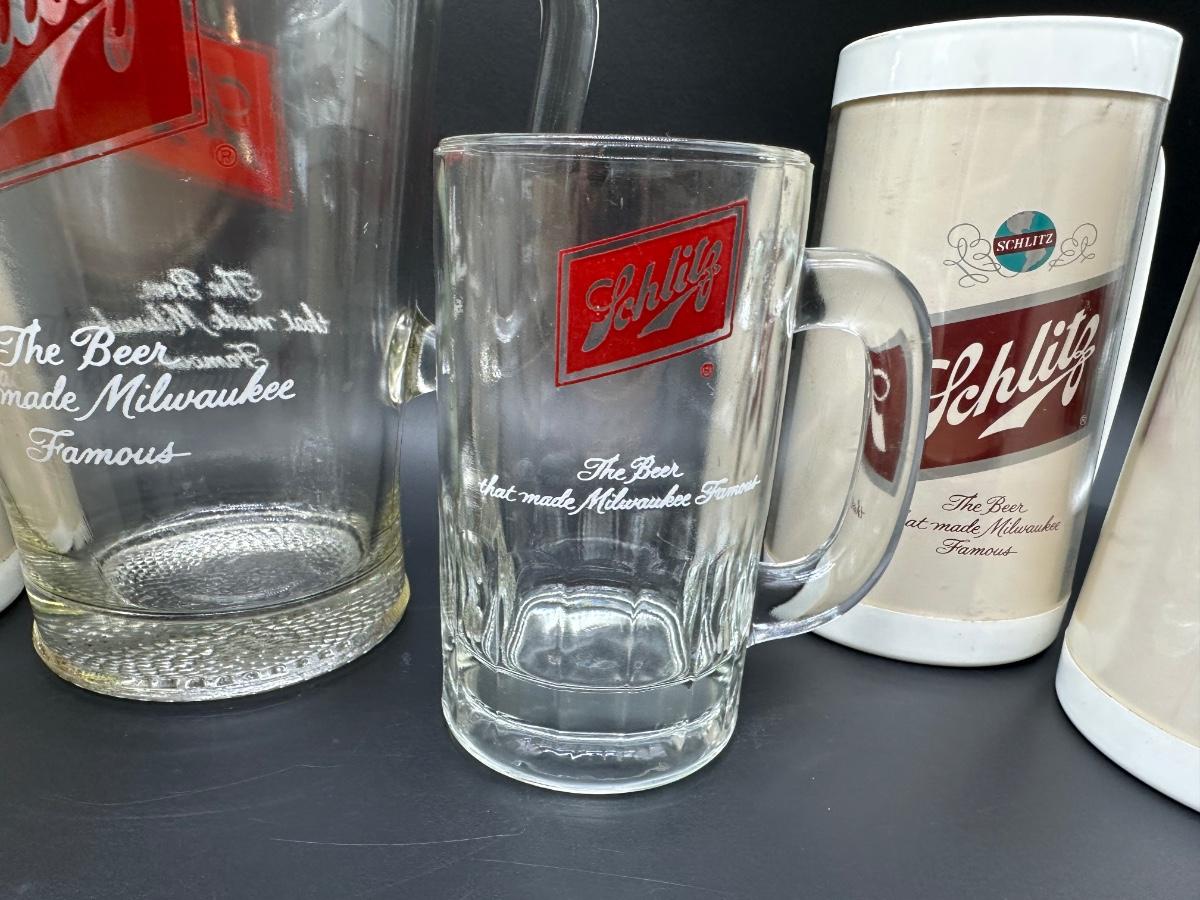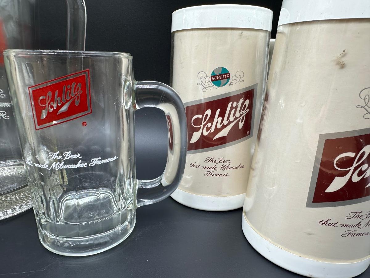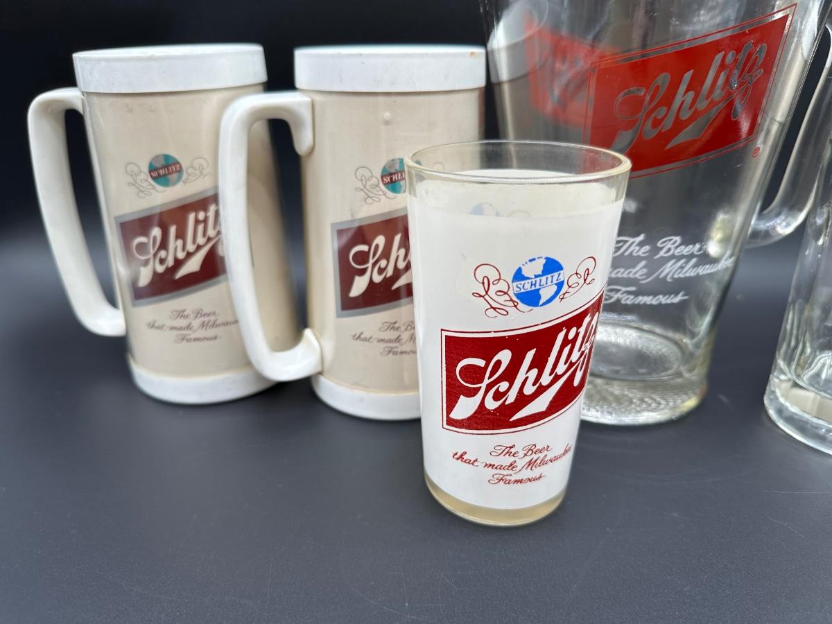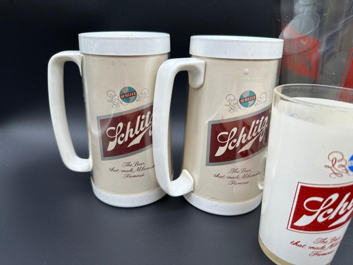 Vintage Schlitz Beer Barware Lot – Pitcher, Glass Mug, Tumblers & Plastic Steins