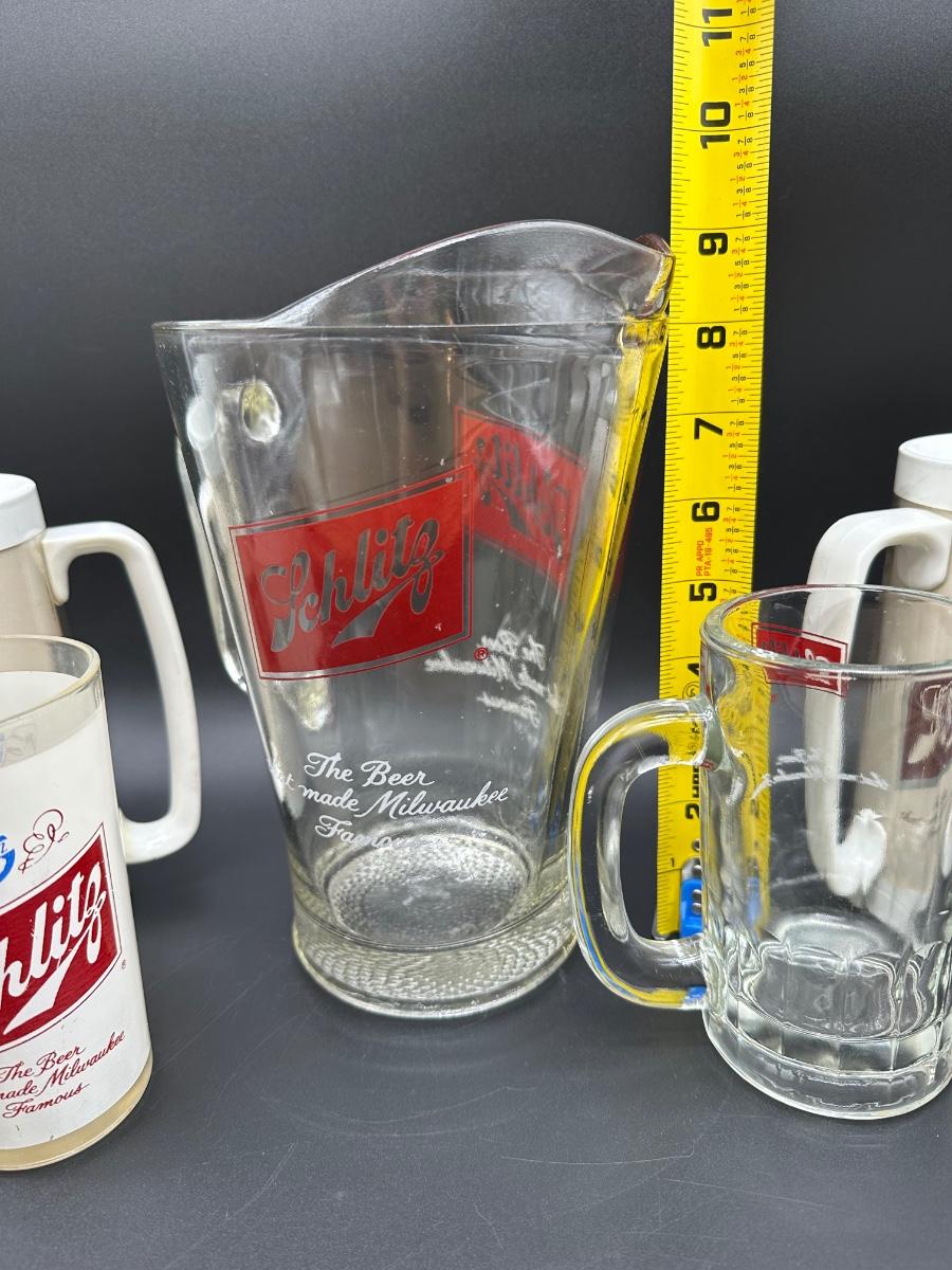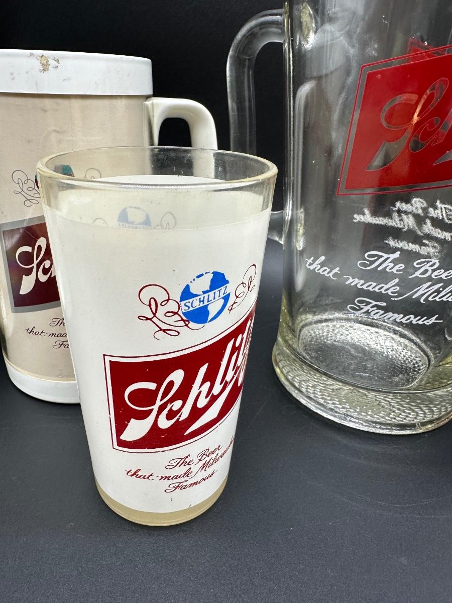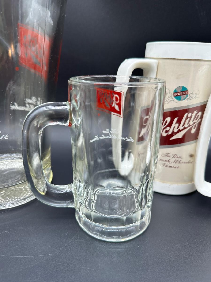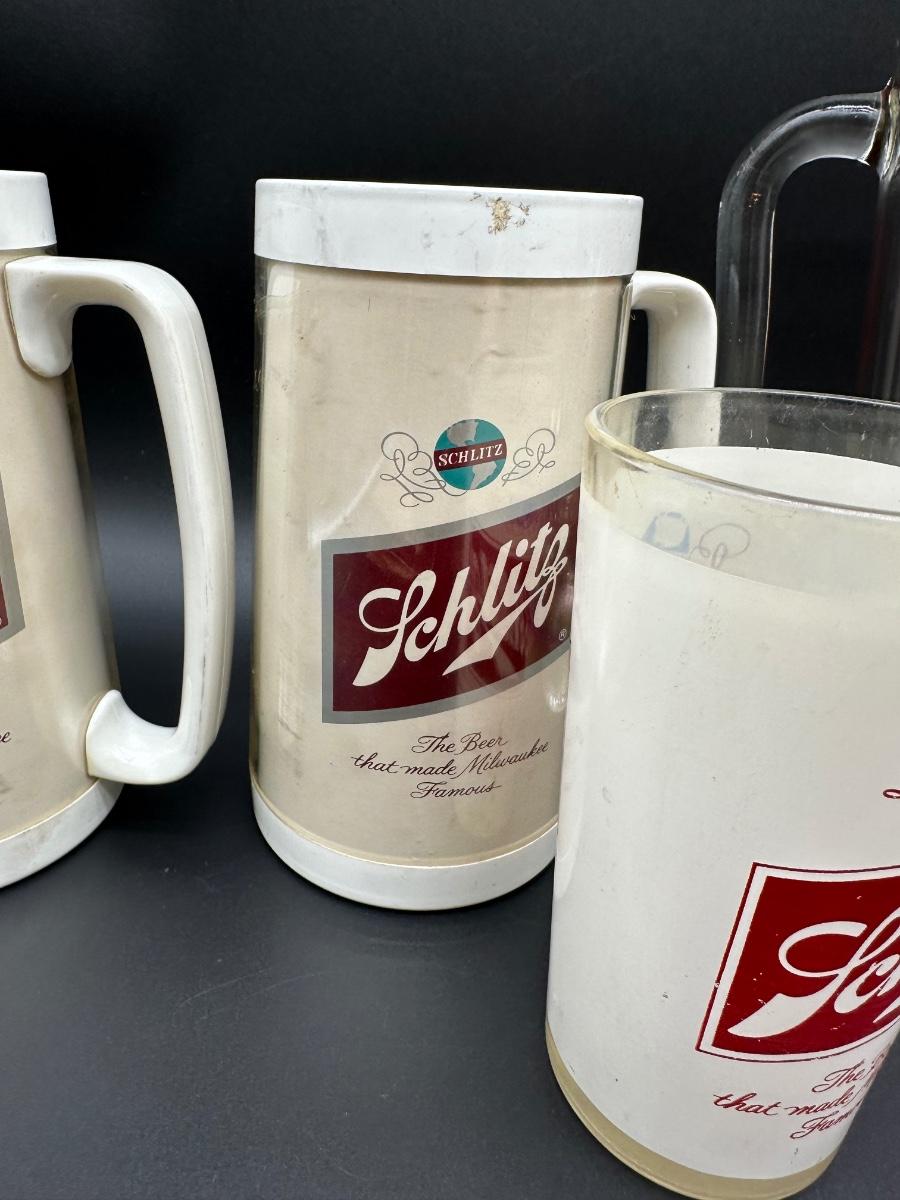 Vintage Schlitz Beer Barware Lot – Pitcher, Glass Mug, Tumblers & Plastic Steins
