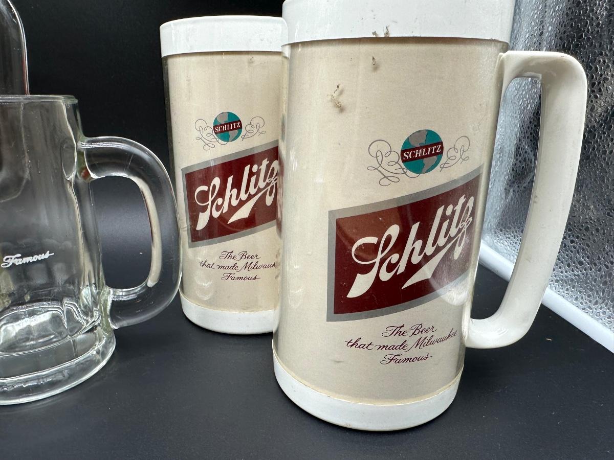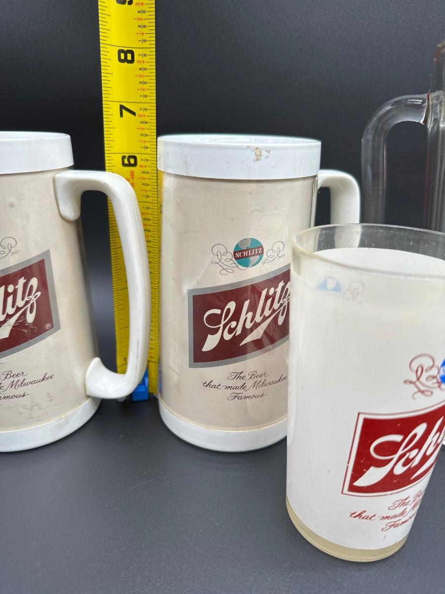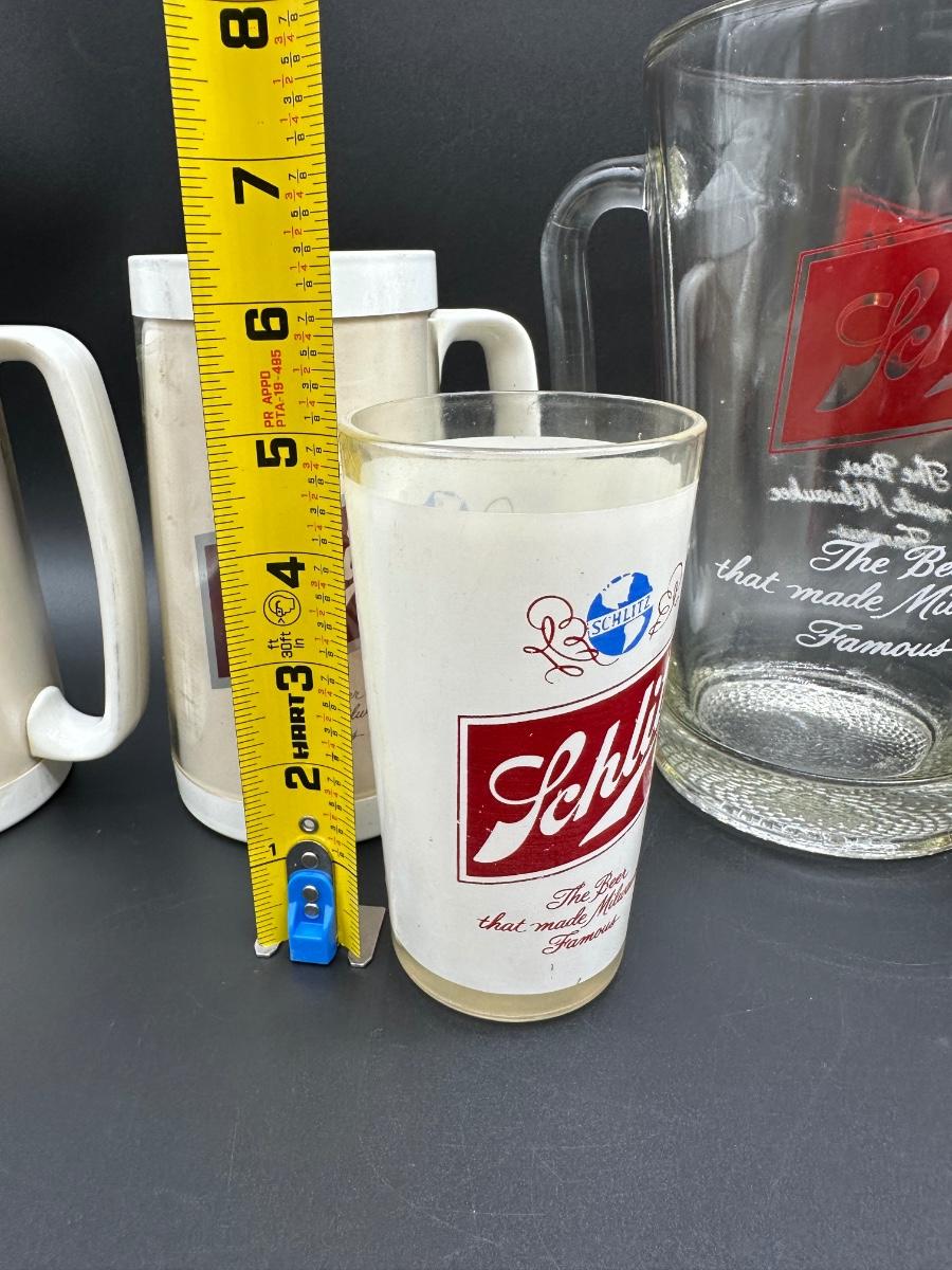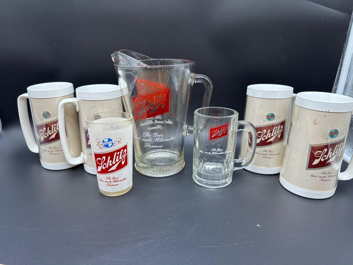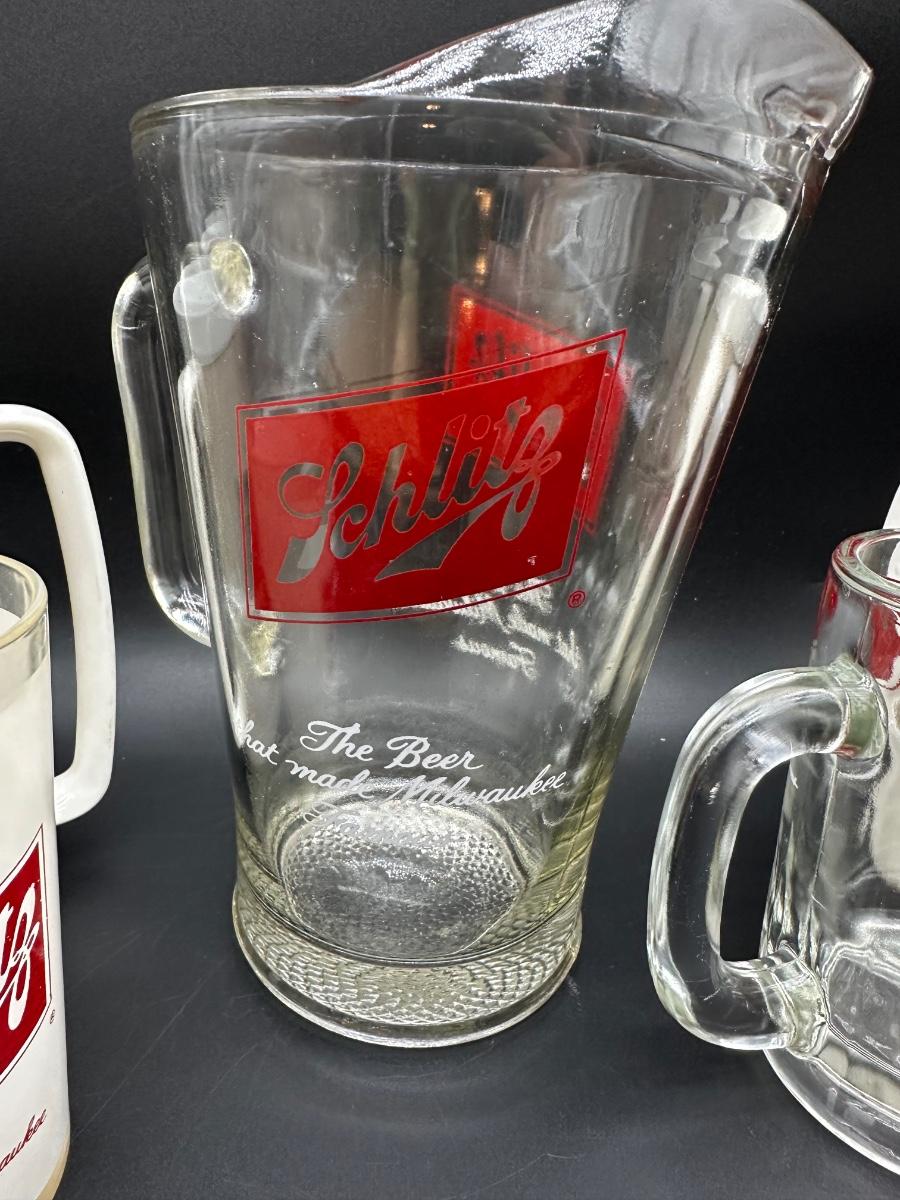 Vintage Schlitz Beer Barware Lot – Pitcher, Glass Mug, Tumblers & Plastic Steins