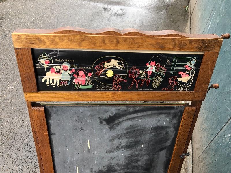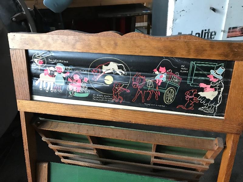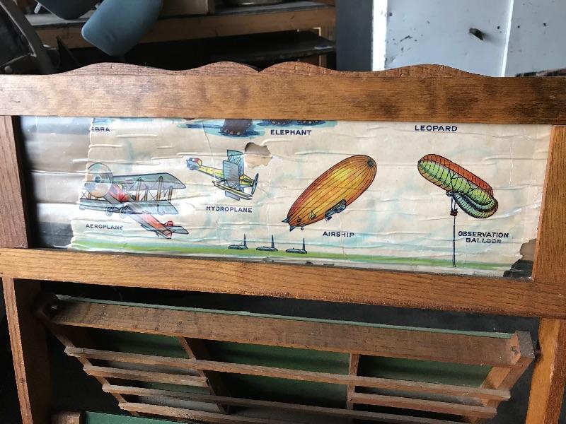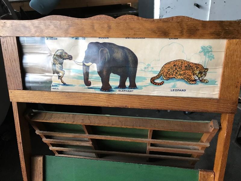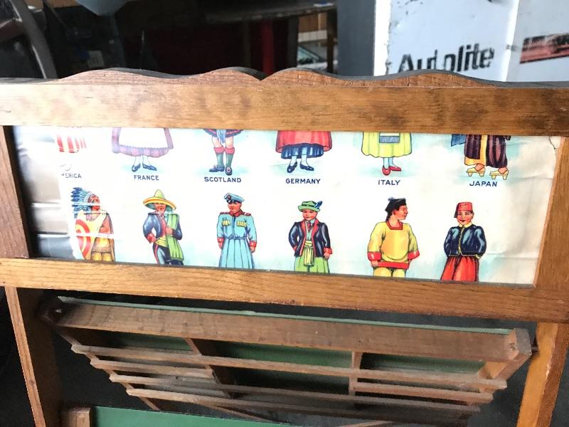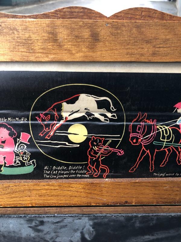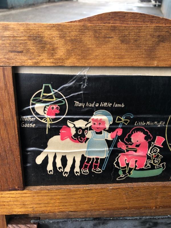 The top piece has a scroll that features different scenes including the alphabet, produce, animals, and household goods.