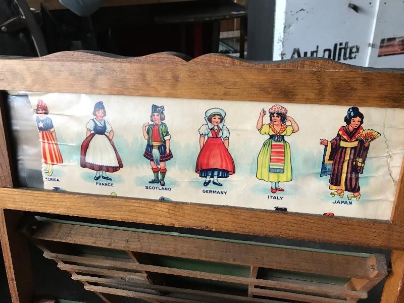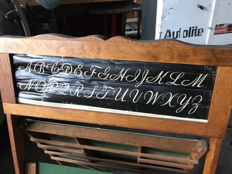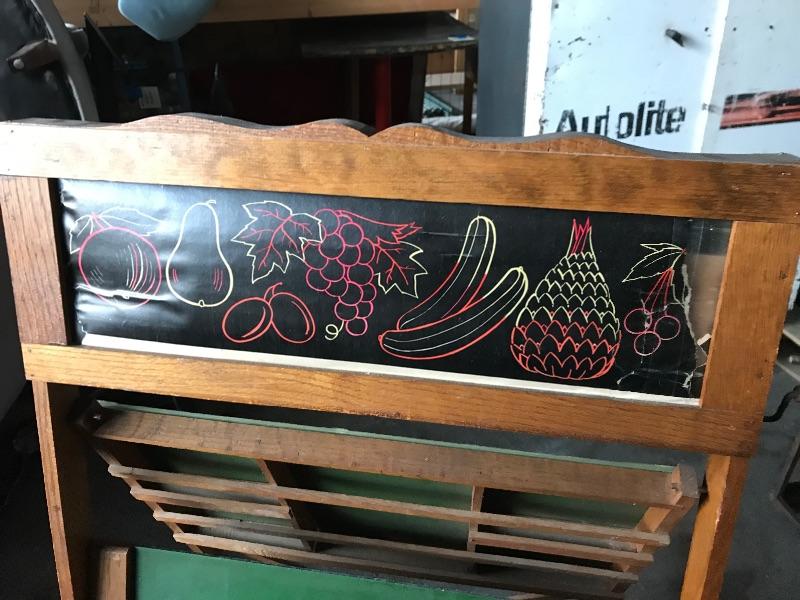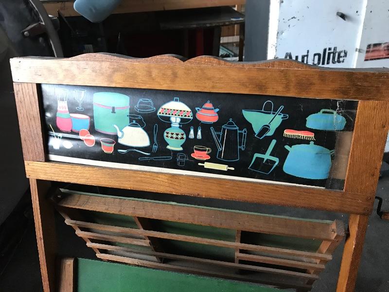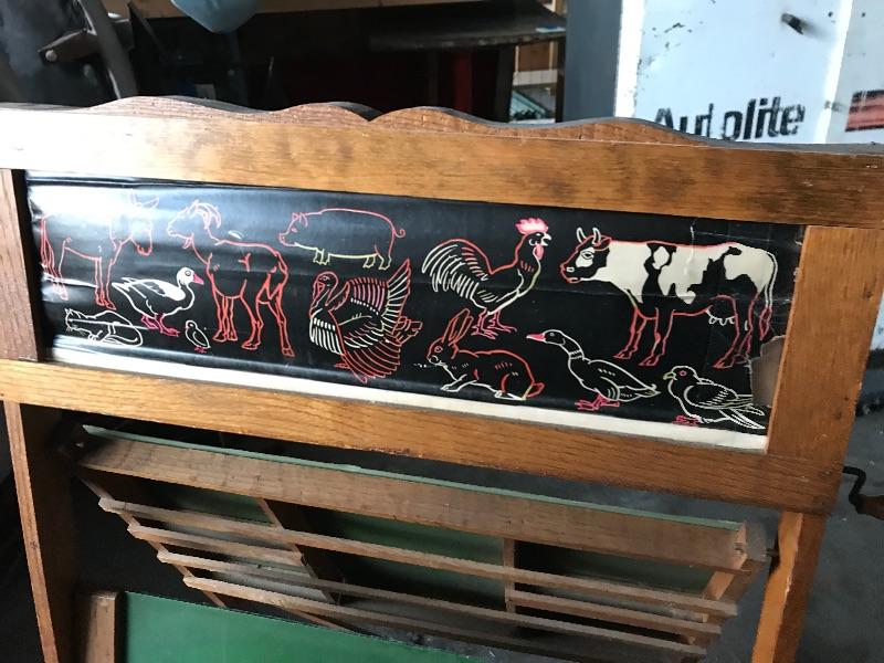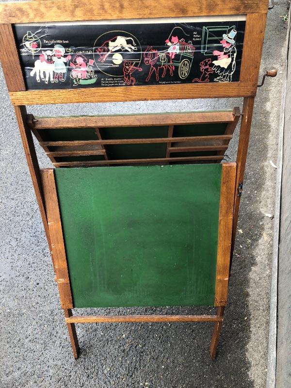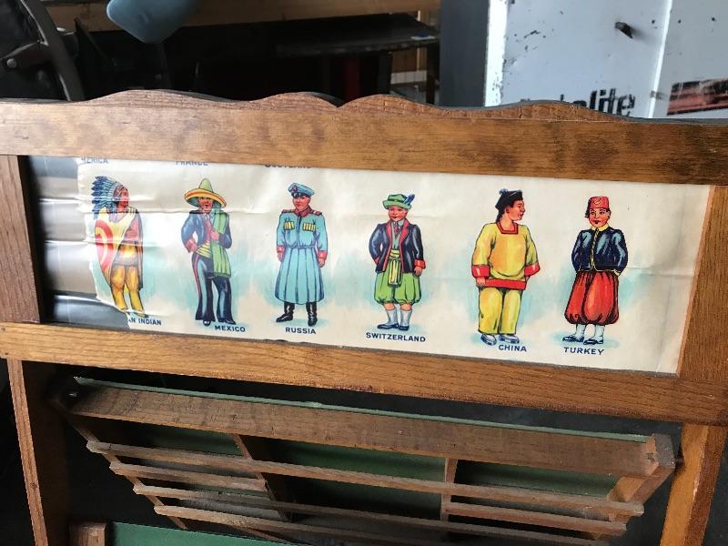 The top piece has a scroll that features different scenes including the alphabet, produce, animals, and household goods.