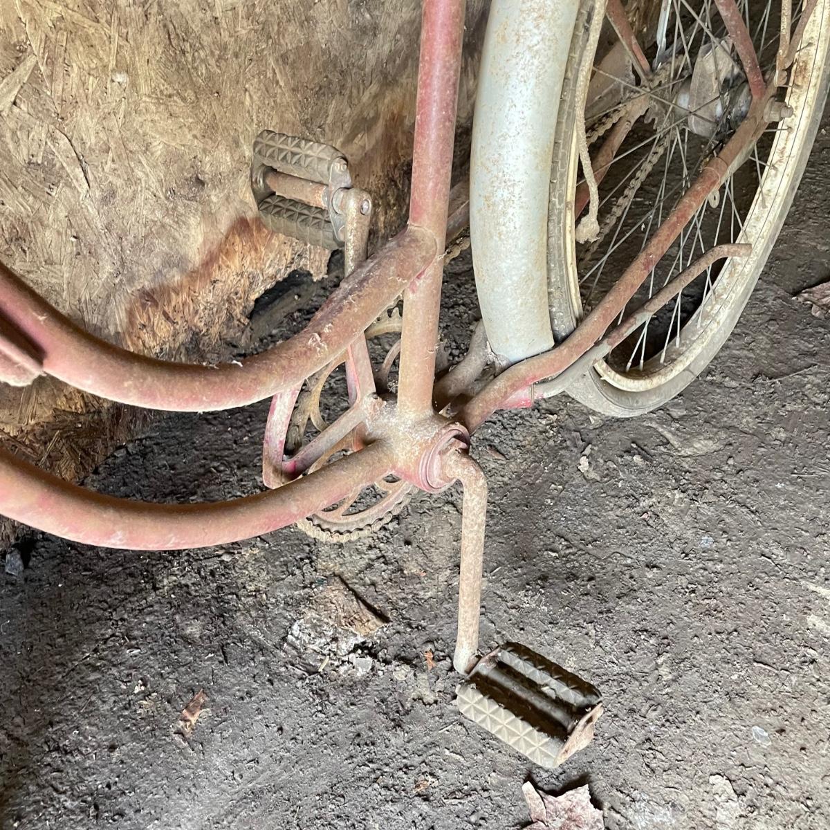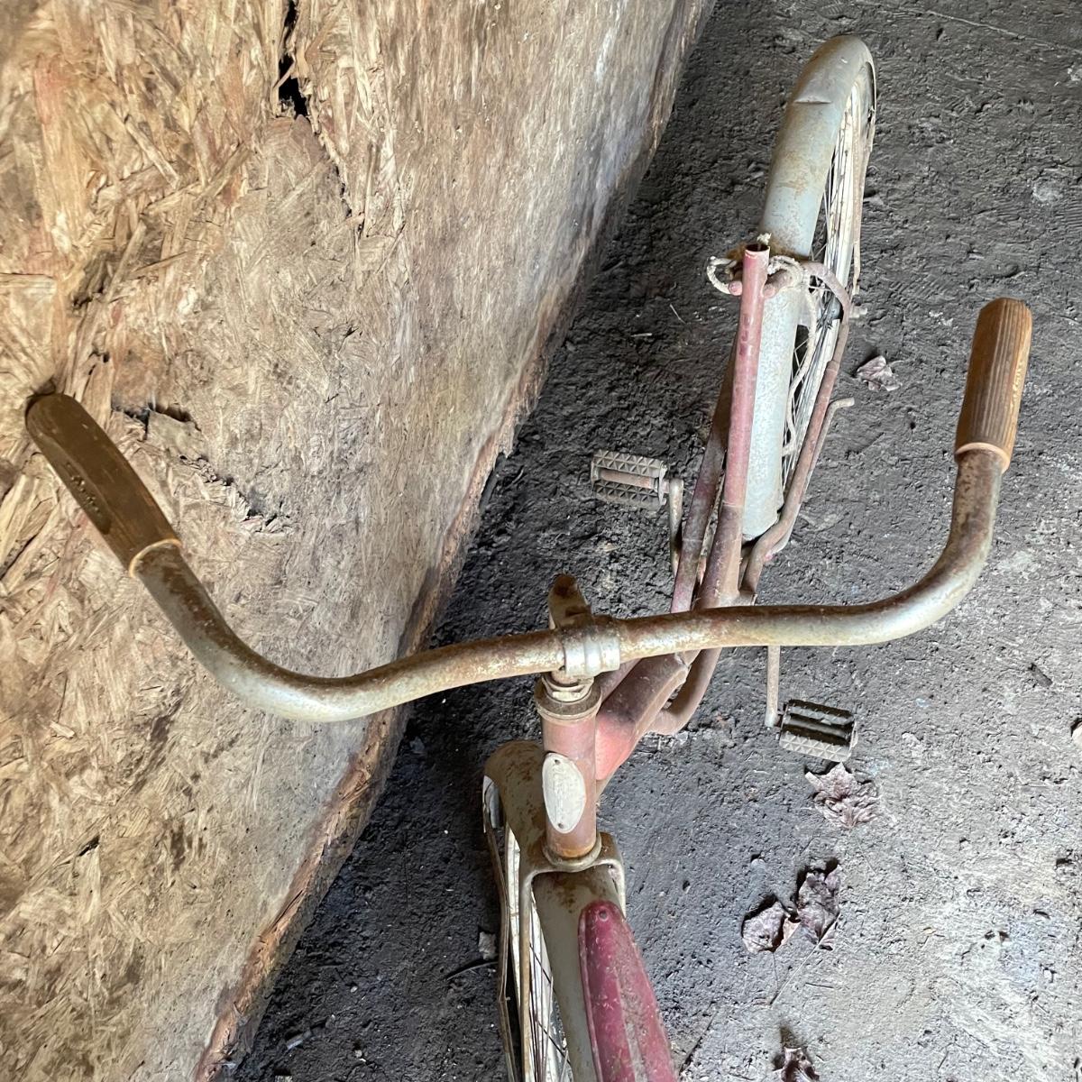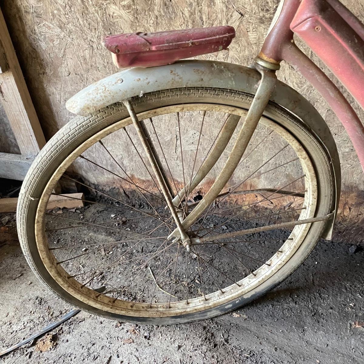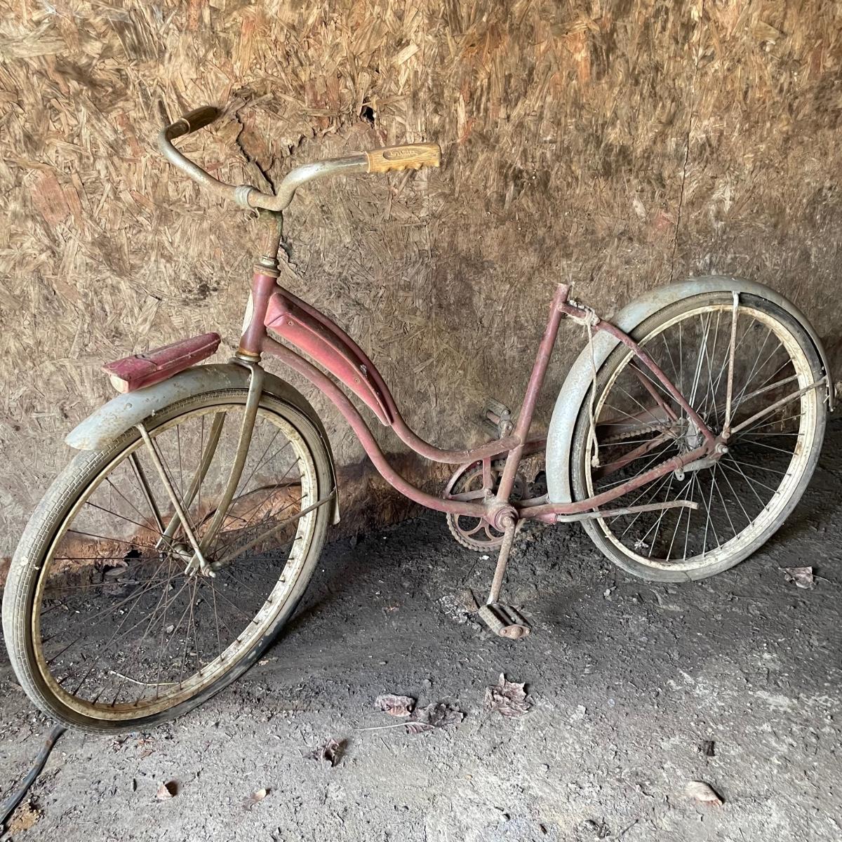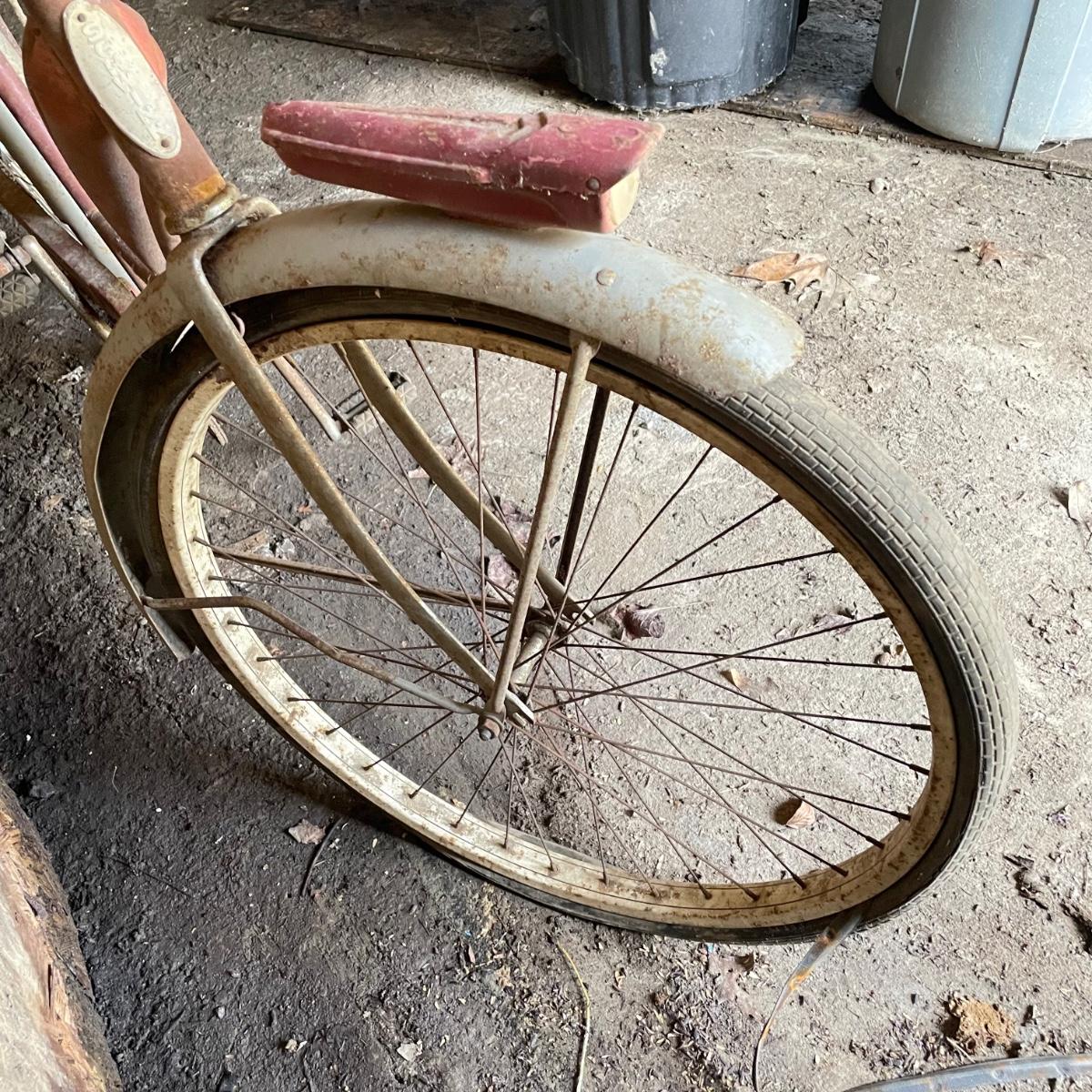 Vintage Schwinn metal bike with reddish paint. Bike is missing it’s chair and needs a lot of work to get it back on working condition, including two new tires and seat. The pedals move the chain, but we were unable to test how well it works. The handlebars and fenders show rust. This piece would be great decor with some cleaning, or a classic ride if refurbished. Bike measures 68” long and the handlebars are 40” high. See images. Local pick up only.