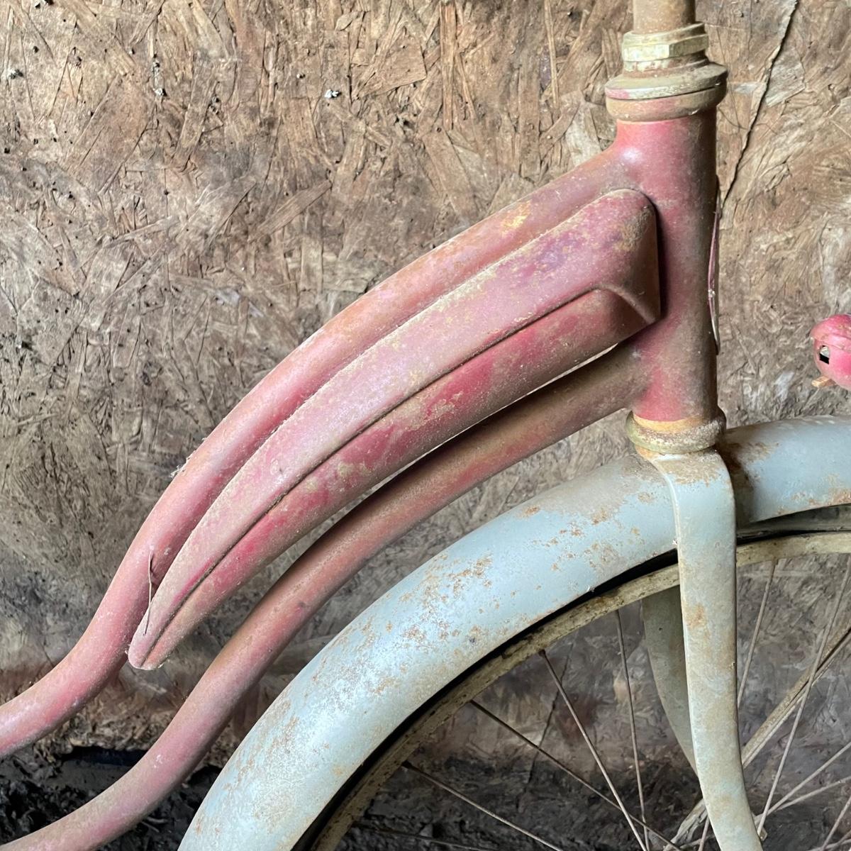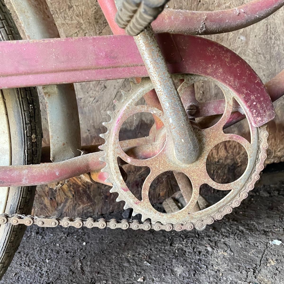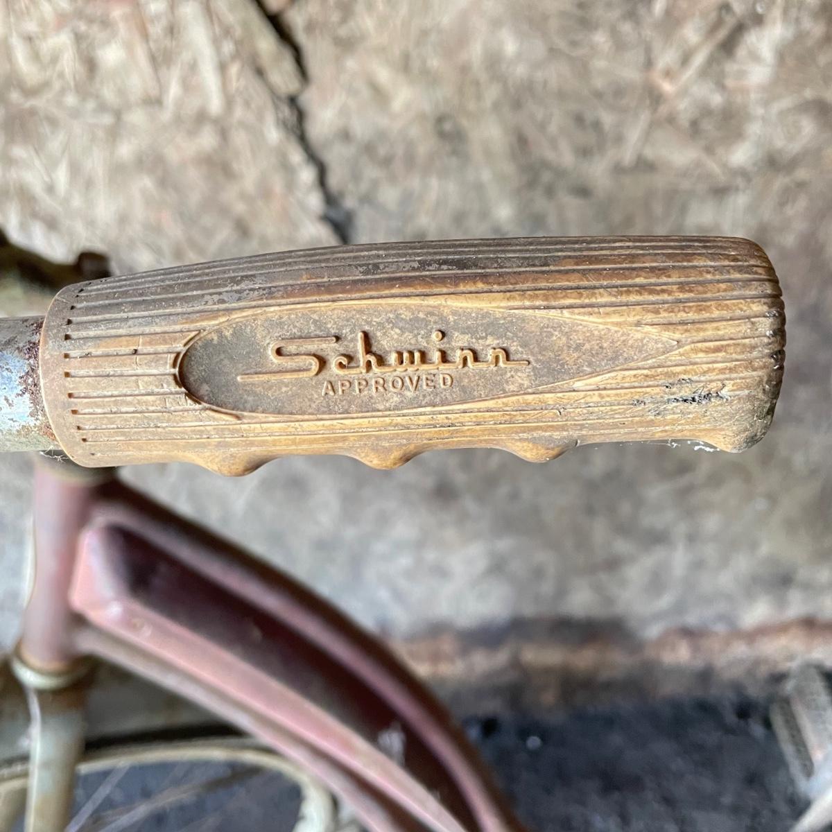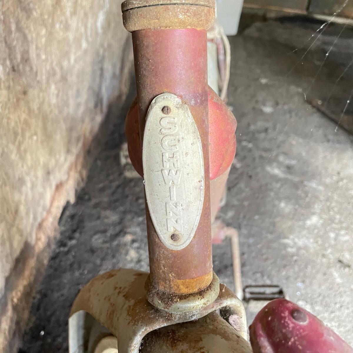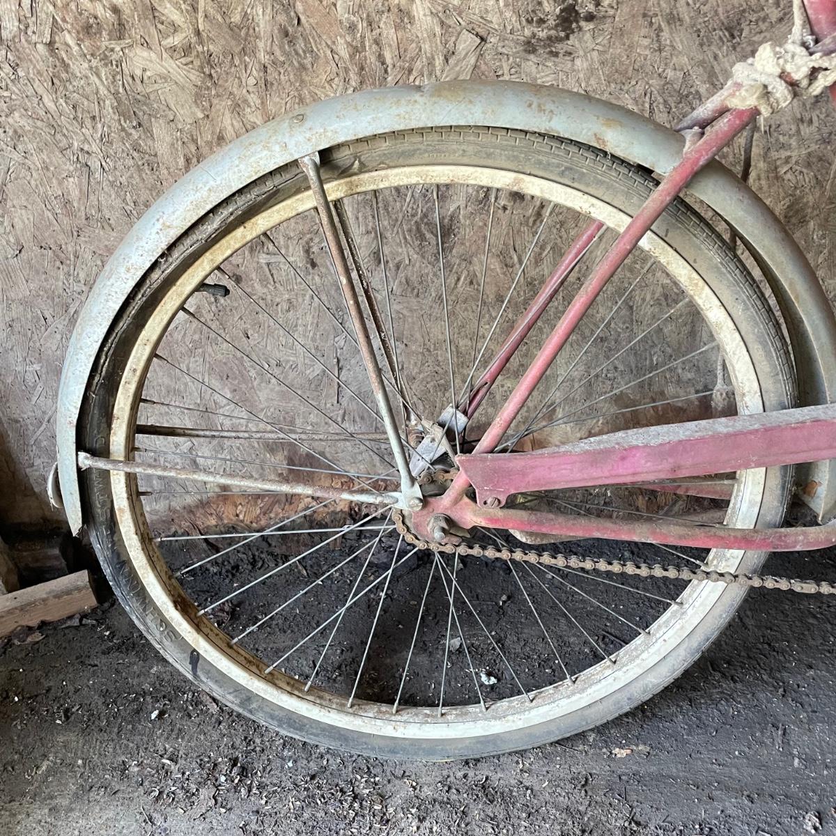 Vintage Schwinn metal bike with reddish paint. Bike is missing it’s chair and needs a lot of work to get it back on working condition, including two new tires and seat. The pedals move the chain, but we were unable to test how well it works. The handlebars and fenders show rust. This piece would be great decor with some cleaning, or a classic ride if refurbished. Bike measures 68” long and the handlebars are 40” high. See images. Local pick up only.