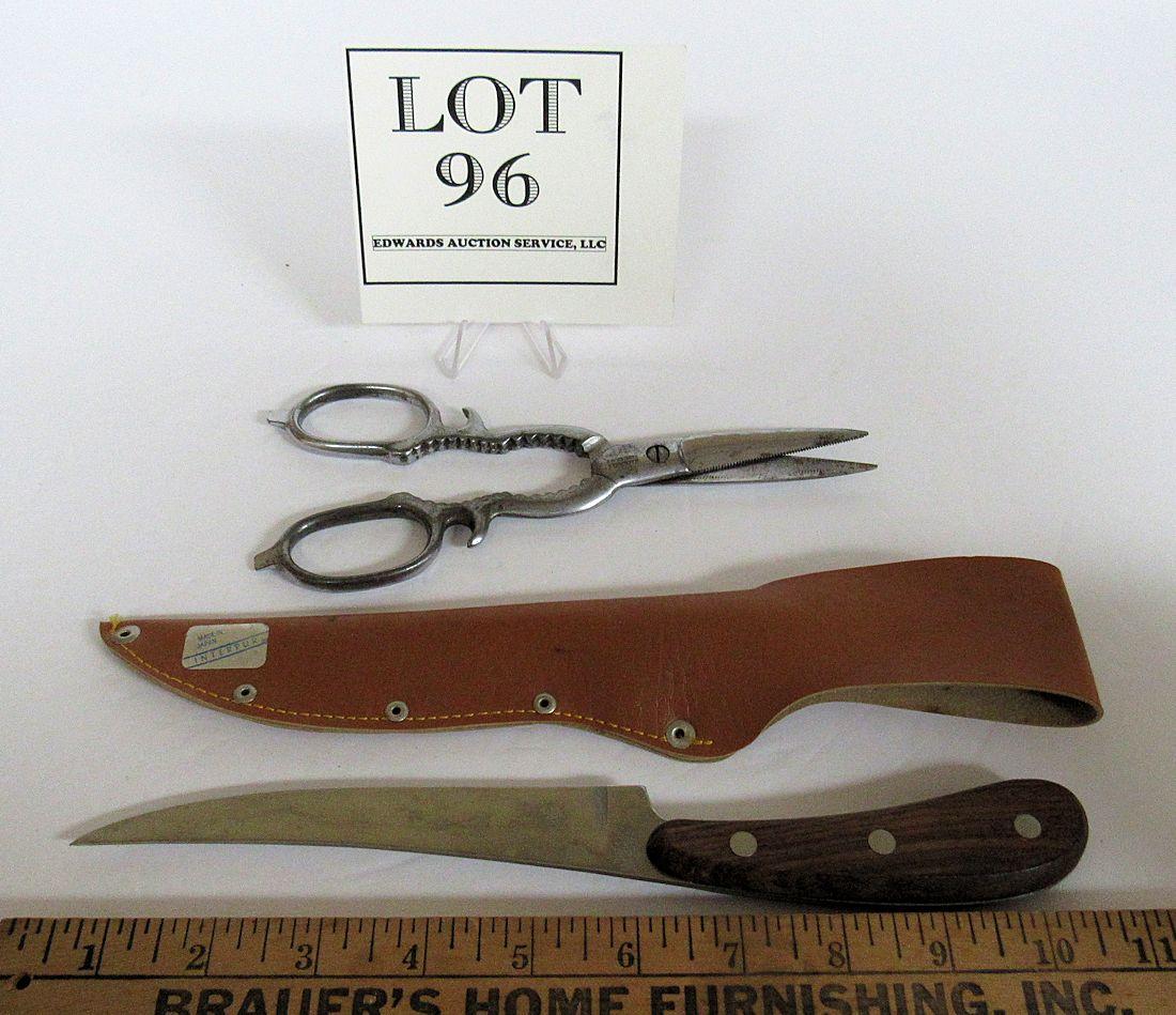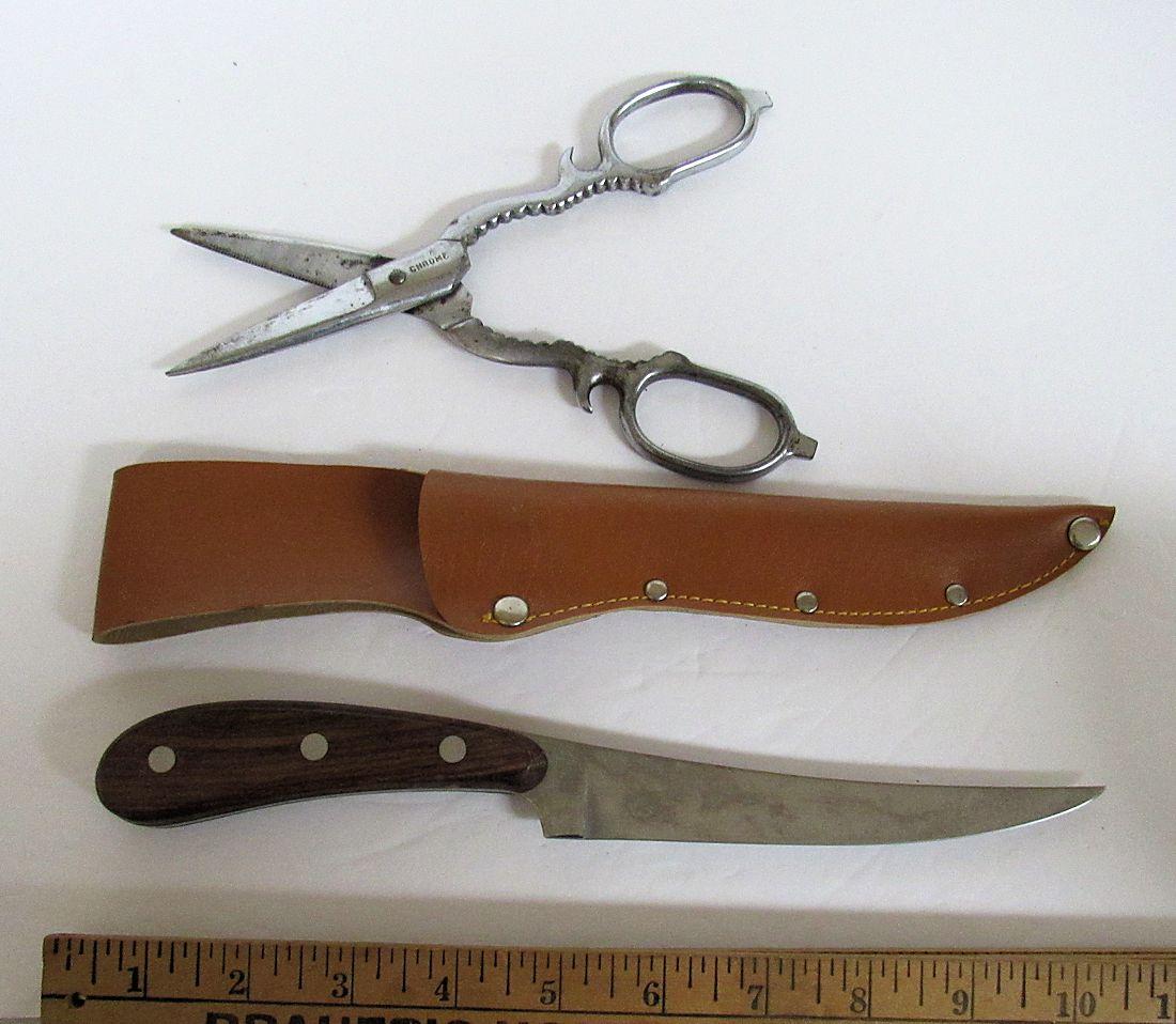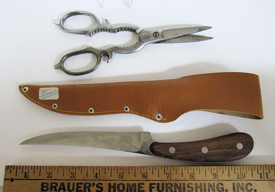 Good condition, some wear on scissors. One side of the scissors says chrome and the other says forged steel, USA. The knife is good. Shipping is available at shipping cost plus $5.00 handling fee on up to 6 lots, $10.00 handling fee on 7 or more lots or two boxes. $15.00 handling fee on 3 boxes. Helps cover shipping materials and labor cost.