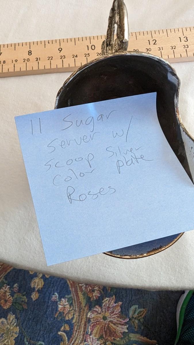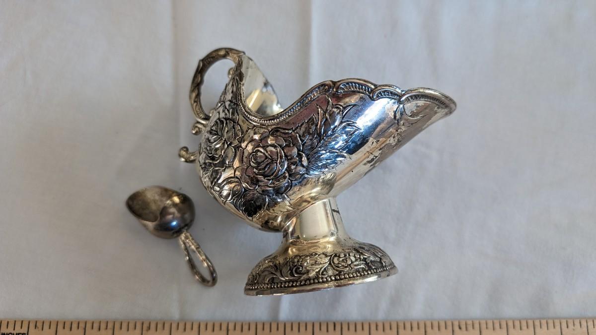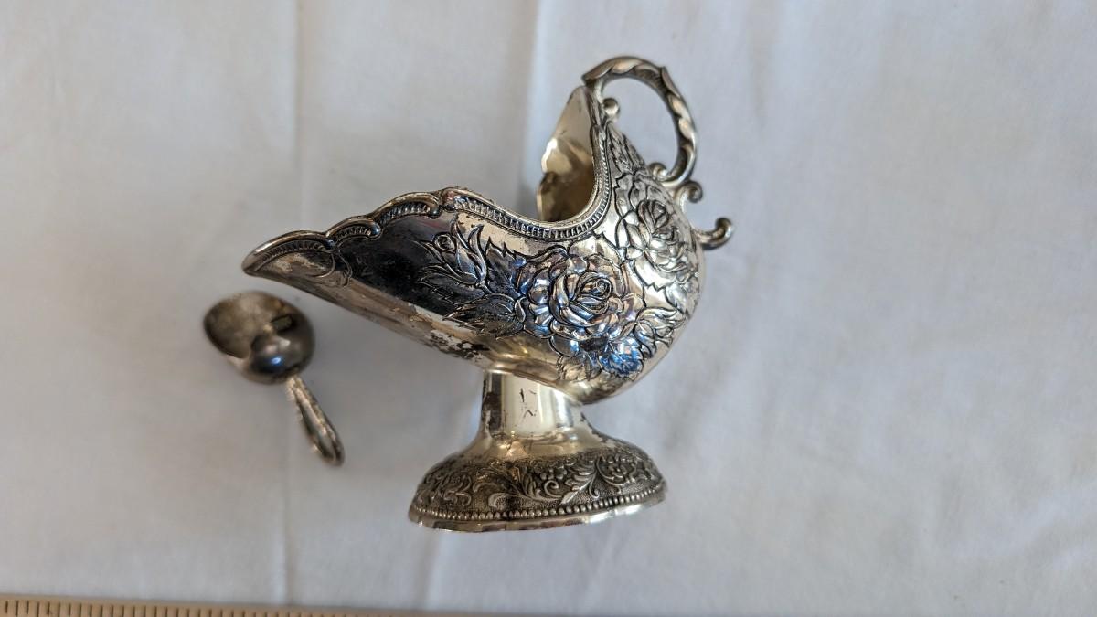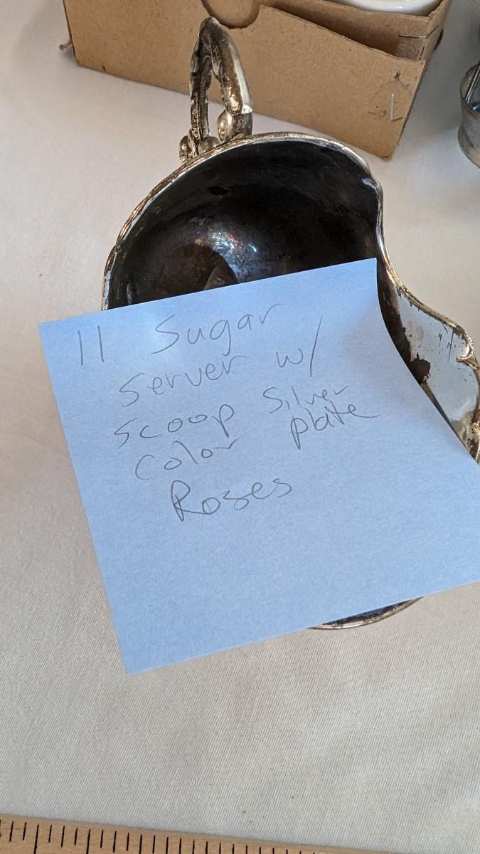 This is a nice silverplated sugar scuttle serving dish in the shape of a scoop with a little serving scoop. There are rose decorations. There is some corrosion.