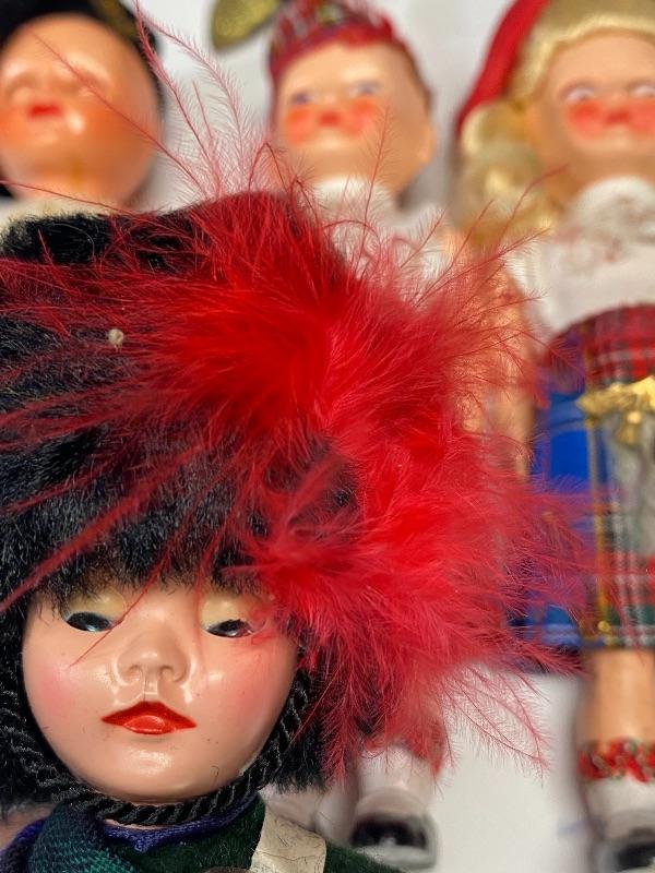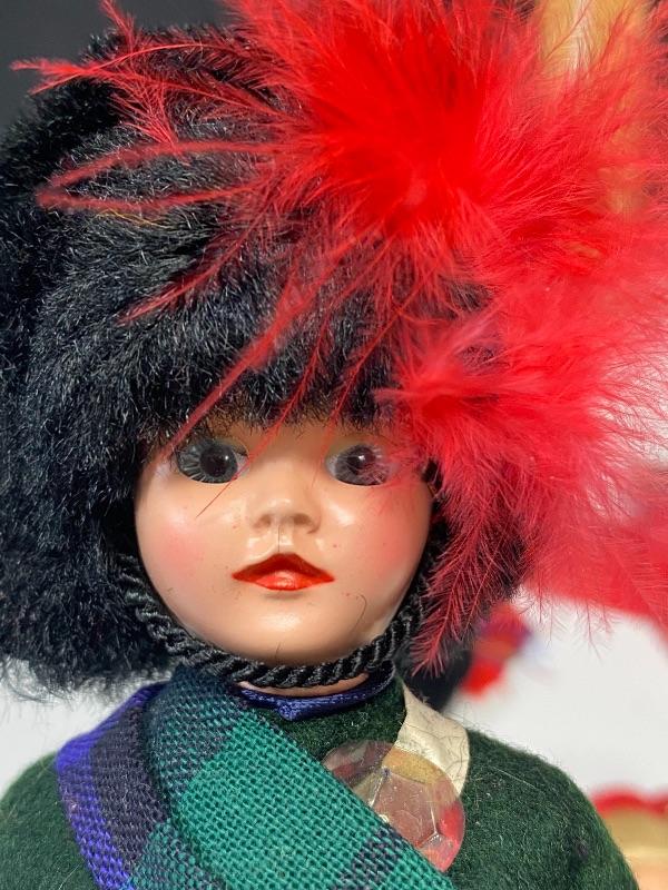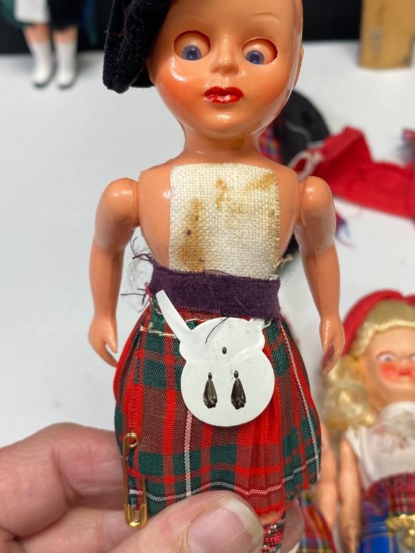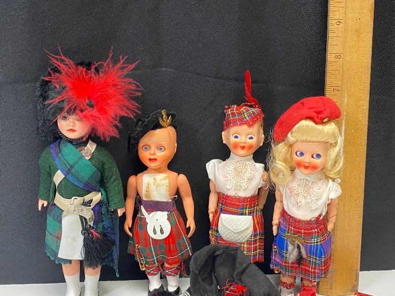 Set of 4 Scottish styled celluloid dolls. 3 seem to be very similar. They have creepy looking sleep eyes, one is marked Rogark Made in Wales. Other two are probably the same. The 4th doll is a bit different, taller, not as creepy. All are in various vintage conditions. The smaller ones have their jackets, why they didn't have them on unknown, left as received.