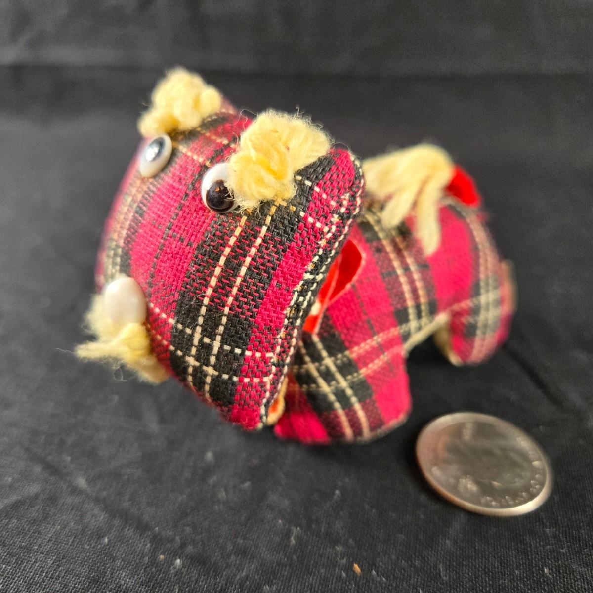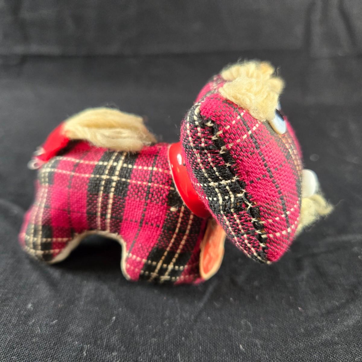This auction lot is for a Vintage Scotty Dog Pin Cushion & Tape Measure. It is marked Japan. The tail is a retracting tape measure that still works. His collar tag is still attached. It measures about 3.5-inches long x 2.5-inches tall. What a wonderful sewing collectible. Too cute!