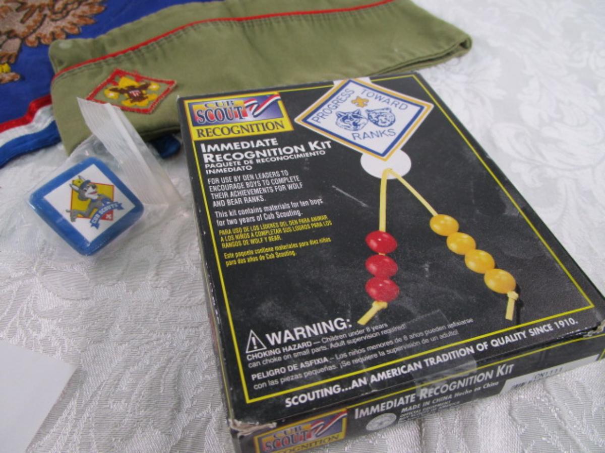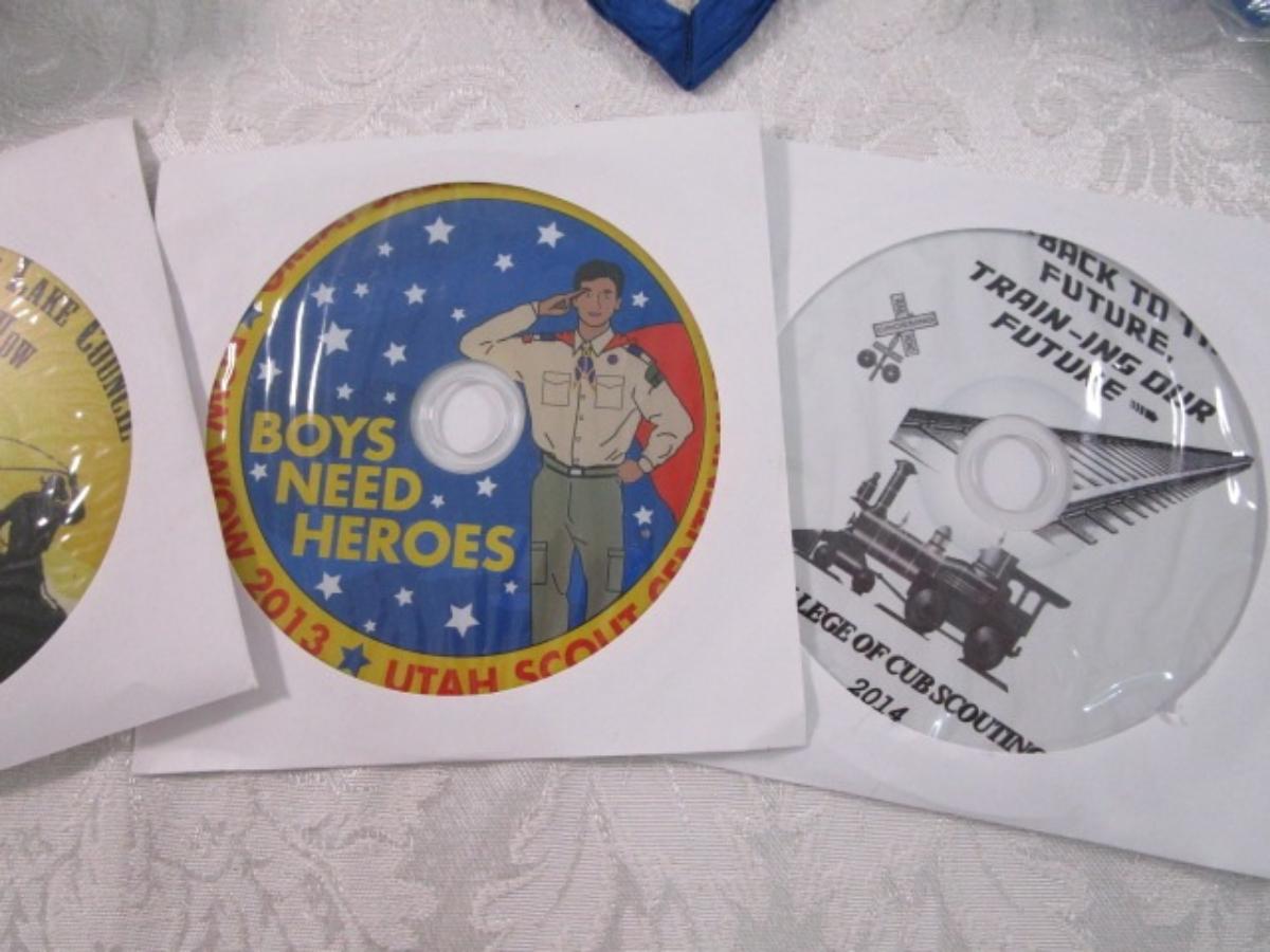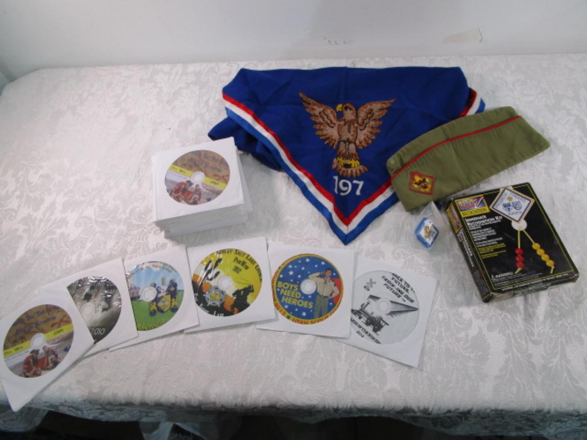 Hat is 7-7-1/8, box of recognition beads, neckerchief slide, Great Salt Lake Council PowWow CDs (2009-2 CDs, 2010-13 CDs, 2011-2 CDs, 2012-8 CDs, 2013-5 CDs, 2014-1 CD)