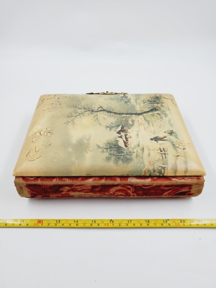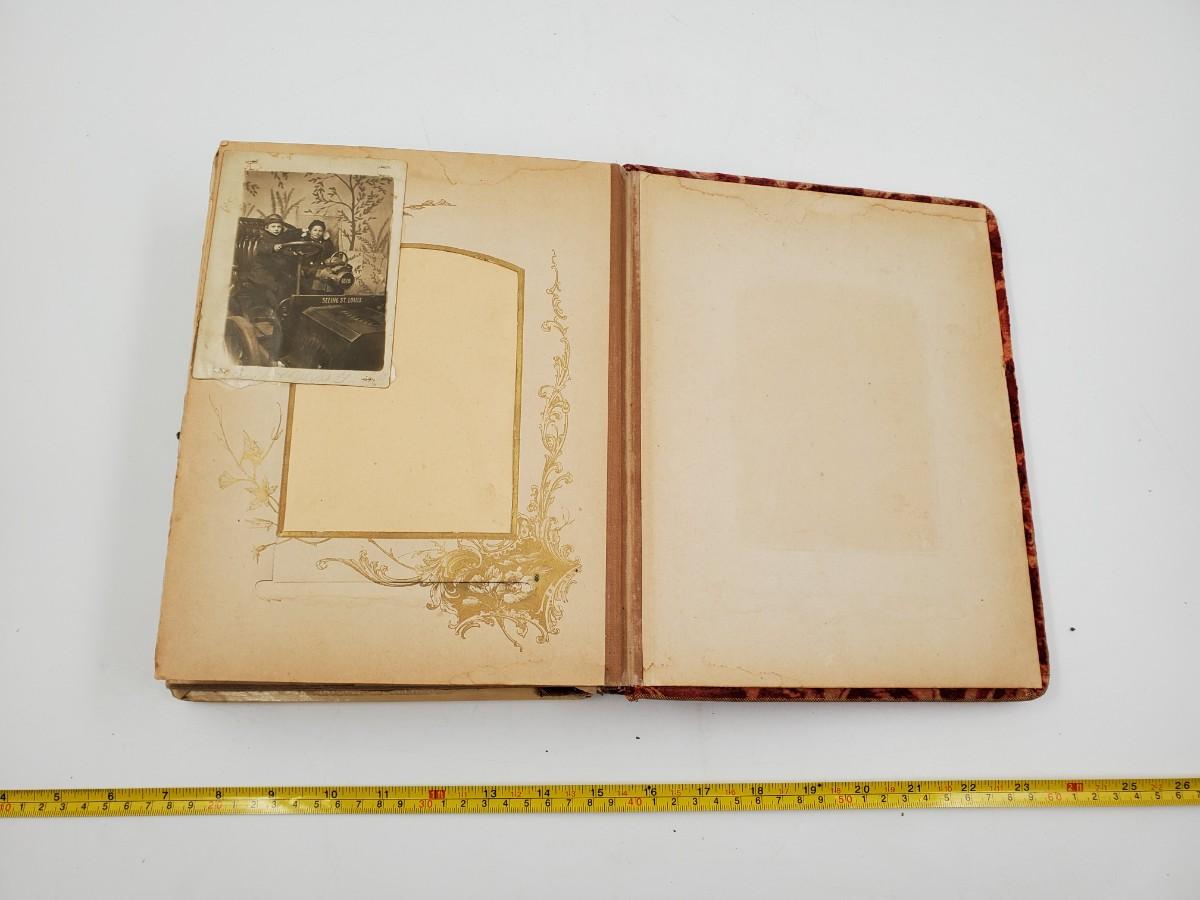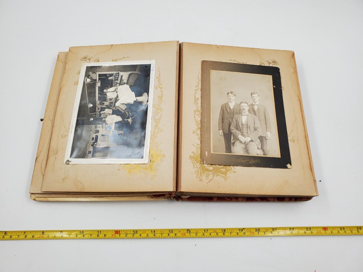 Very cool hardback scrapbook with old photos included. The book is coming apart in areas and the velvety material has been rubbed off from wewr over the years, see photos. Very neat piece of history!!