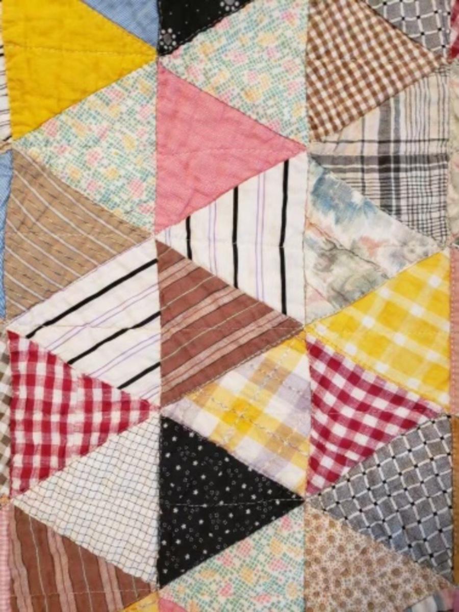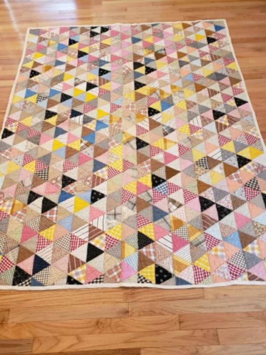 Vintage scrappy triangle quilt. Hand pieced machine quilted.  good condition. 62 x 81