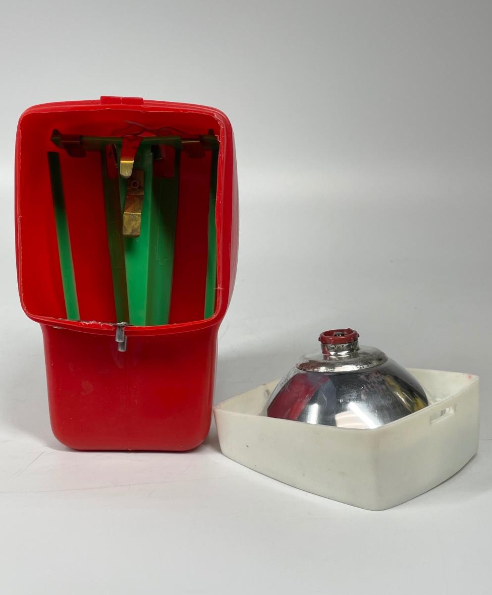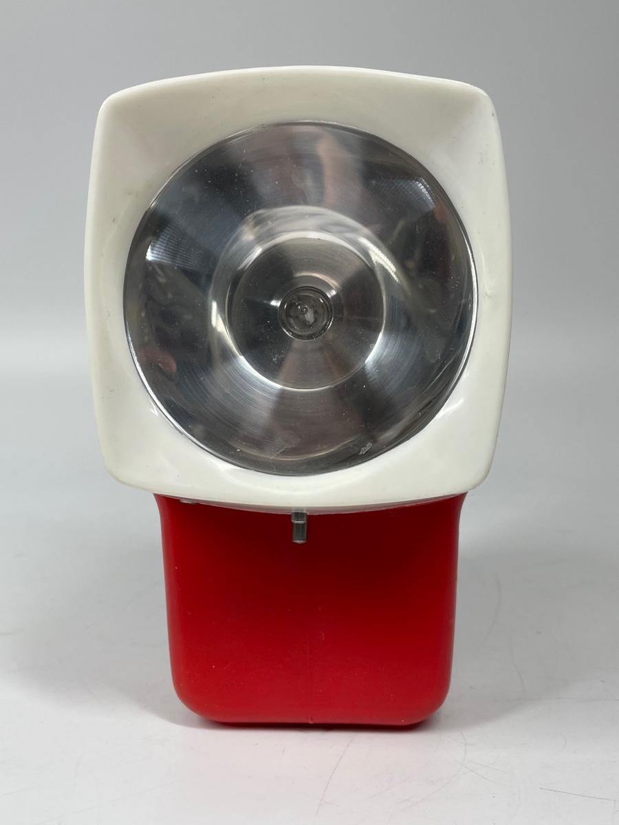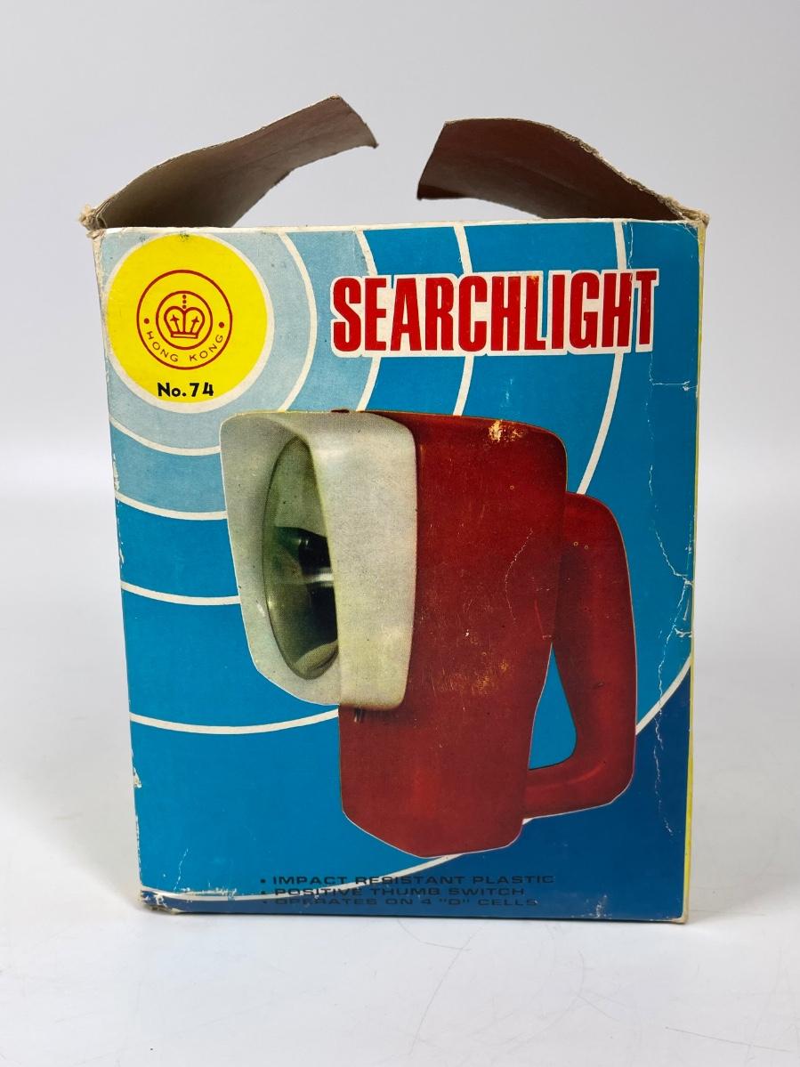 This item is in good condition. It needs batteries in order to be used. The searchlight operates on 4 “D” cells. It is impact resistant plastic and turns on with a thumb switch. The box it comes in is worn out.